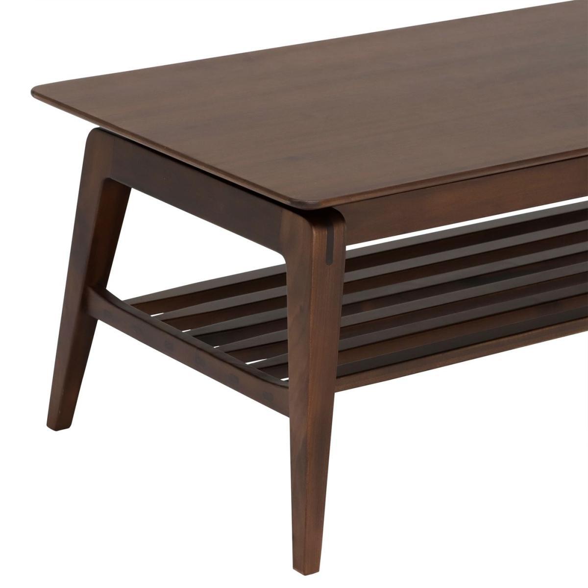 I love this coffee table because of its clean lines and mid-century modern vibe, making it a versatile piece for many interiors. It works particularly well in both contemporary and vintage-inspired living spaces, thanks to its warm wood tone and functional design. For styling, consider layering with your favourite books, a small tray for essentials, or a vase of fresh flowers to add warmth and personality. Its lower shelf is perfect for storing magazines or more casual accessories, helping keep the surface clutter-free. Overall, it’s a practical yet stylish choice that anchors a seating area without overwhelming the space.