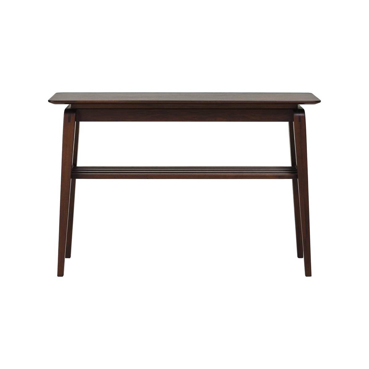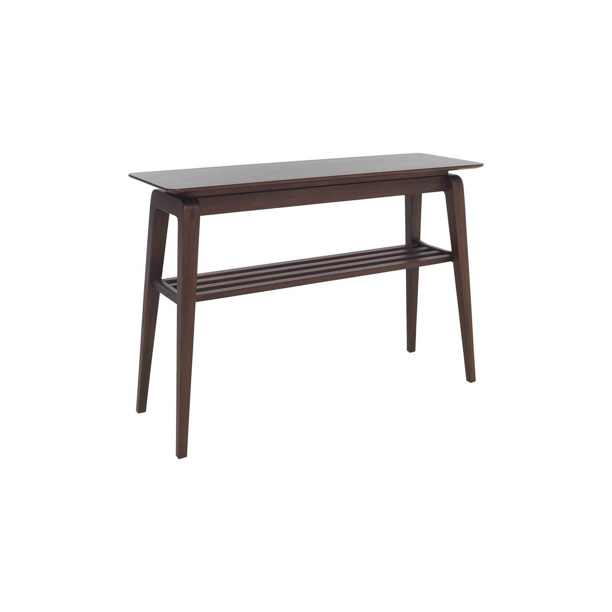Displaying shiny surfaces and an elegant, slim design, the Ercol Lugo console table makes a stunning impression in any hall or entryway. Combining clean lines with curves, it hints at both contemporary and retro influence. Built from sturdy solid wood, the table features a dark stained finish for a rich, polished look. With room for shoes underneath and a handy slatted shelf to hold those grab-and-go items, Lugo is an ideal way to bring storage space to smaller areas. Matching tables and chairs also available.