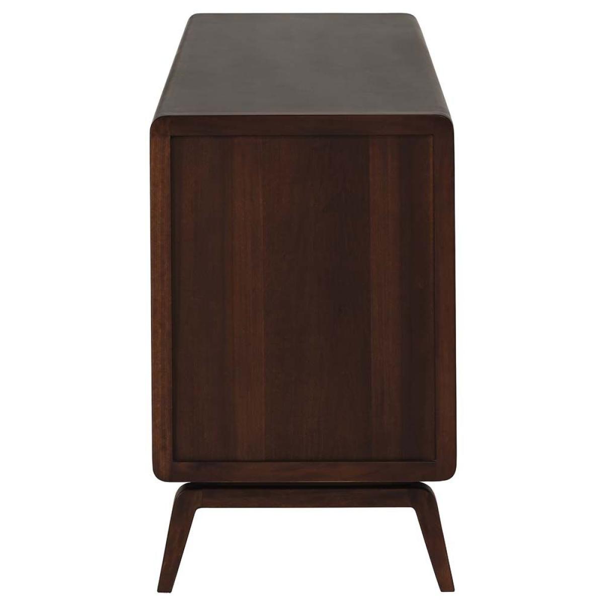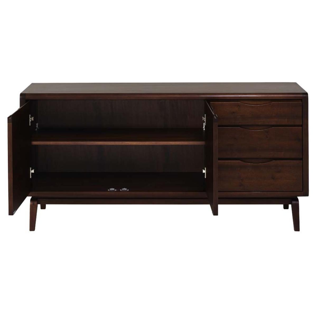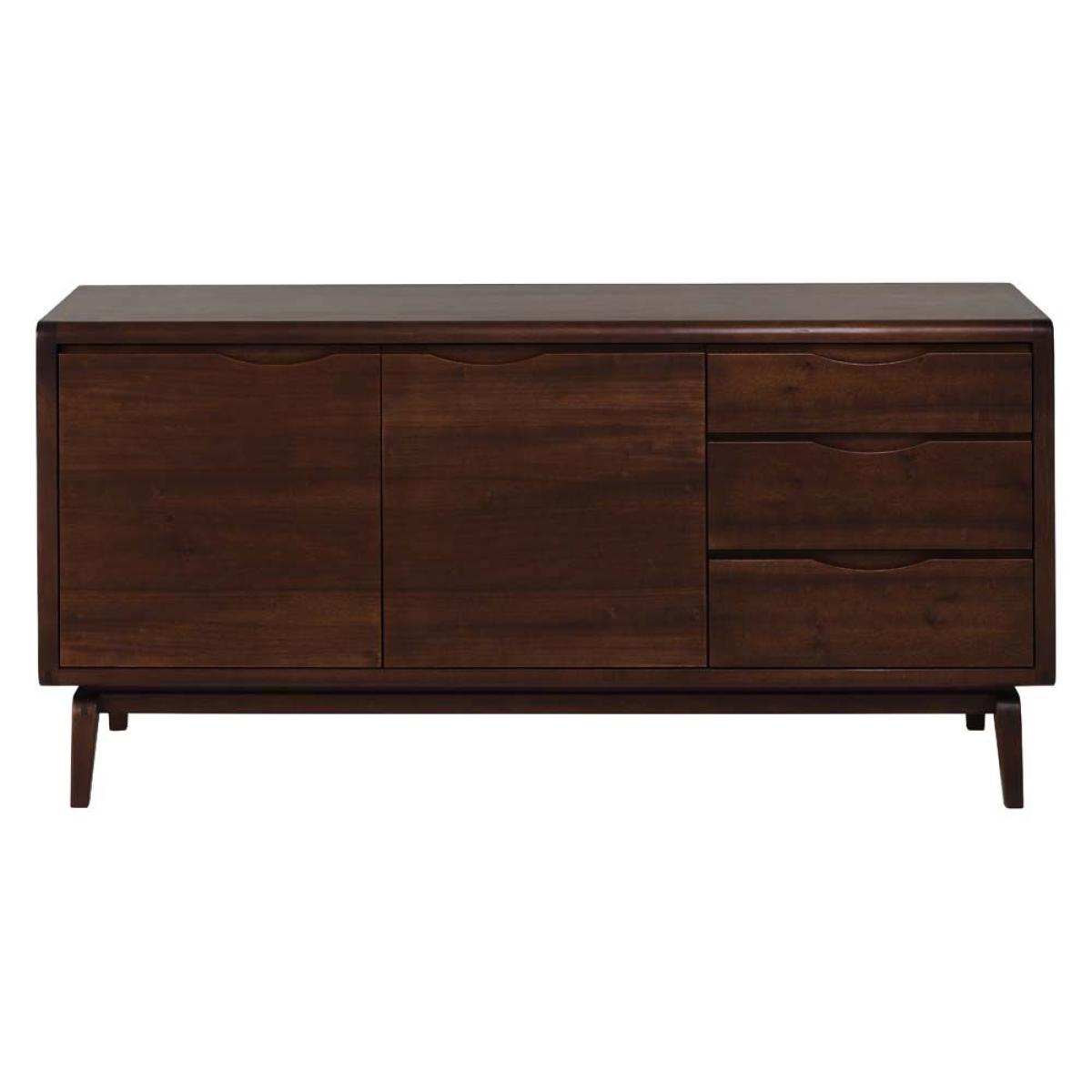 This modern design sideboard is defined by its slim tapered legs, rounded profiled frame and flush drawers and doors, characteristic of the mid-century Scandi style of the Lugo collection. Crafted from solid tulipwood and with a deep, rich toned matt lacquer, this timeless large sideboard has plenty of storage space, with a double door cupboard with an adjustable shelf. The door and drawer handles are crafted into the solid wood to create smooth and tactile drawer pulls, all of which have soft-close mechanisms for added convenience.
