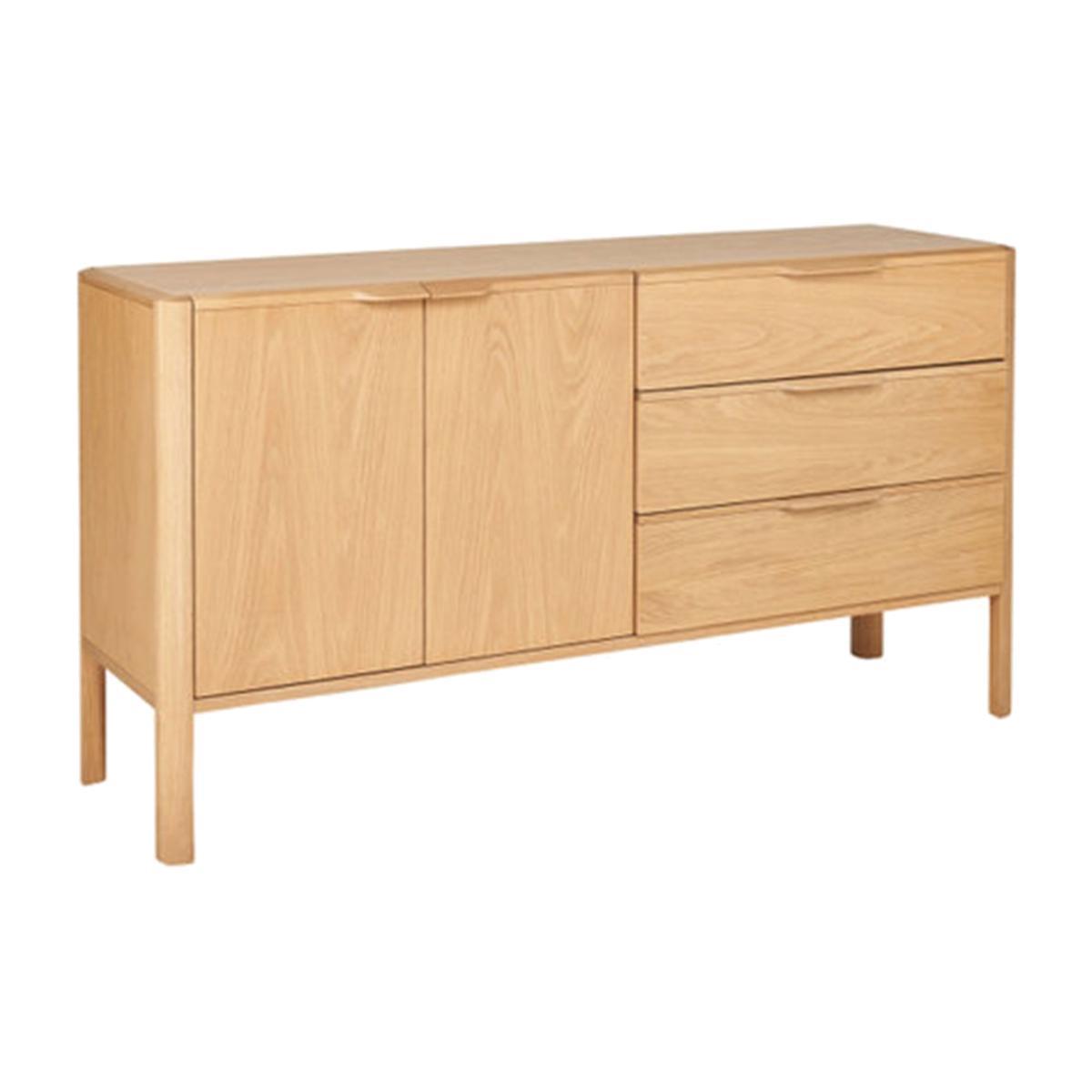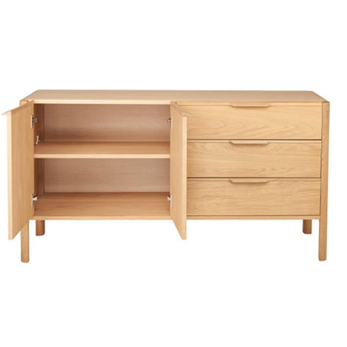 Design. A practical piece with plenty of personality, the Ercol Mia Wide Sideboard offers generous storage space, with a large cupboard and three drawers, each with thinly curved handles for easy opening. This sideboard is made entirely of solid oak with a dead matt finish, allowing the simplistic design to truly shine. Mia will match natural and modern décor, and will allow your accessories to stand out.