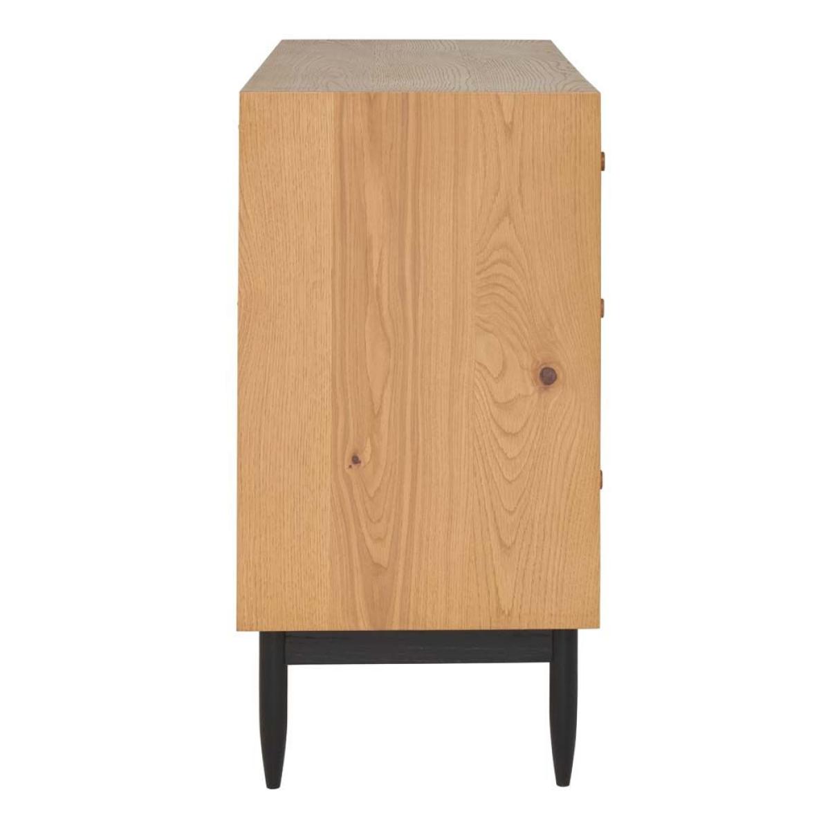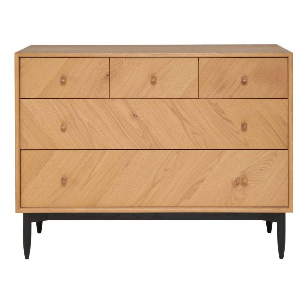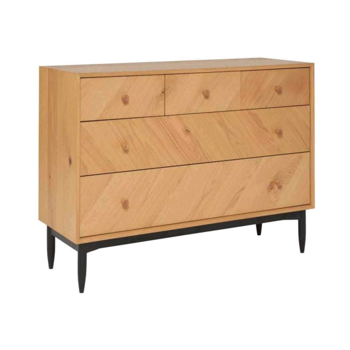 The Monza 5 drawer wide chest is a practical piece for all of your needs. The stunning feature of the chevron pattern is displayed across the 5 drawer fronts and the patina oak is finished in a clear matt lacquer to display the grain beautifully. With a deep and capacious bottom drawer for your larger pieces of clothing up to the smaller 3 drawers at the top perfect to store your smaller garments. In keeping with the Monza range the drawers are sat on tapered turned legs and plinth which are painted matt black.