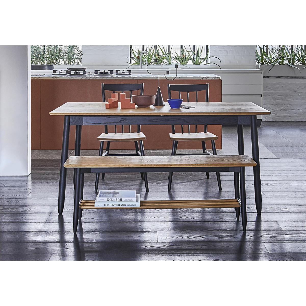 Ercol’s versatile dining bench saves space in a smaller dining room and looks fabulous in a hallway or kitchen with its contrasting oak and black-painted finish and neat spindled shelf. Why you’ll love it. Contemporary oak dining bench designed and made by Ercol. Industrial cool meets Scandi style. Textured oak veneer seat with gently curved edges. Oak frame and legs painted black. Handy lower shelf with 3 light oak spindles. A versatile and space-saving alternative to dining chairs. Creativity and craftsmanship from a great British brand. What you need to know. Made from solid oak and oak veneer. Finished in a clear matt lacquer. Seats 2 adults. Wood has natural markings, knots and colour variations. Looks fantastic with the range’s extending dining tables. Monza is also available as a bedroom furniture collection.