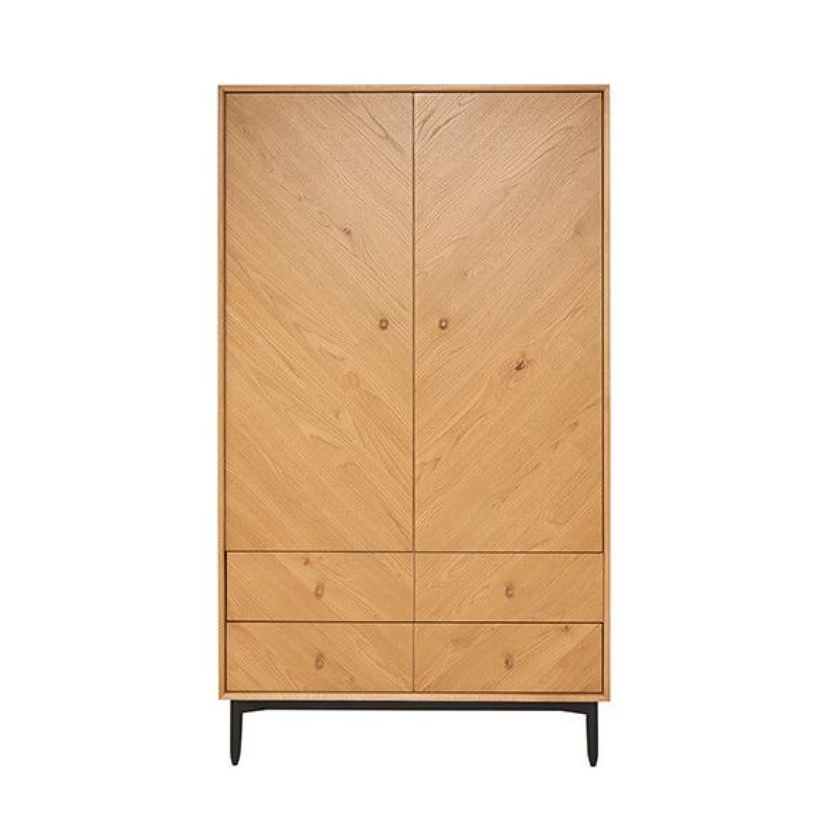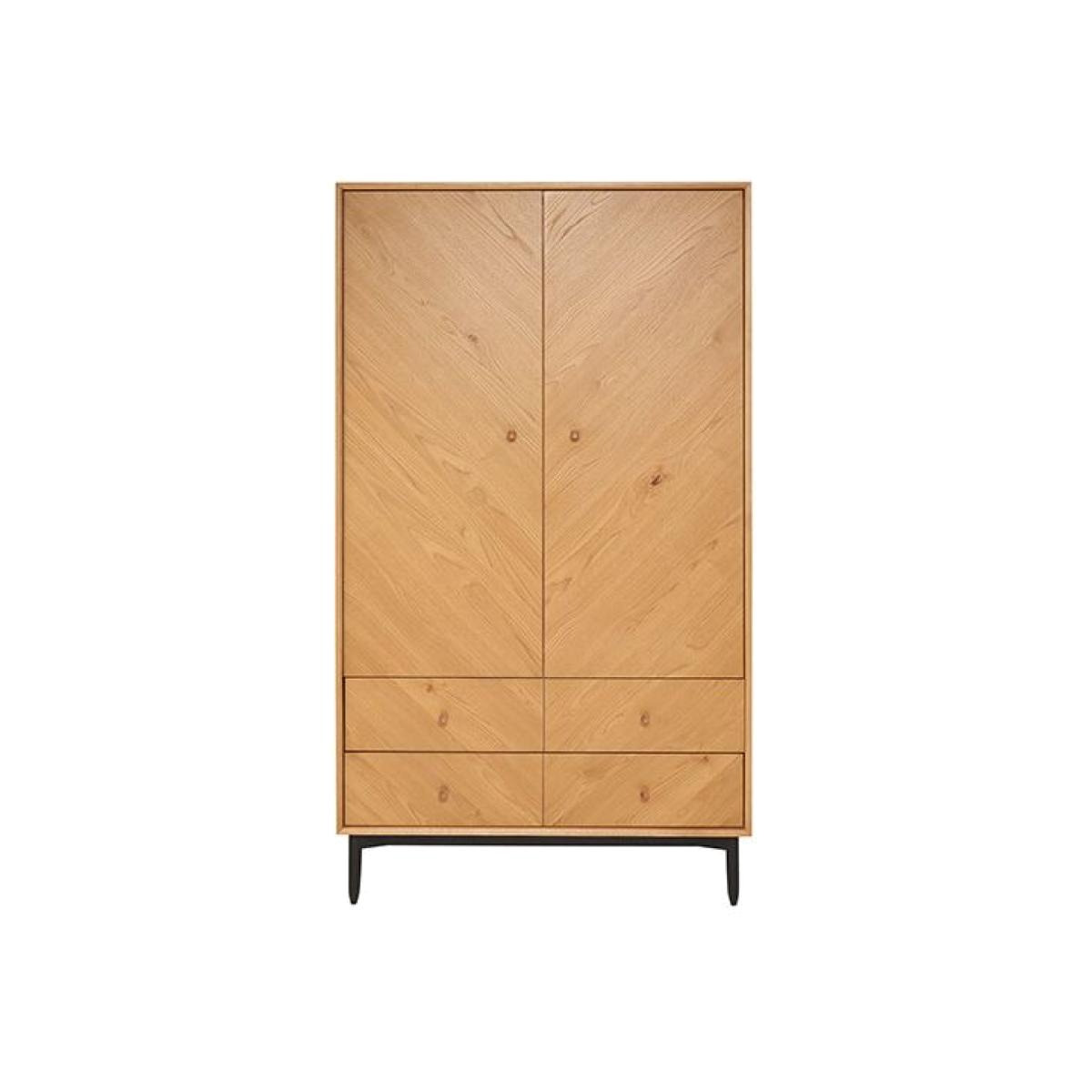 The Monza double wardrobe is a contemporary update of a classic design. The alternating grain direction of the chevron pattern creates a stunning feature on the robe doors. This sits on 4 drawers which are on wooden runners and have a turned wooden handle. The cupboard section contains a single wooden hanging rail across the top and the drawers have a fixed wooden seperator in the centre of each drawer.  The elegant undercut detail framing the doors and drawers finishes off this eyecatching bedroom wardrobe. Features: Dimensions: 193cm H x 110cm W x 60cm Includes hanging rail and 4 drawers Solid & veneered oak Assembly required