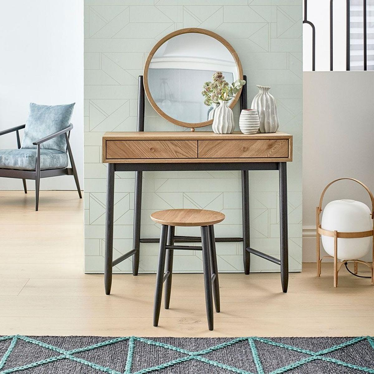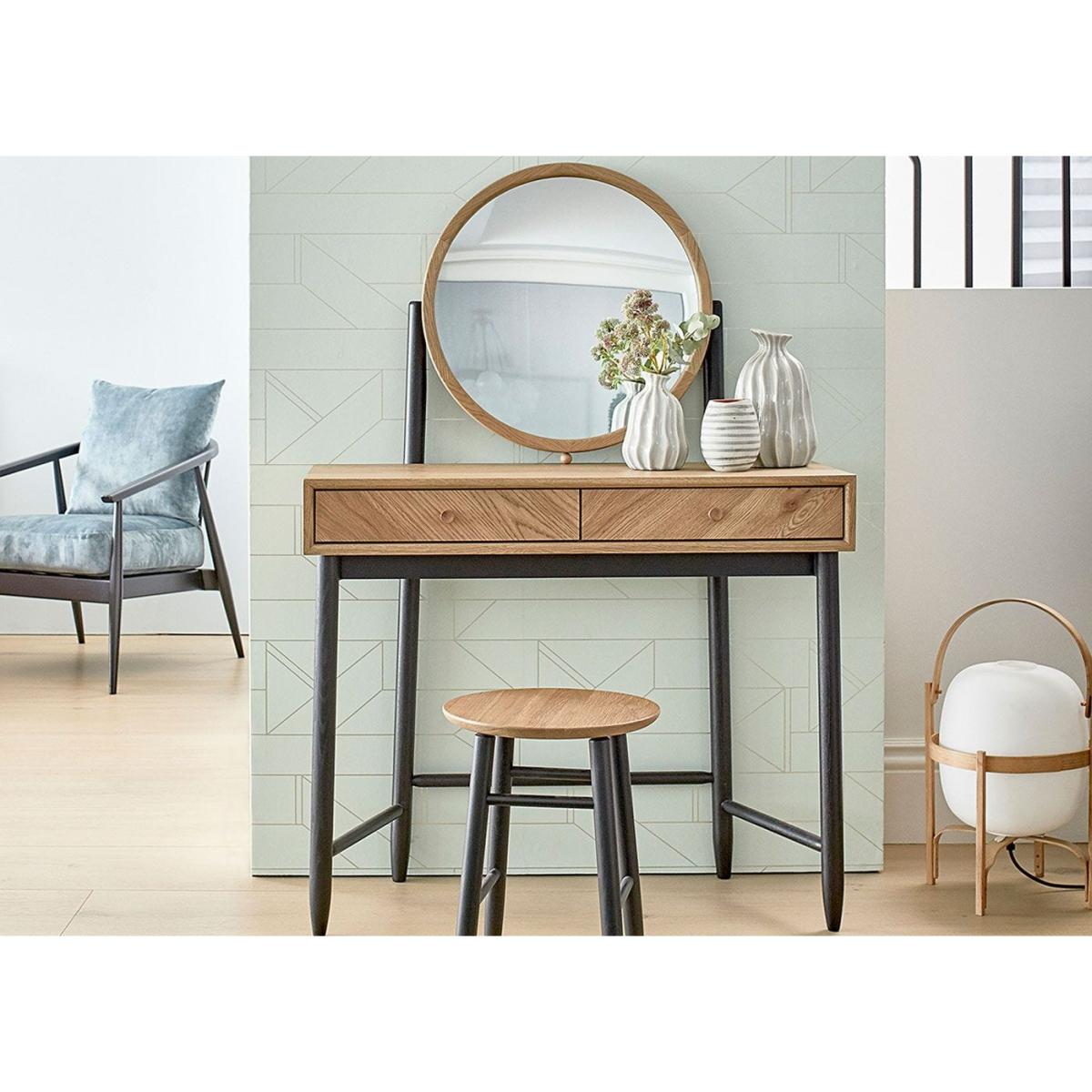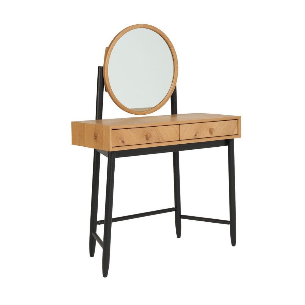 The beautifully crafted Monza dressing table riffs on classic mid-century design to deliver a charming addition to the bedroom. Constructed in solid patina oak with contrasting black turned, tapered legs, this contemporary piece is finished with a clear matt lacquer to accentuate its elegance and tactility. Impressive in its practicality, the dresser's right hand side drawer features an internal fixed vanity drawer divider that's split into six clever compartments for jewellery and cosmetic storage. The classic round mirror makes an immediate statement, whilst providing a functional space to get ready.