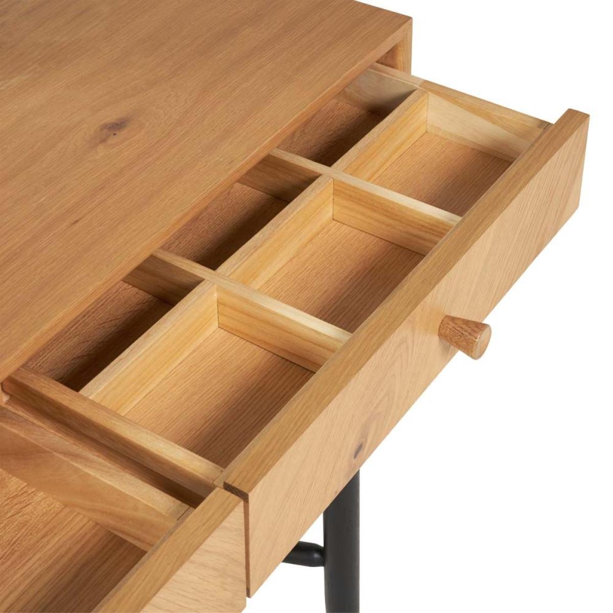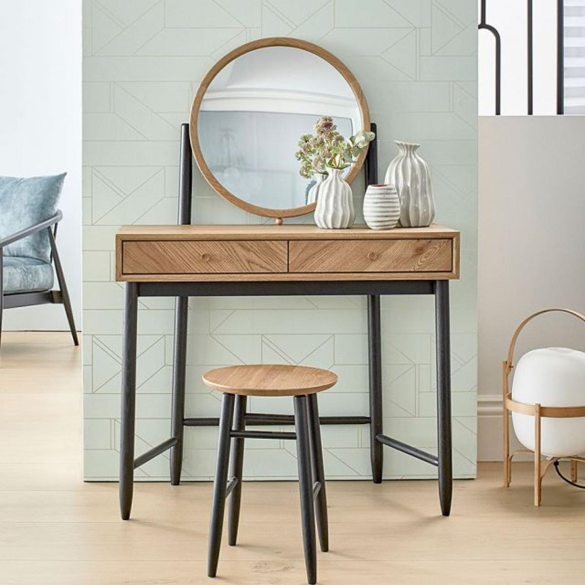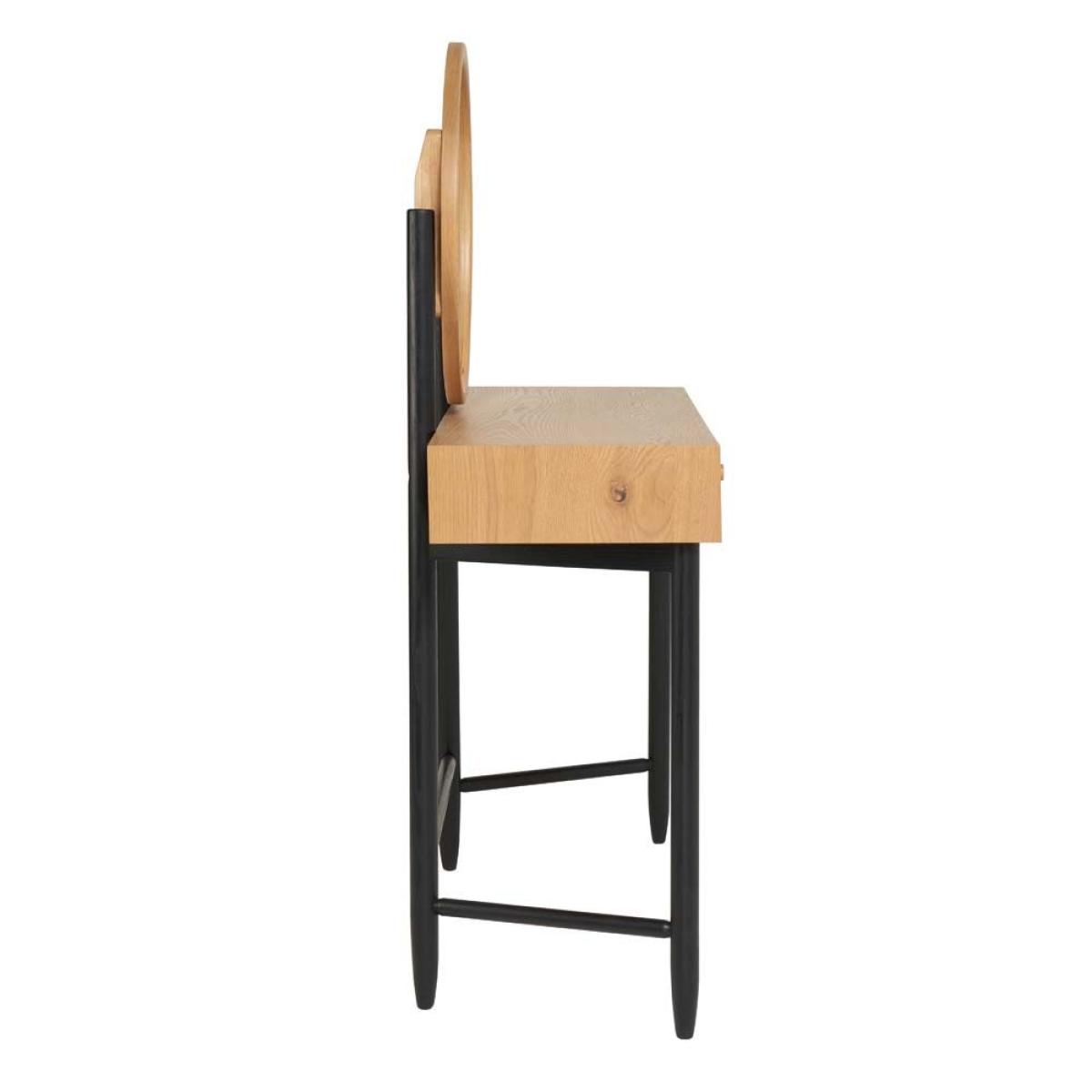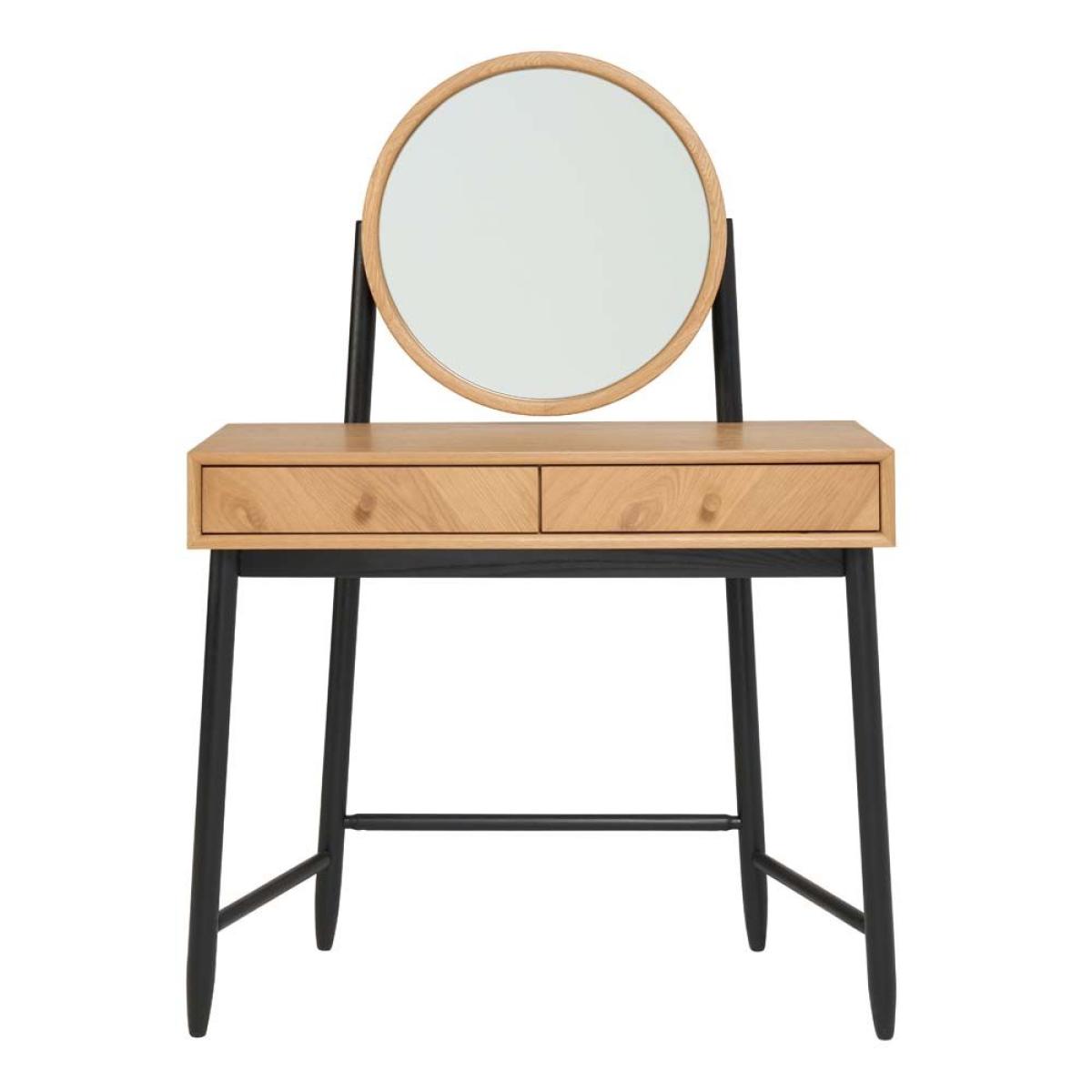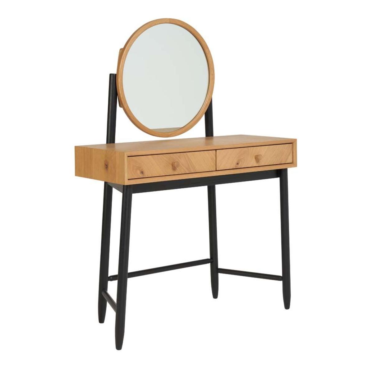 The statement Monza dressing table would be an eye catching piece in any bedroom with the patina oak and matt black turned legs all finished in a clear matt laquer. There is a fashionable round mirror attached to the table held up by wooden struts painted in matt black. It is a practical dressing table as the right hand side drawer has a fixed vanity drawer divider inside that is split into 6 compartments to keep all of your precious jewellery separate and safe. Solid and veneered oak. Mirror included6 Jewellery compartmentsH137cm x W96cm x D45cm. Simple self assembly