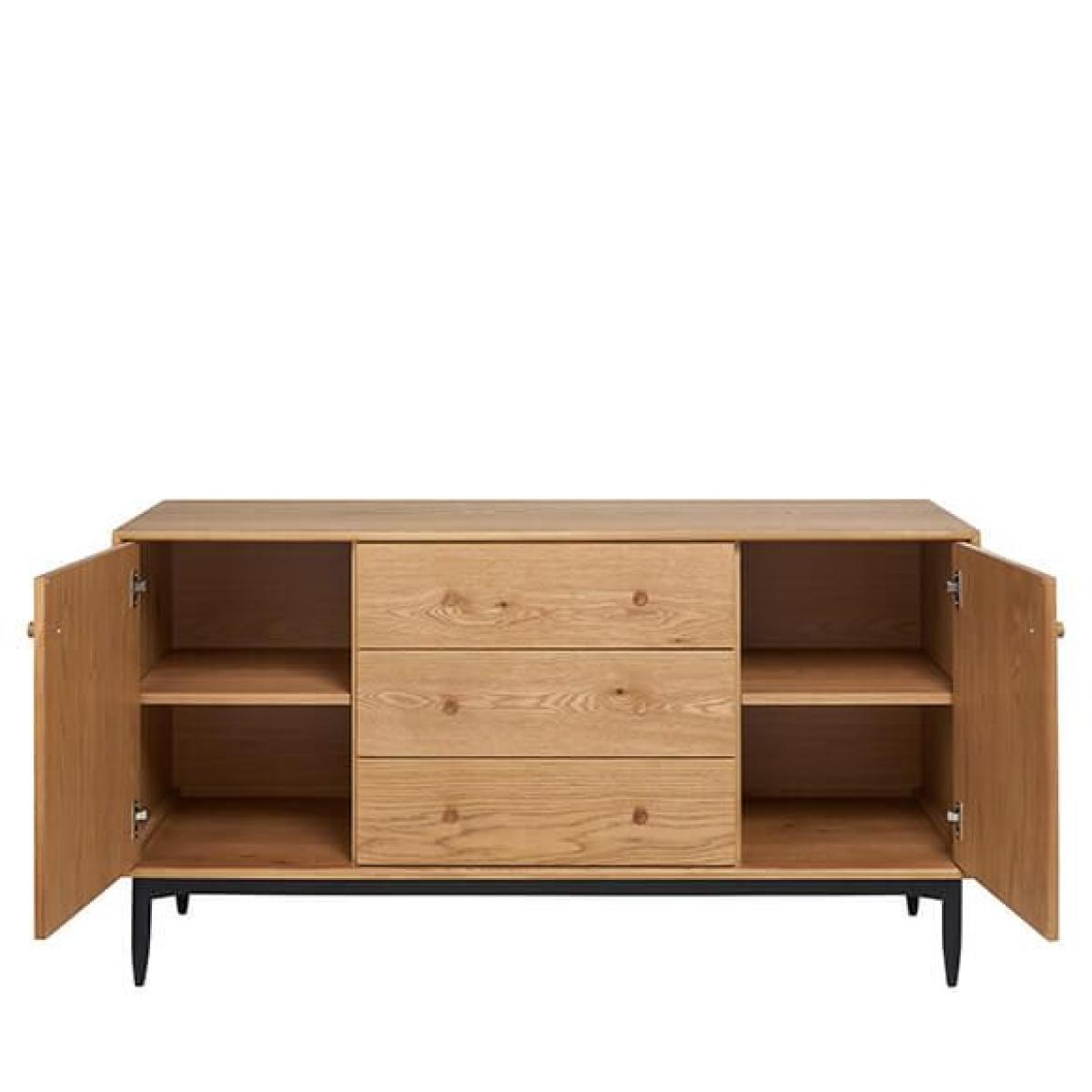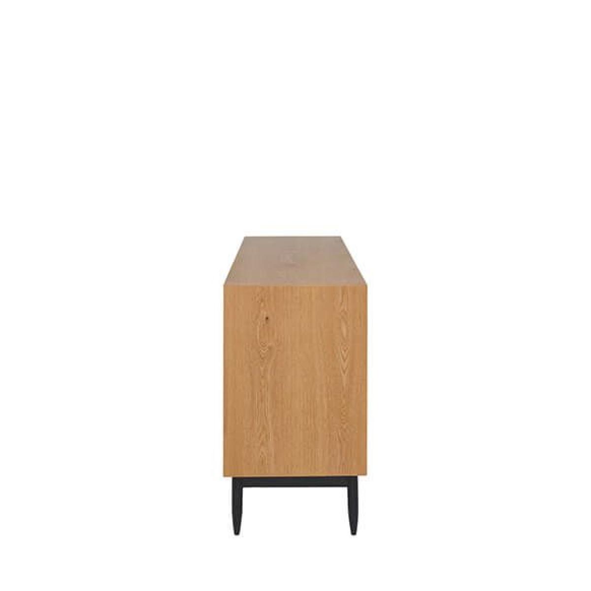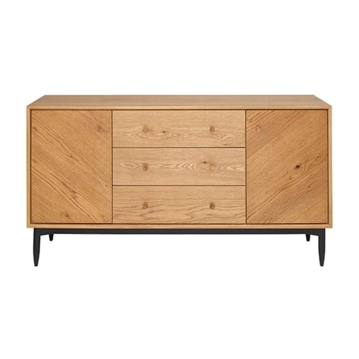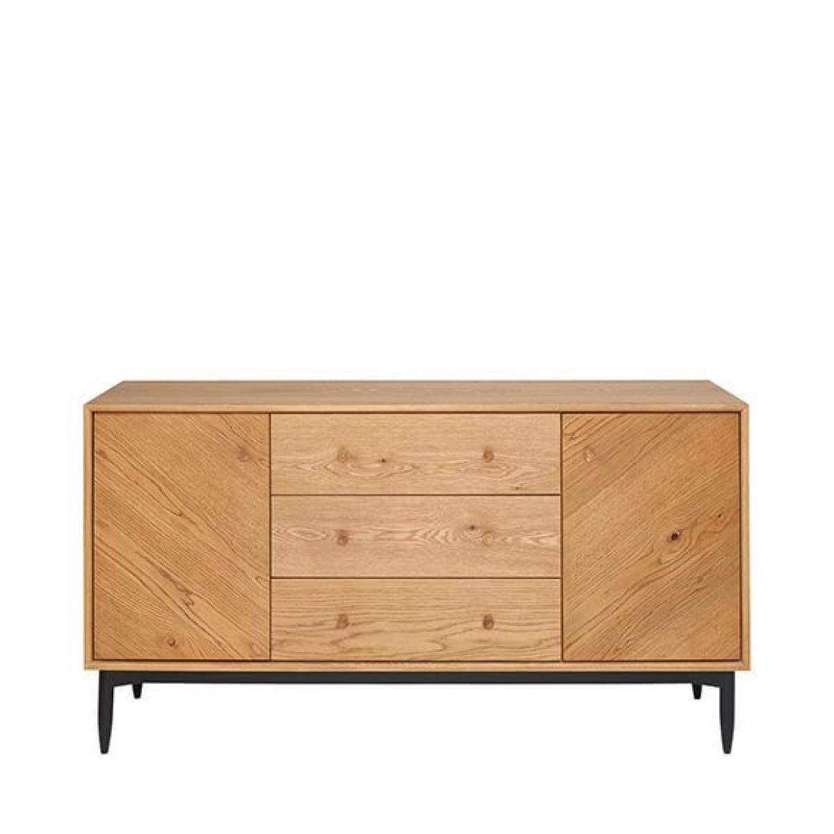 The Monza large sideboard is both functional and stylish. The stunning feature herringbone veneer oak pattern is displayed to its best advantage on the doors and drawers of this cabinet and show the character and tactility of the rustic oak. The rich patina oak is finished in a clear matt lacquer that highlights and protects the natural grain, the tapered black plinth and legs give a feel of lightness. Two cupboards with adjustable shelves and three capacious drawers provide plenty of storage, making the sideboard a very practical piece of furniture. Available in Patina Oak with legs in Black finish only. Dimensions W 150cm D 45cm H 80cm. Wood Solid and veneered oak. Country of origin China. Fully assembled. Wood finishes and colour samples are shown for guidance only as screen colours may vary.  However, wood is a natural material and varies in colour, grain and structure.