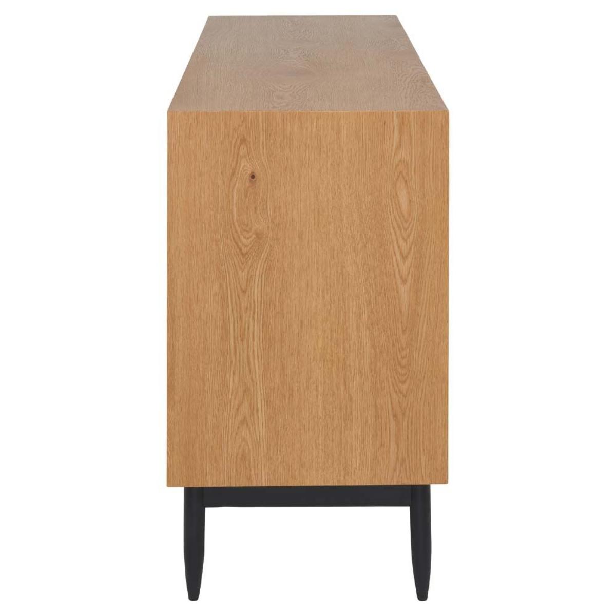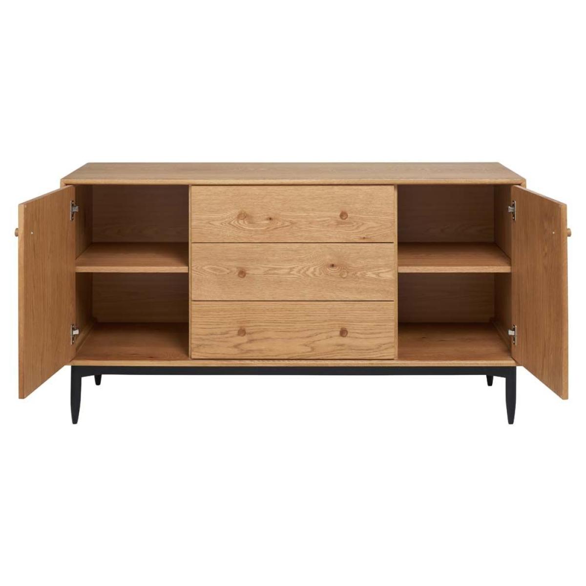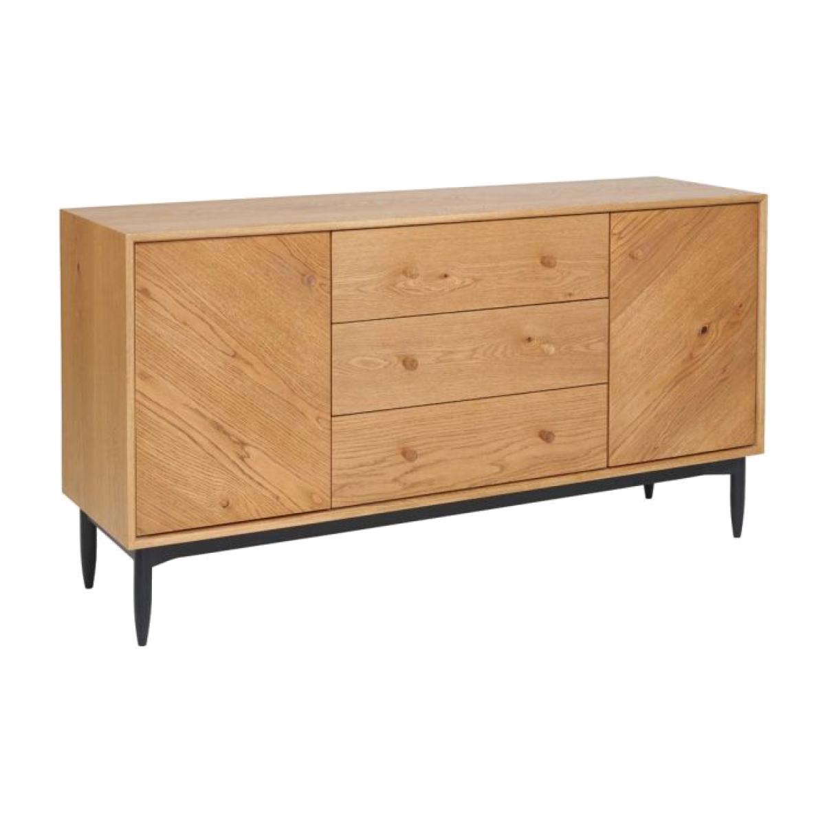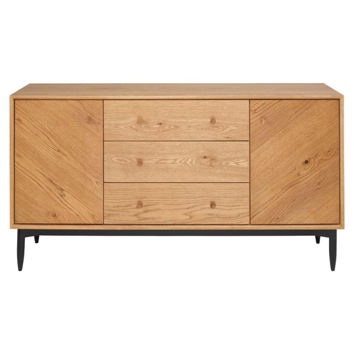 The Monza large sideboard is both functional and stylish. The stunning feature herringbone veneer oak pattern is displayed to its best advantage on the doors and drawers of this cabinet and show the character and tactility of the rustic oak. The rich patina oak is finished in a clear matt lacquer that highlights and protects the natural grain, the tapered black plinth and legs give a feel of lightness. Two cupboards with adjustable shelves and three capacious drawers provide plenty of storage, making the sideboard a very practical piece of furniture. Available in Patina Oak with legs in Black finish only. The Monza large sideboard is both functional and stylish. The stunning feature herringbone veneer oak pattern is displayed to its best advantage on the doors and drawers of this cabinet and show the character and tactility of the rustic oak. The rich patina oak is finished in a clear matt lacquer that highlights and protects the natural grain, the tapered black plinth and legs give a feel of lightness. Two cupboards with adjustable shelves and three capacious drawers provide plenty of storage, making the sideboard a very practical piece of furniture. Available in Patina Oak with legs in Black finish only.