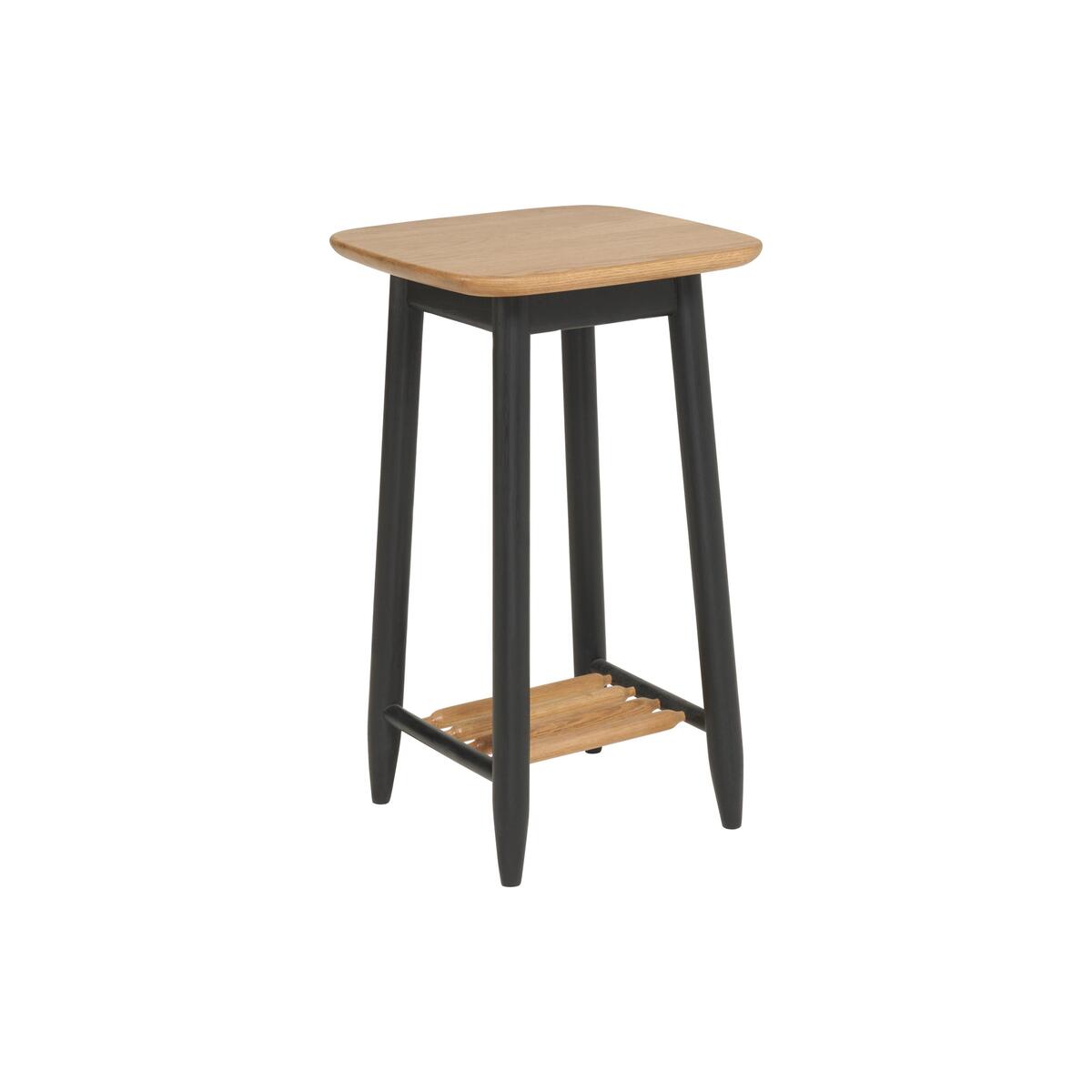 The perfect end table for a contemporary living space, this Ercol side table also makes a compact bedside table in a smaller bedroom. Clean and simple lines with a refined industrial finish. Why you'll love it. Contemporary oak lamp table designed and made by Ercol. Industrial cool meets Scandi style. Rustic brushed oak veneer table top with gently curved edges. Oak frame and turned legs painted black. Useful spindled shelf for books and magazines. Creativity and craftsmanship from a great British brand. What you need to know. Made from solid oak and oak veneer. Finished in a clear matt lacquer. Wood has natural markings, knots and colour variations. This range includes a matching lamp table, extending dining tables and a sideboard. Monza is also available as a bedroom furniture collection.
