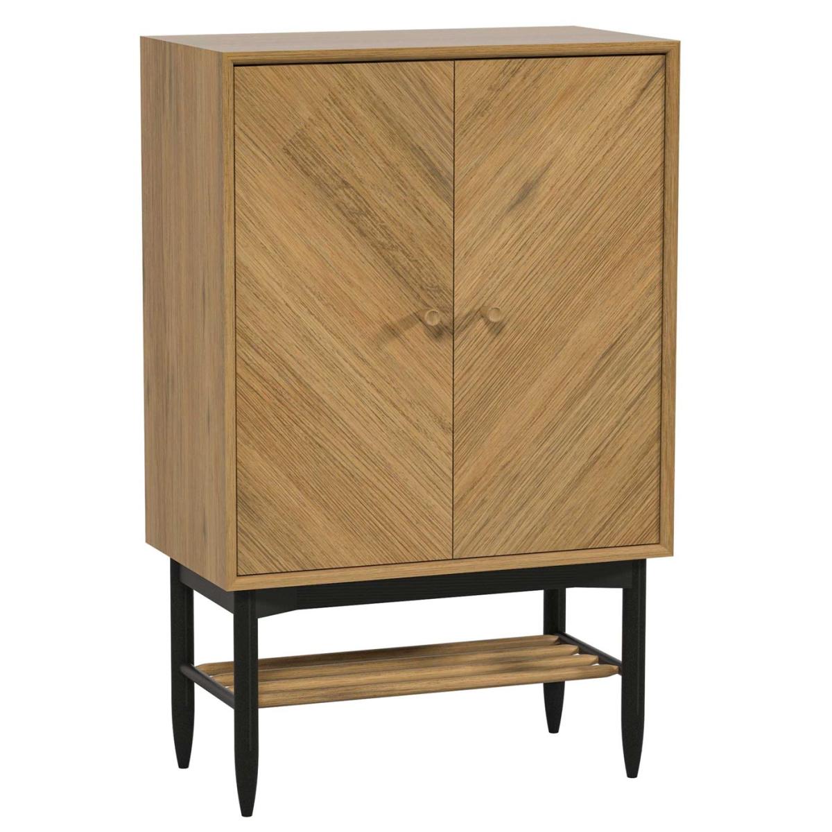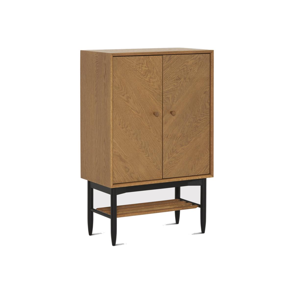 The Ercol Monza Universal Cabinet is a unique way to store your necessities. Made from solid oak, the woods natural grain creates a subtle chevron pattern between the doors to let this piece truly stand out. The light oak is contrasted with the black frame, finished with tapered ends, bringing a contemporary feel. Further featuring a slatted shelf, the Ercol Monza Cabinet is certainly eye catching and one of a kind!