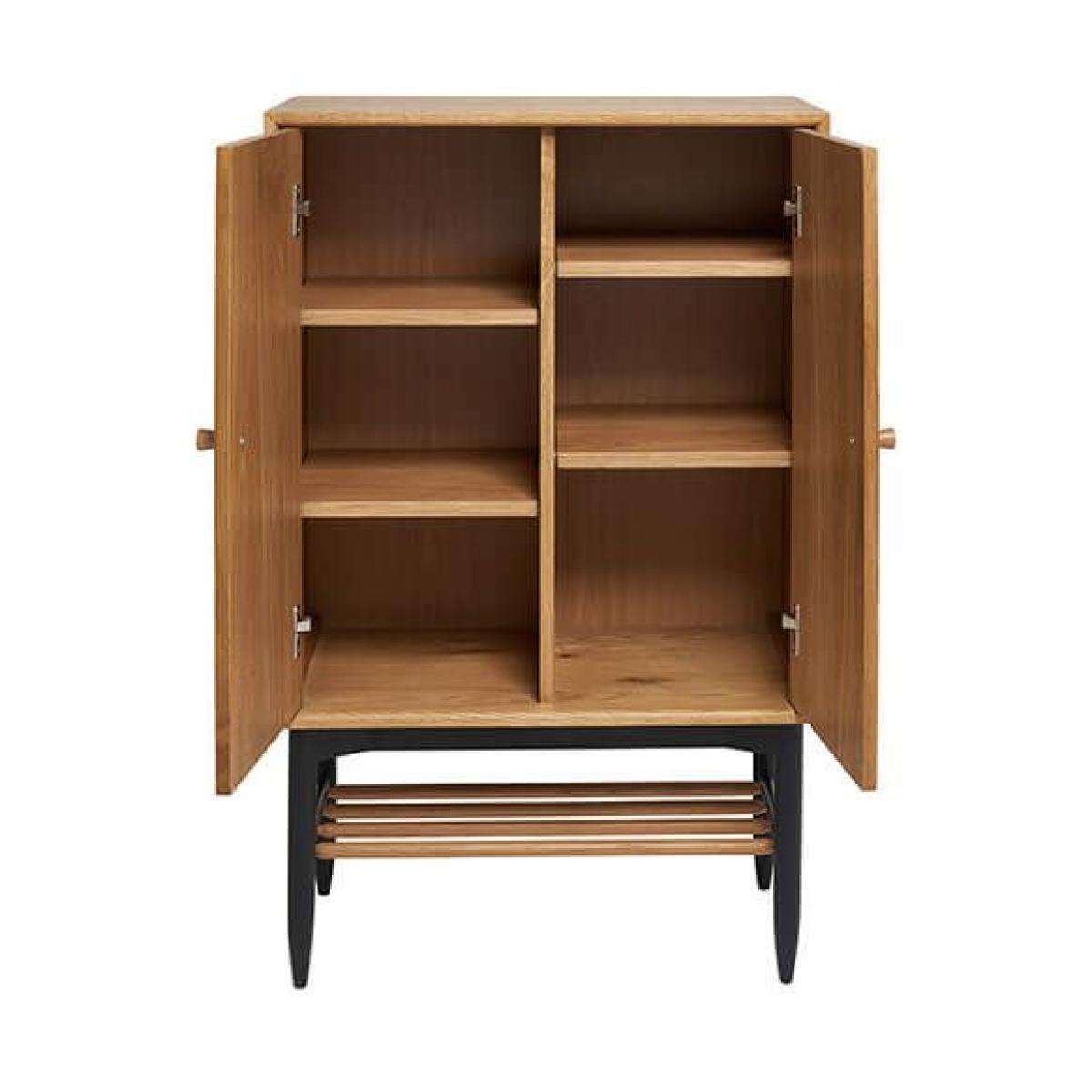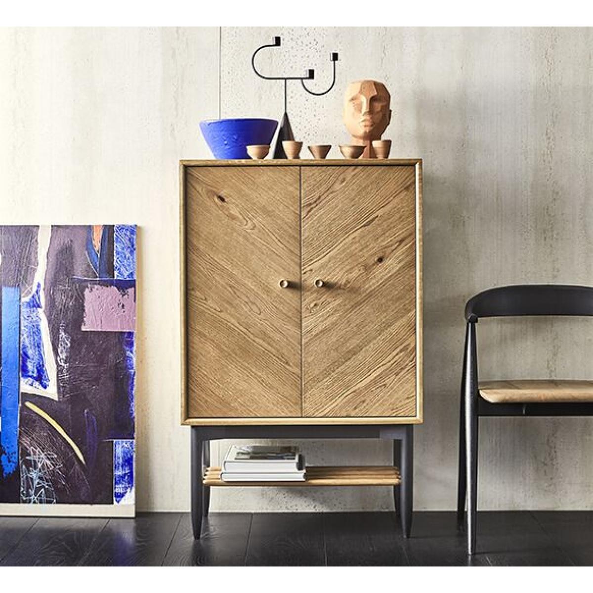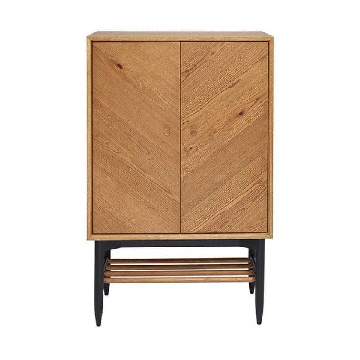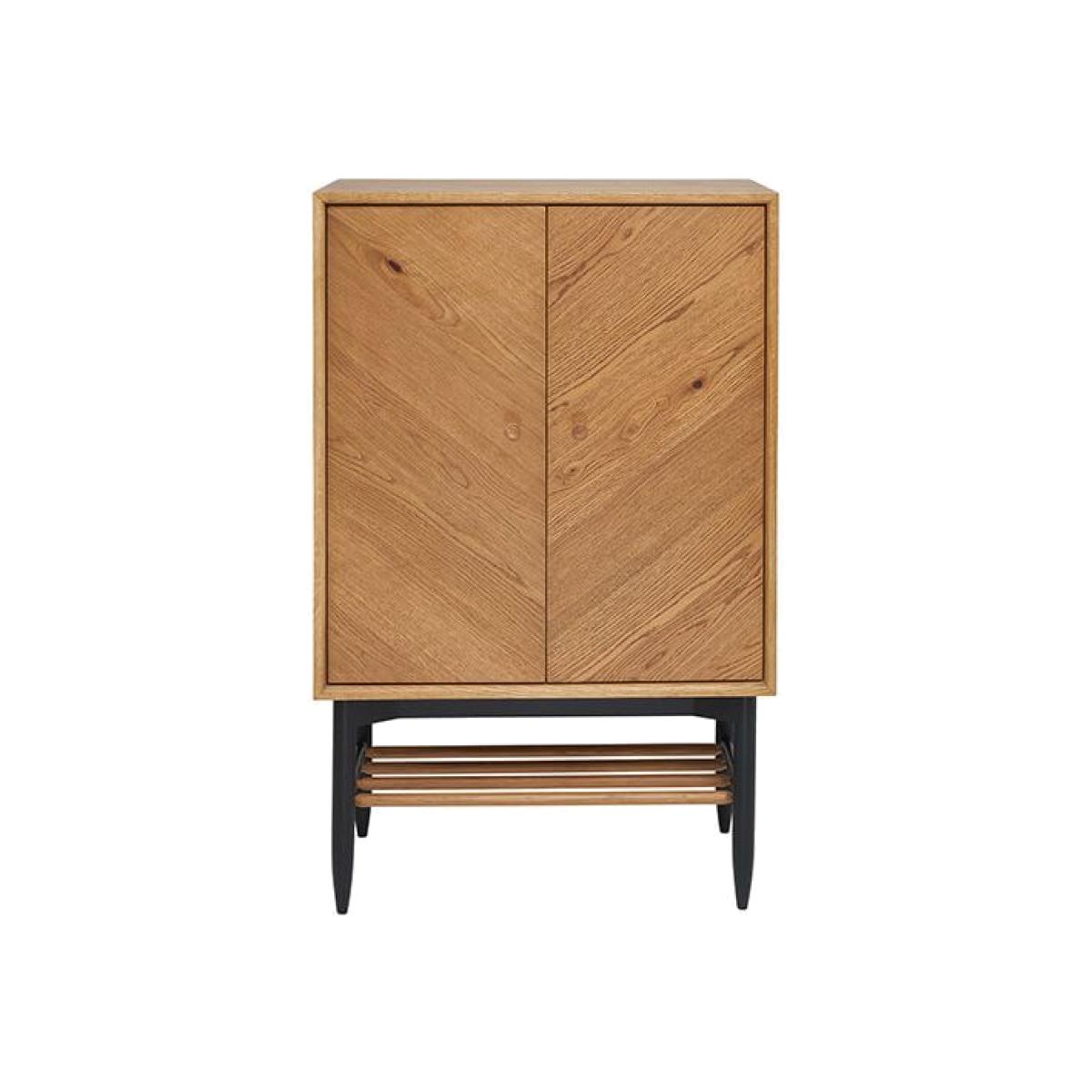 Storage is always needed in any home and the universal cabinet is a modern way of introducing storage into any room in the home, a smaller footprint and increased height makes it very practical for a modern home. The statement herringbone design of the alternating patina oak is seen to full effect on this piece making both eye-catching and practical finished in matt lacquer to protect the surface. Functionality is further enhanced by the two adjustable shelves and useful spindle shelf under the cabinet and framed by the elegant tapered black legs give a lightness of touch. Available in Patina Oak with legs in Black finish only. Dimensions W 70cm D 38cm H 110cm. Wood Solid and veneered oak. Country of origin China. Fully assembled. Wood finishes and colour samples are shown for guidance only as screen colours may vary. However, wood is a natural material and varies in colour, grain and structure.