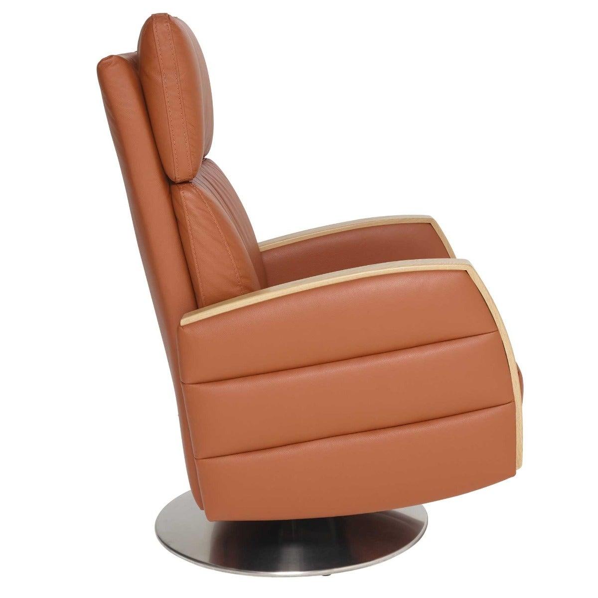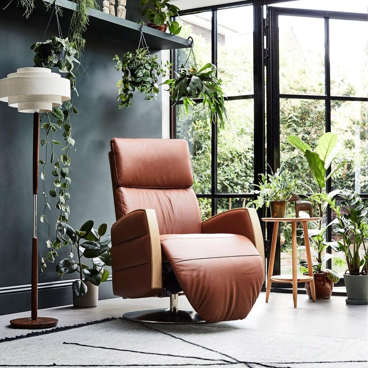 Design. Designed to. Maximise. Comfort, the. Ercol. Noto Leather Recliner Chair features an integrated head and. Footrest. Allowing you to totally rel. Ax in tranquility. The focus being to create a clean silhouette for a design. Conscious. Lifestyle,. This recliner chair is simple and elegant. W. Ith modern detailing such as the horizontal lines on the. Side. And metal circular base. Then. A more inviting, warmth from the solid oak arms. , it suits a wide range of settings. Also available in. A choice of fabrics, explore the whole range and decide what suits your interior style most.