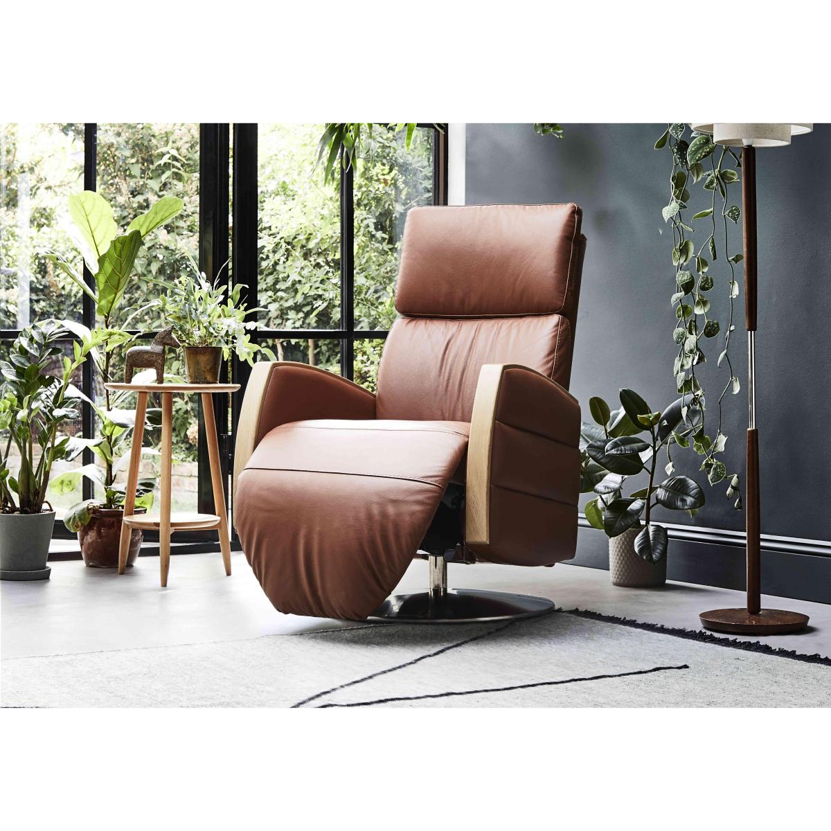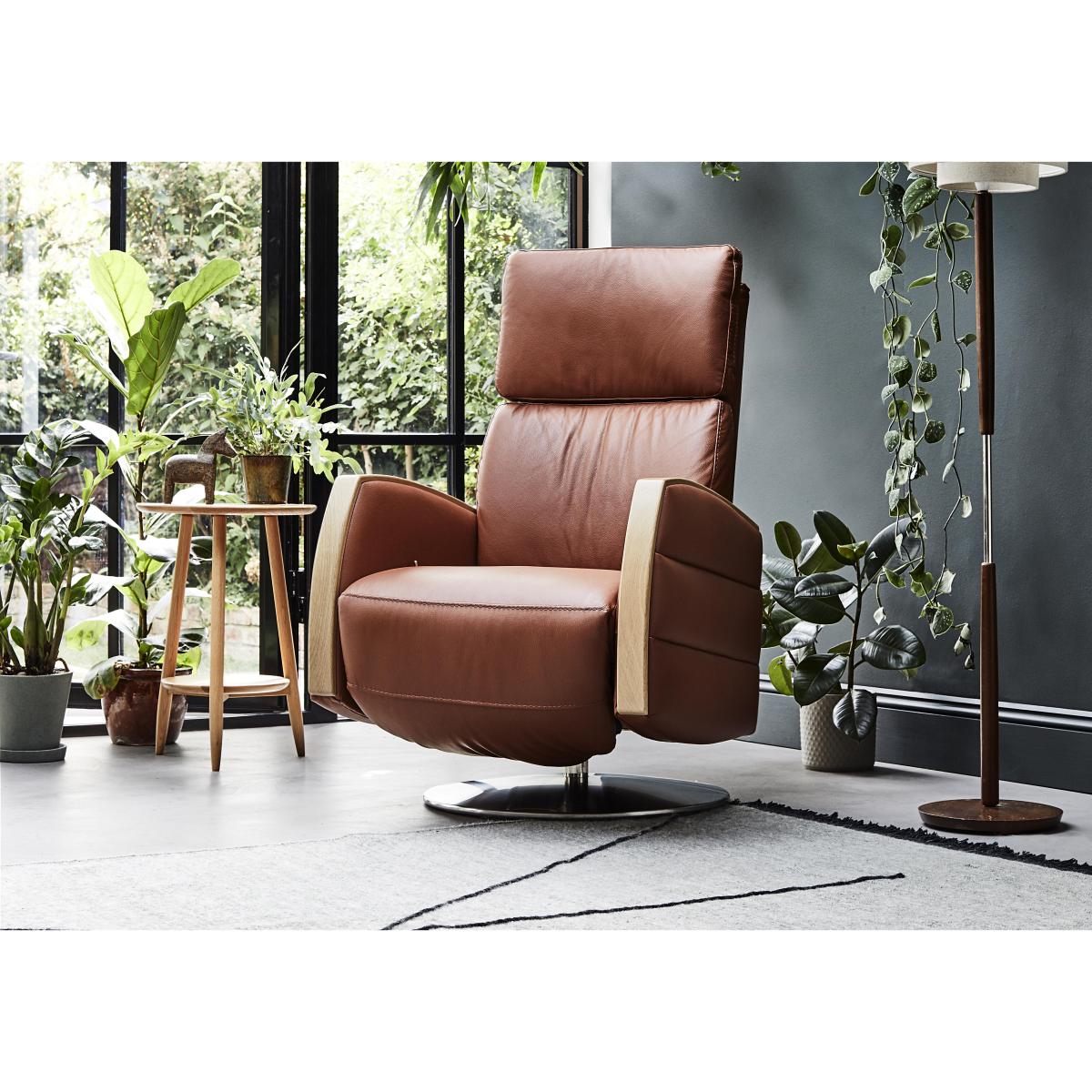 The Ercol Noto leather recliner displays all of Ercol’s signature characteristics: simplicity, elegance and functionality – and it’s wonderfully comfy too. Why you'll love it. A recliner chair for the design-conscious comfort seeker. Enjoy recliner comfort at the touch of a button. Beautifully upholstered in tan leather. Padded with foam and fibre for exceptional support. The oak accented arms nod to Ercol’s illustrious design heritage. Integrated head and footrest so you can stretch out and relax. Handmade in Spain by artisan craftsmen. What you need to know. Medium comfort. Seat cushion: Foam. Back cushion: Fibre. Please read our upholstery care guide for more advice. Please allow time for the recliner to settle. Minor gaps are necessary for ease of motion. Top tip: smoothing the seat cushions prevents puddling. Part of the Ercol Noto collection.