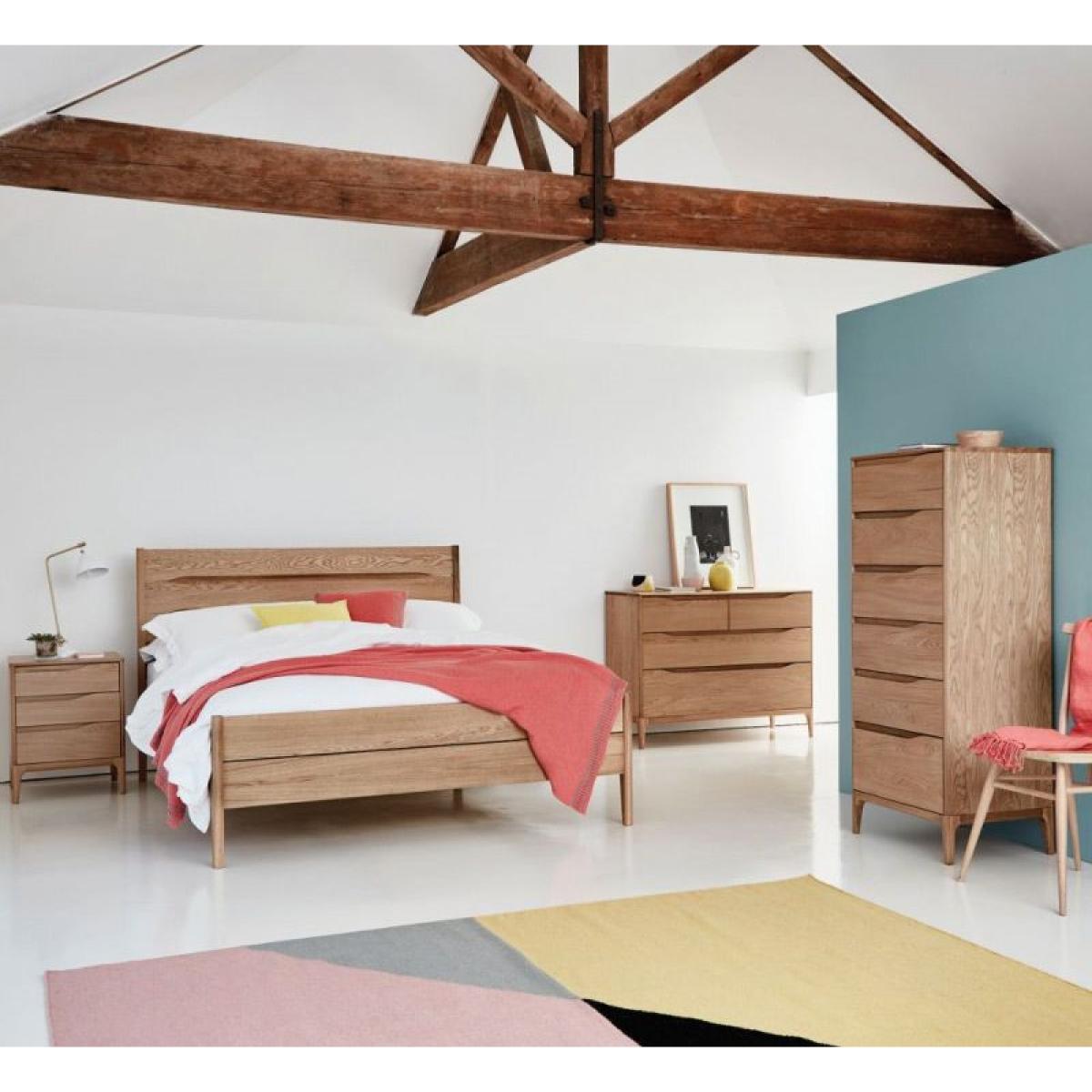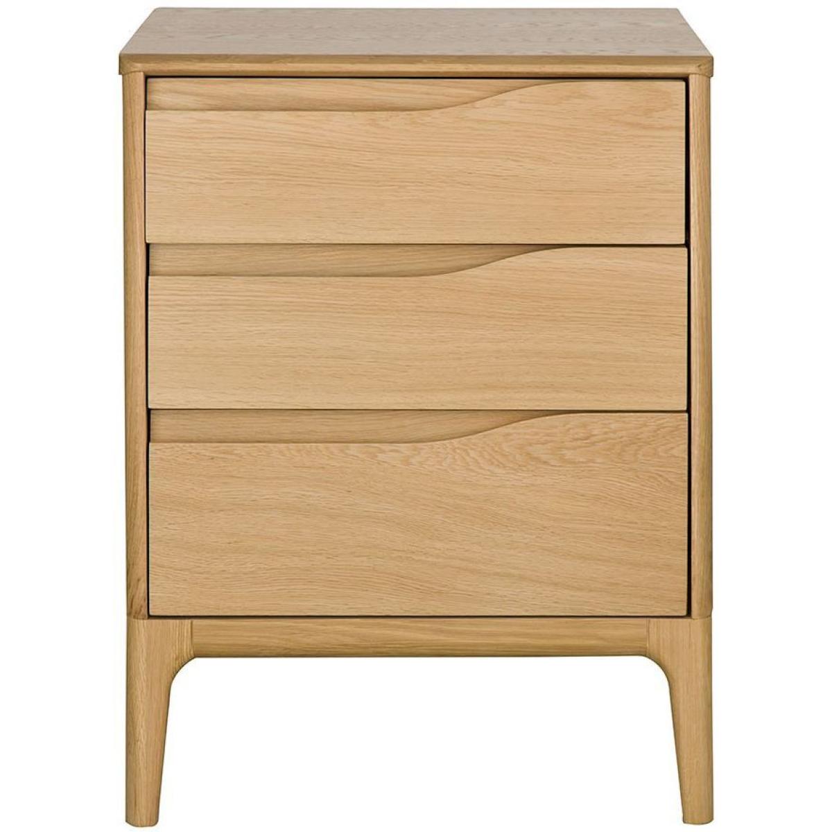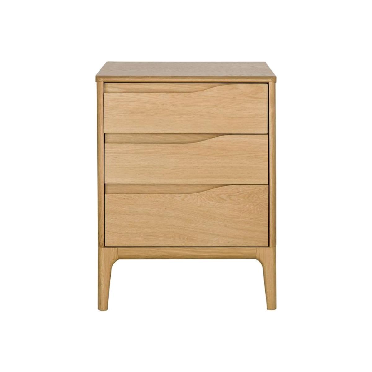 Softly tactile, the rise and dip of the carved indent, or chamfer, the Rimini bedroom range has been designed to induce a feeling of calm and relaxation. Thoughtfully designed the flowing lines have no sharp edges, this cohesive, collection of matching pieces will enhance any bedroom. The panelled headboard design is strong and contemporary; the scalloped lines give the piece interesting shadow lines and tactile detail. The chests and the wardrobe share the same curved cut out feature where the sculpted indents in the drawer front provide drawer pulls. On the tall chest and the bedside cabinet the drawers echo the scalloped handle detail giving an elegant and practical interpretation of the signature lines. Rimini is solid oak and oak veneer finished in a clear matt lacquer. The Rimini 3 drawer bedside cabinet in light oak offers plenty of practical storage with three deep drawers. Designed to perfectly complement the Rimini kingsize and double beds, the drawers have the same sculpted cutaway drawer pulls as the rest of the range to give the piece an elegant and contemporary feel. Dimensions:W 47 x D 46 x H 61cm. Solid Oak & Oak Veneer. Available in one finish - Clear Matt Oak (CM-Oak) Ready assembled * Please note: Wood finishes and colour samples are shown for guidance only as screen colours may vary. As wood is a natural material and varies in colour, grain and structure, a slight variation between pieces is perfectly normal.