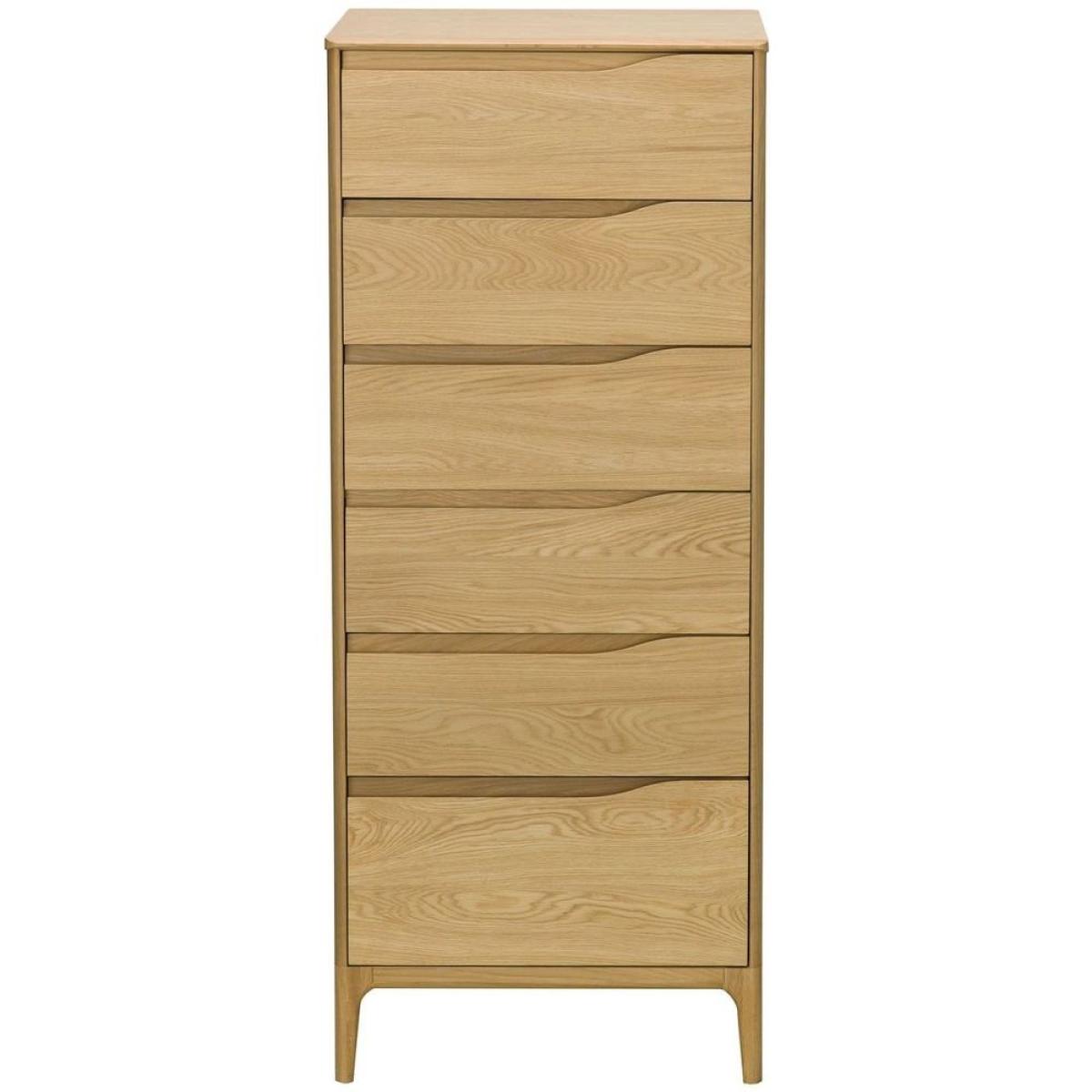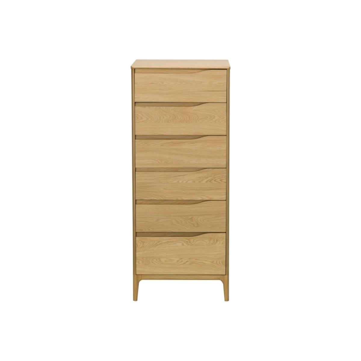 Softly tactile, the rise and dip of the carved indent, or chamfer, the Rimini bedroom range has been designed to induce a feeling of calm and relaxation. Thoughtfully designed the flowing lines have no sharp edges, this cohesive, collection of matching pieces will enhance any bedroom. The panelled headboard design is strong and contemporary; the scalloped lines give the piece interesting shadow lines and tactile detail. The chests and the wardrobe share the same curved cut out feature where the sculpted indents in the drawer front provide drawer pulls. On the tall chest and the bedside cabinet the drawers echo the scalloped handle detail giving an elegant and practical interpretation of the signature lines. Rimini is solid oak and oak veneer finished in a clear matt lacquer. Practical in design yet offering plentiful storage space, the Rimini 6 drawer chest features a deep drawer at the base with five equal drawers above. Made from light oak it is a contemporary elegant piece with sculpted cutaway drawer pull for easy handling when opening and shutting. Dimensions:W 58 x D 46 x H 142cm. Solid Oak & Oak Veneer. Available in one finish - Clear Matt Oak (CM-Oak) Ready Assembled * Please note: Wood finishes and colour samples are shown for guidance only as screen colours may vary. As wood is a natural material and varies in colour, grain and structure, a slight variation between pieces is perfectly normal.