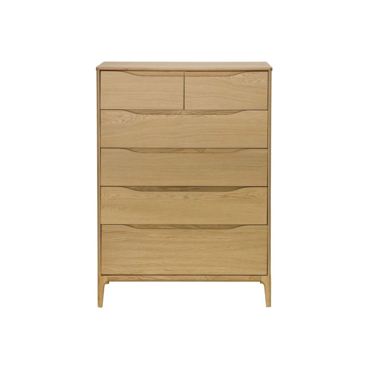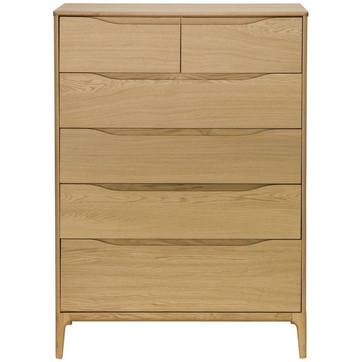 Softly tactile, the rise and dip of the carved indent, or chamfer, the Rimini bedroom range has been designed to induce a feeling of calm and relaxation. Thoughtfully designed the flowing lines have no sharp edges, this cohesive, collection of matching pieces will enhance any bedroom. The panelled headboard design is strong and contemporary; the scalloped lines give the piece interesting shadow lines and tactile detail. The chests and the wardrobe share the same curved cut out feature where the sculpted indents in the drawer front provide drawer pulls. On the tall chest and the bedside cabinet the drawers echo the scalloped handle detail giving an elegant and practical interpretation of the signature lines. Rimini is solid oak and oak veneer finished in a clear matt lacquer. The Rimini 6 drawer tall wide chest in light oak is well proportioned for the compact bedroom and offers plentiful and versatile storage. With a deep base drawer, three equal wide drawers and two smaller drawers at the top, this is a practical and handsome piece for a contemporary bedroom.
