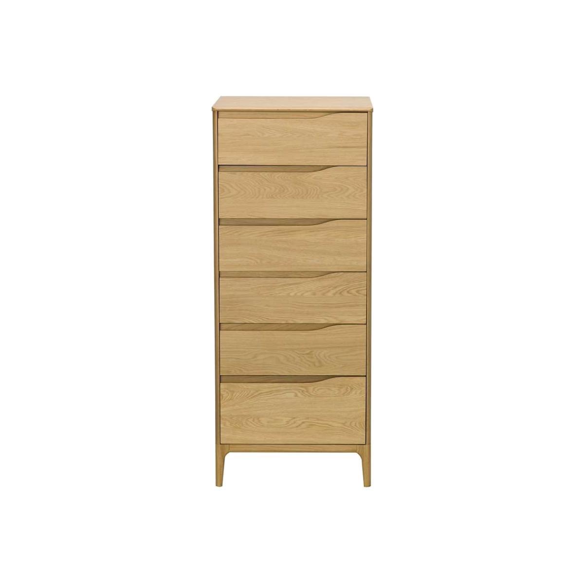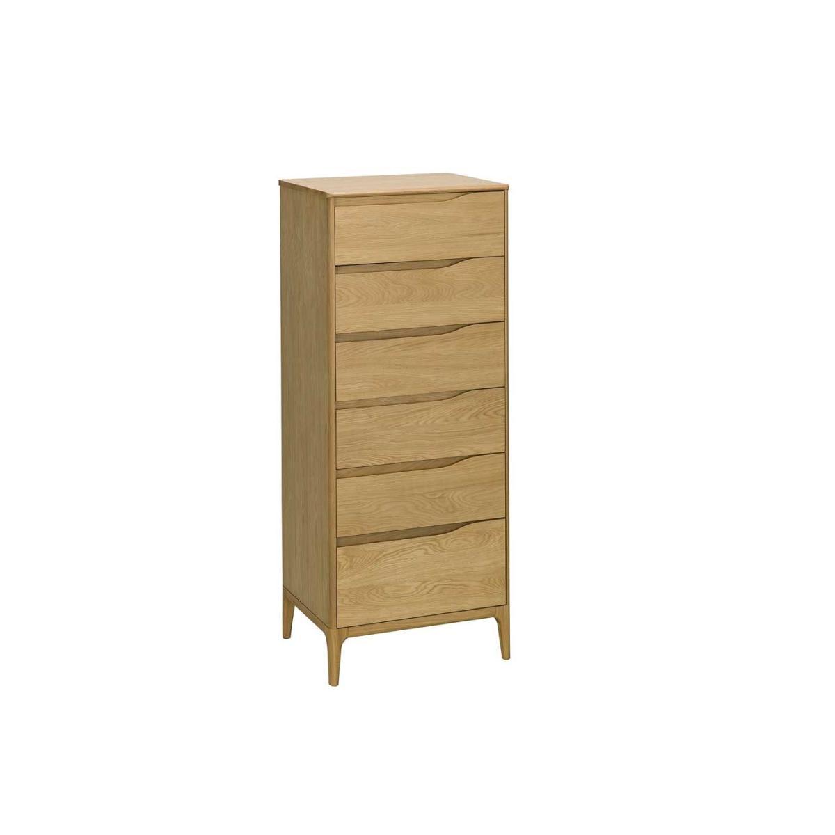 Created by the ercol Design Studio, the oak Rimini 6-Drawer Tall Chest boasts six slim drawers to provide practical bedroom storage.