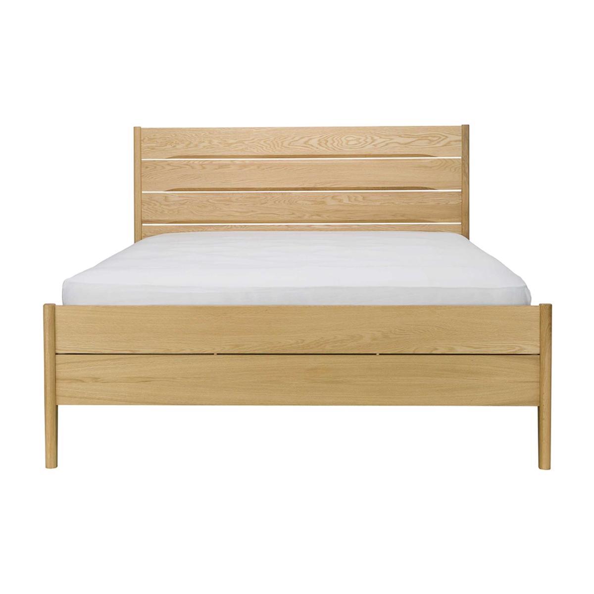 Design. Available as a double of king size frame, the Rimini Bed Frame provides the perfect place to relax and unwind after a long day. A planked chamfered headboard has a sleek and minimalistic look which will suit a wide range of interior settings. Light solid oakis a mainfeaturefor this piece andcreates a natural element in your space, bringing you closer to natureand bringing a sense of calm into your space. The headboard is balanced by the single plank to the foot of the bed, and completed with gently turned oak legs.