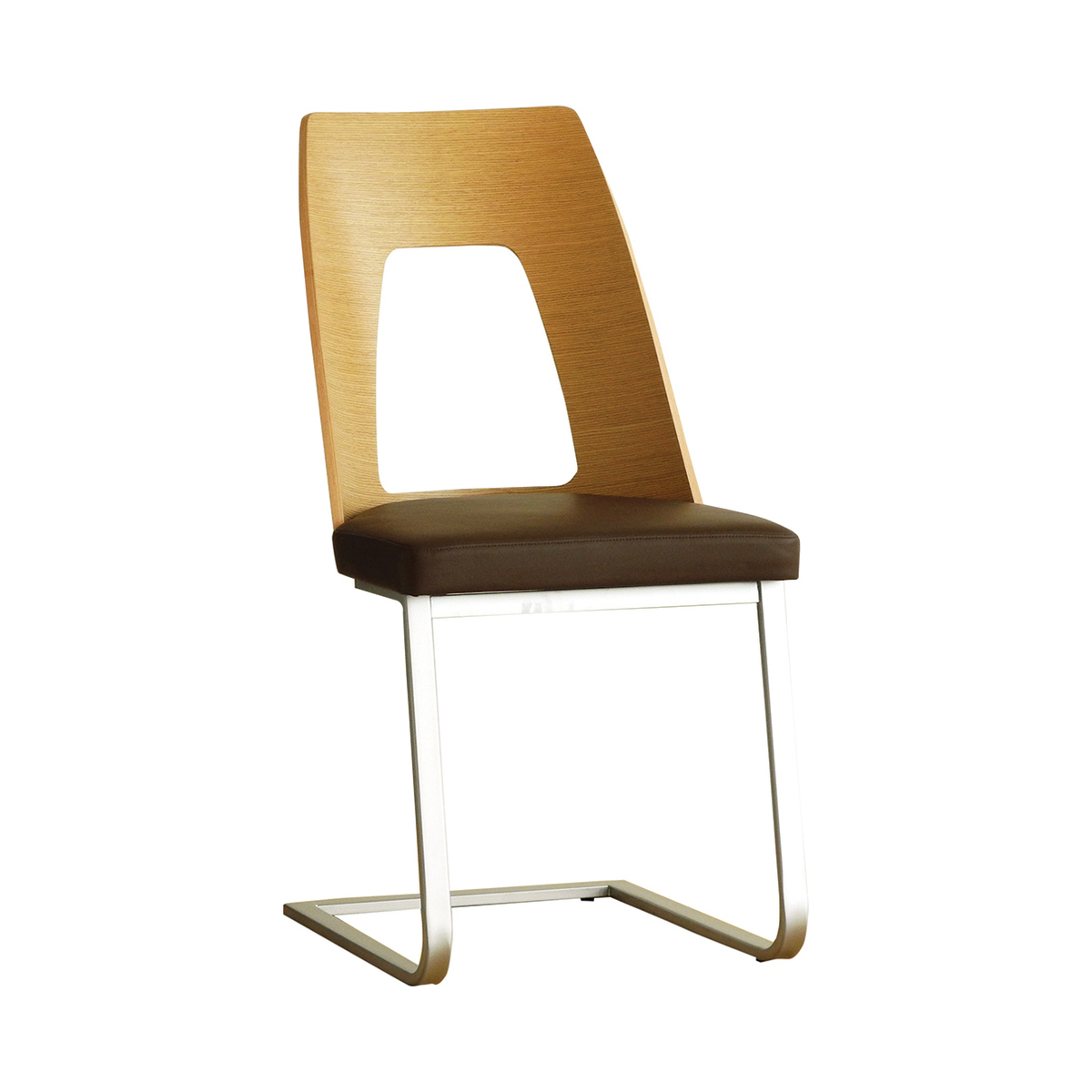 This chair combines contemporary styling with a relaxed and comfortable sit, aided by the inherent springing within the bent steel frame. This chair is available in our full range of fabrics and a choice of leathers. The chair back is made from steam-bent oak veneers whilst the steel frame is finished in a lustrous satin chrome plating.