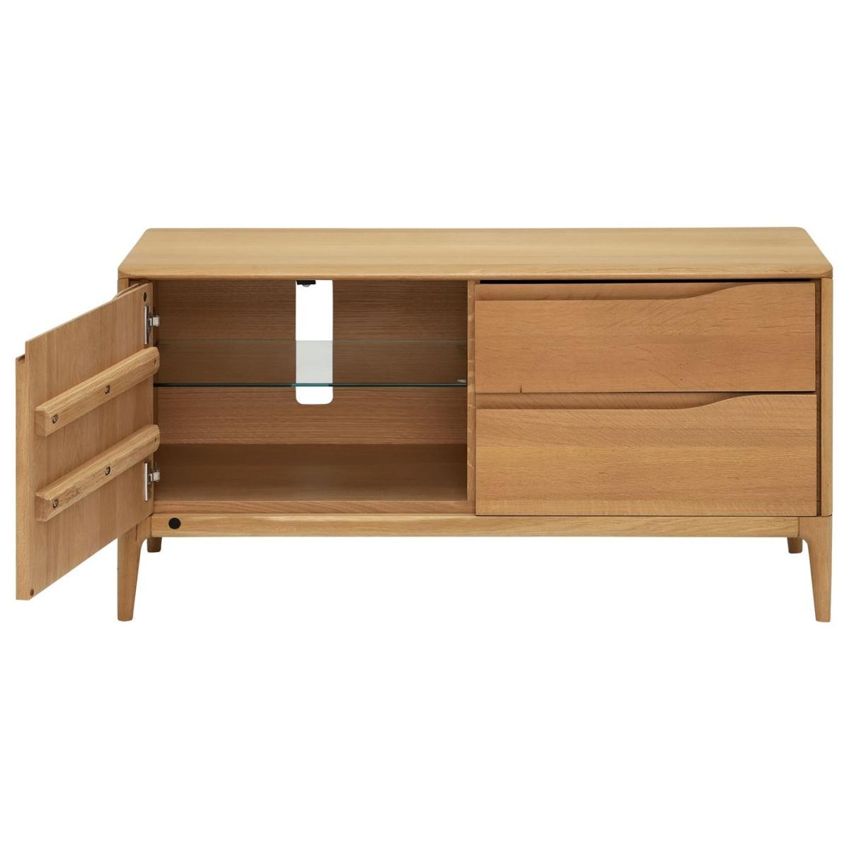 I love the Ercol Romana IR TV unit in oak for its clean, classic lines and warm natural finish, making it a versatile addition to many interiors. It works particularly well in Scandinavian or mid-century modern schemes, where its simplicity complements bold colours or textured fabrics. Practical styling tips include pairing it with minimal accessories or a few decorative books and plants to keep the look fresh and uncluttered. Its spacious drawers and cabinet provide ample storage for media essentials or clutter, helping to keep your living space tidy while adding a timeless, understated charm.