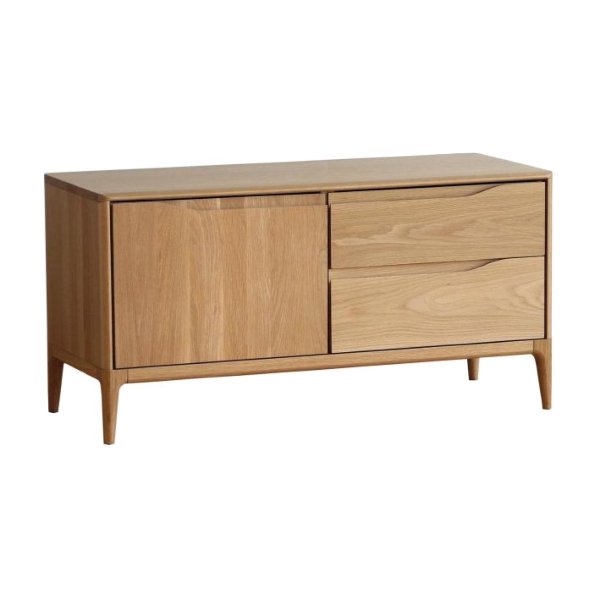 With wonderfully soft curves and sophisticated craftmanship that really does emphasise Ercol's skill in working with solid timber, Romana is expertly crafted from pale oak and finished in a clear matt lacquer that not only protects the timber but also shows off its natural characteristics and beauty. The modern oak dining and living room furniture collection will look great in both modern and traditional homes. Featuring the collections signature soft curves to the front edge, fluid organic curves to the legs and fluid wave-shaped recessed door and drawer handles, this stylish infra-red television unit is sleek and simple in style and comes complete with a cupboard on the left hand side to accommodate your av equipment or dvd or blu-ray player and 2 handy drawers on the right hand side, ideal for storing videos, dvds or remote controls. Doors and drawers feature a wonderful soft-close mechanism and the glass shelf in the left hand cupboard section is mounted on pins that can easily be adjusted in height. Pair this television cabinet with other pieces from the Ercol Romana Oak Living Room Furniture collection, and you'll have a living room that oozes style and sophistication. A great investment piece, this sturdy oak television cabinet will serve you well for years to come. Product code 2651 Oak construction Dimensions - 108cm W x 45cm D x 55cm H * Please note that wood finishes and colour samples shown are for guidance only as screen colours may vary. With wood being a natural material, colour, grain and structure may vary to that shown.