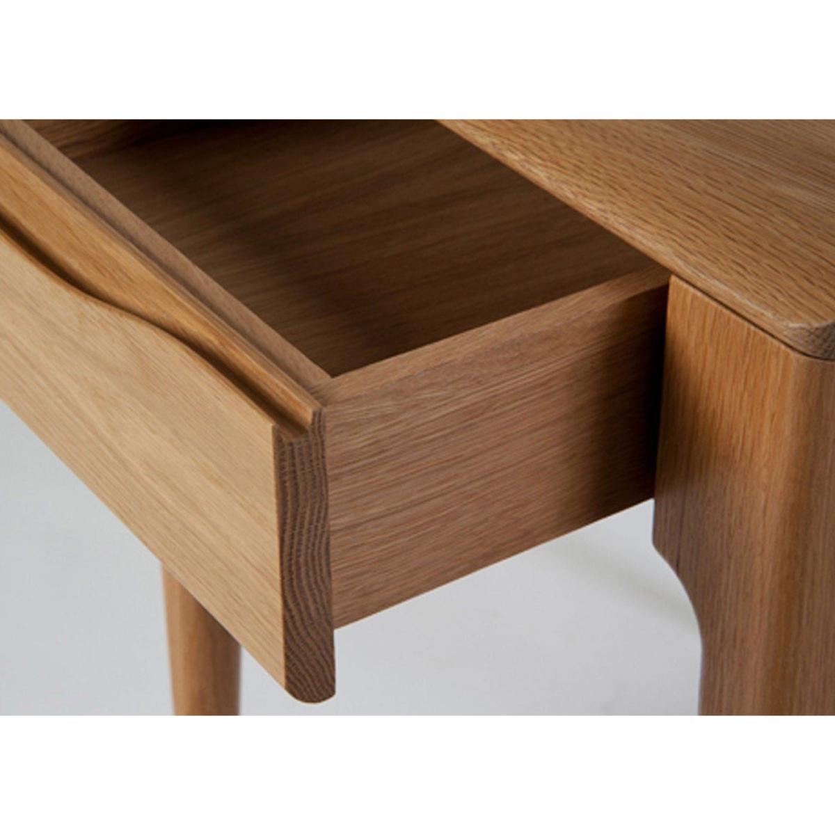 The Romana oak lamp table includes a slimline drawer for storing small items. The front edge of the table top bears the signature soft curve, and the legs have the fluid organic curves and chamfers that, characterise Romana. This oak furniture is finished in a clear matt lacquer to show the beauty of the natural timber.