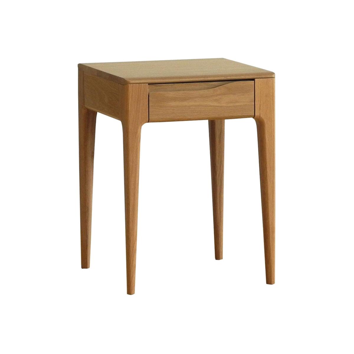 The Romana oak lamp table includes a slimline drawer for storing small items. The front edge of the table top bears the signature soft curve, and the legs have the fluid organic curves and chamfers that, characterise Romana. This oak furniture is finished in a clear matt lacquer to show the beauty of the natural timber.