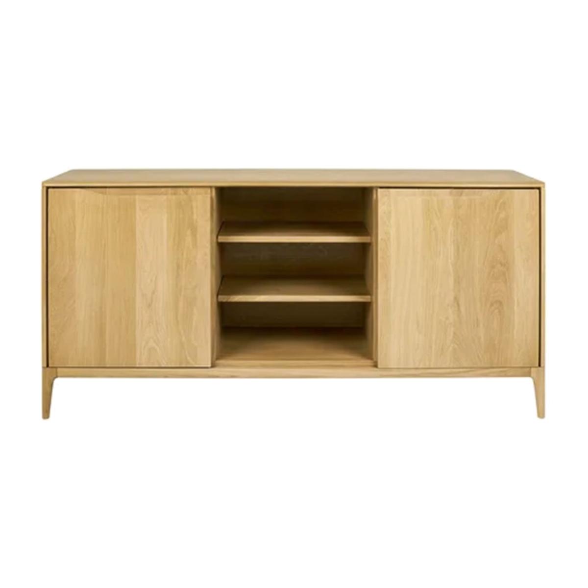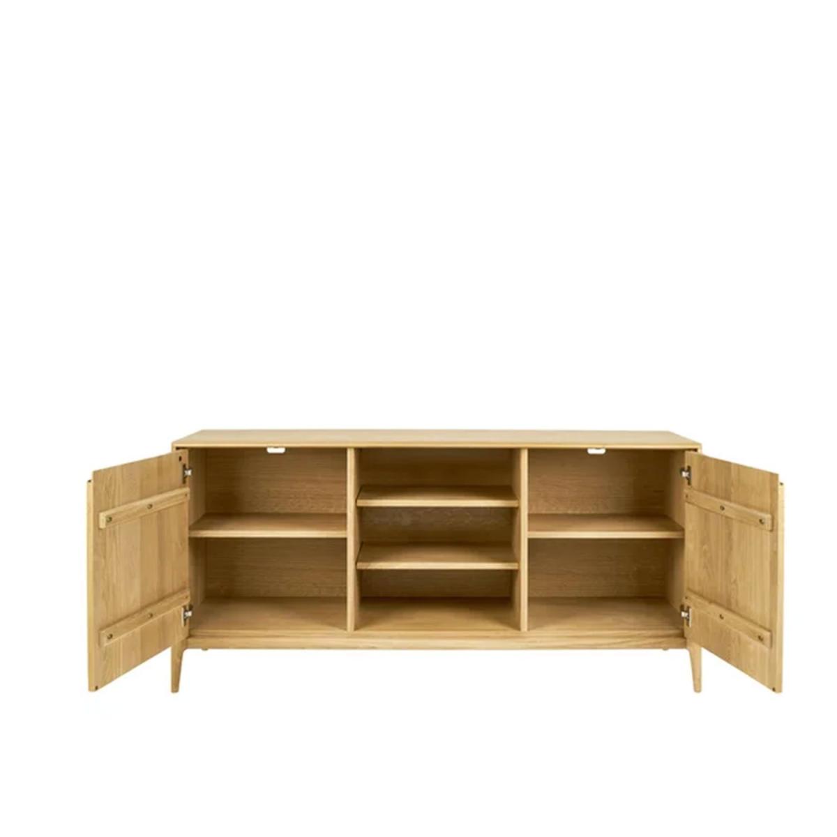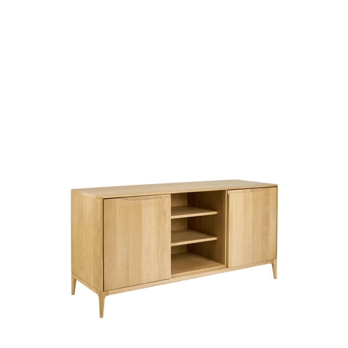 The Ercol Romana Open Media Sideboard features a signature soft curve, while the legs have fluid organic curves. This modern piece has been designed as a practical home entertainment console but also works well as a conventional sideboard. The design signature of the range, the door handles are fluid wave-shaped cut-out recesses, while this charming piece of furniture is finished in clear matt to enhance the natural wood grain. This media sideboard is versatile and practical, which is evidenced by its two cupboards to provide plenty of storage space with an adjustable shelf inside each one to suit your needs, along with a central shelf section with two adjustable shelves.