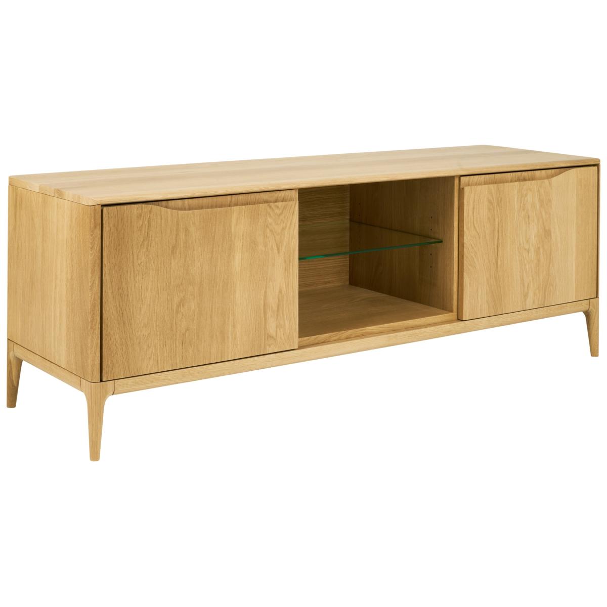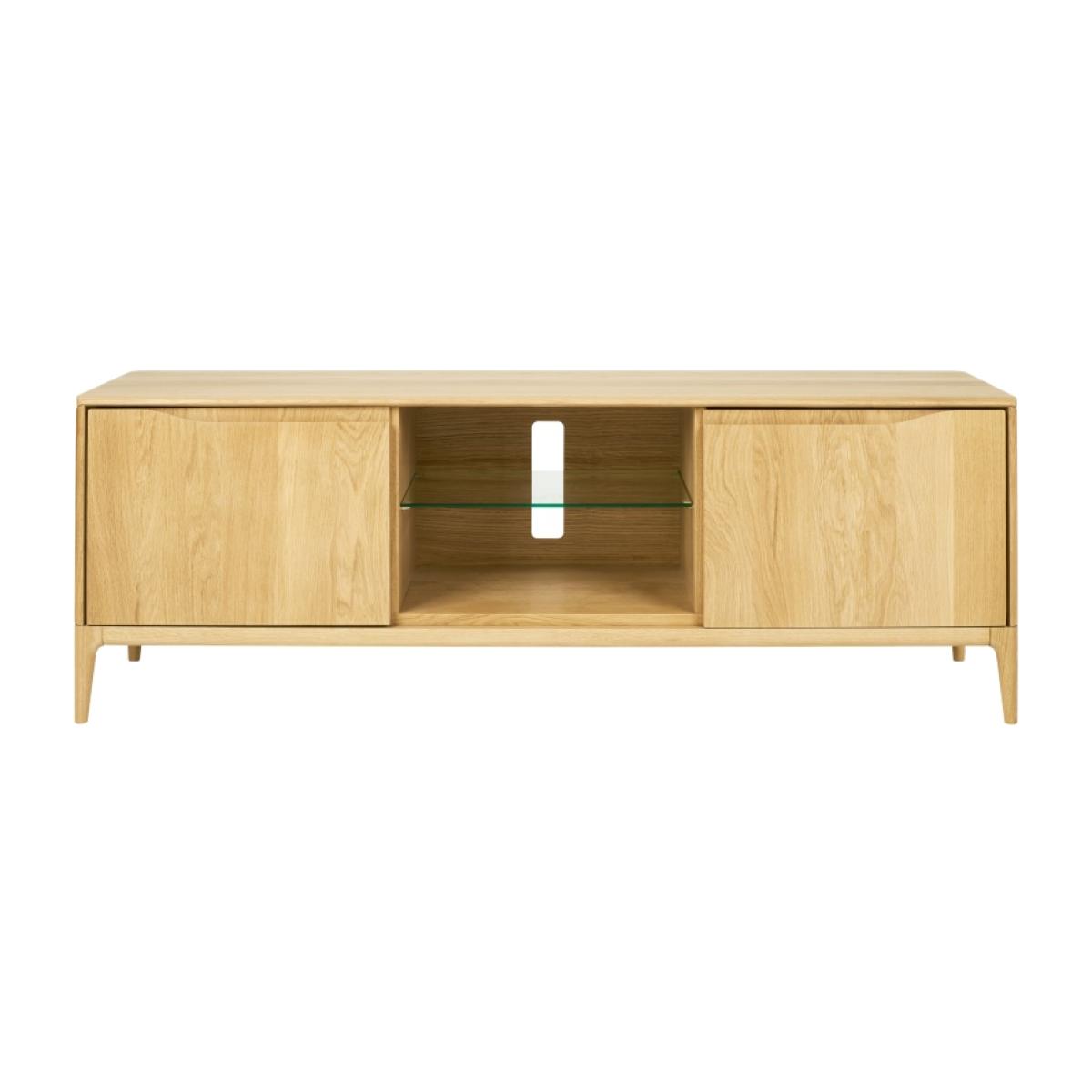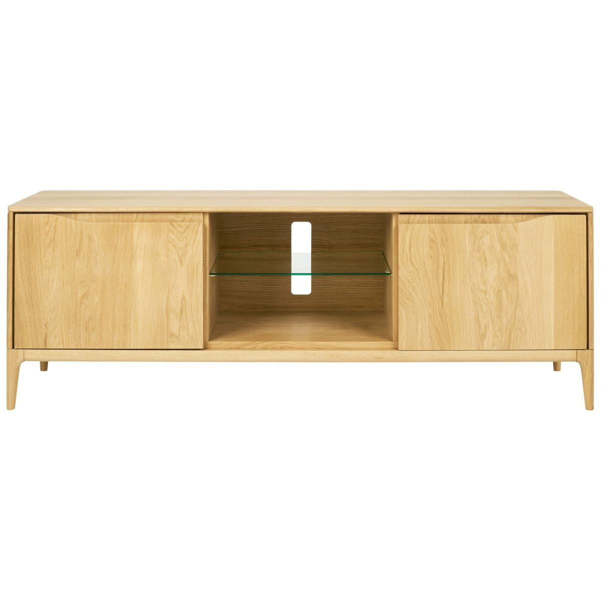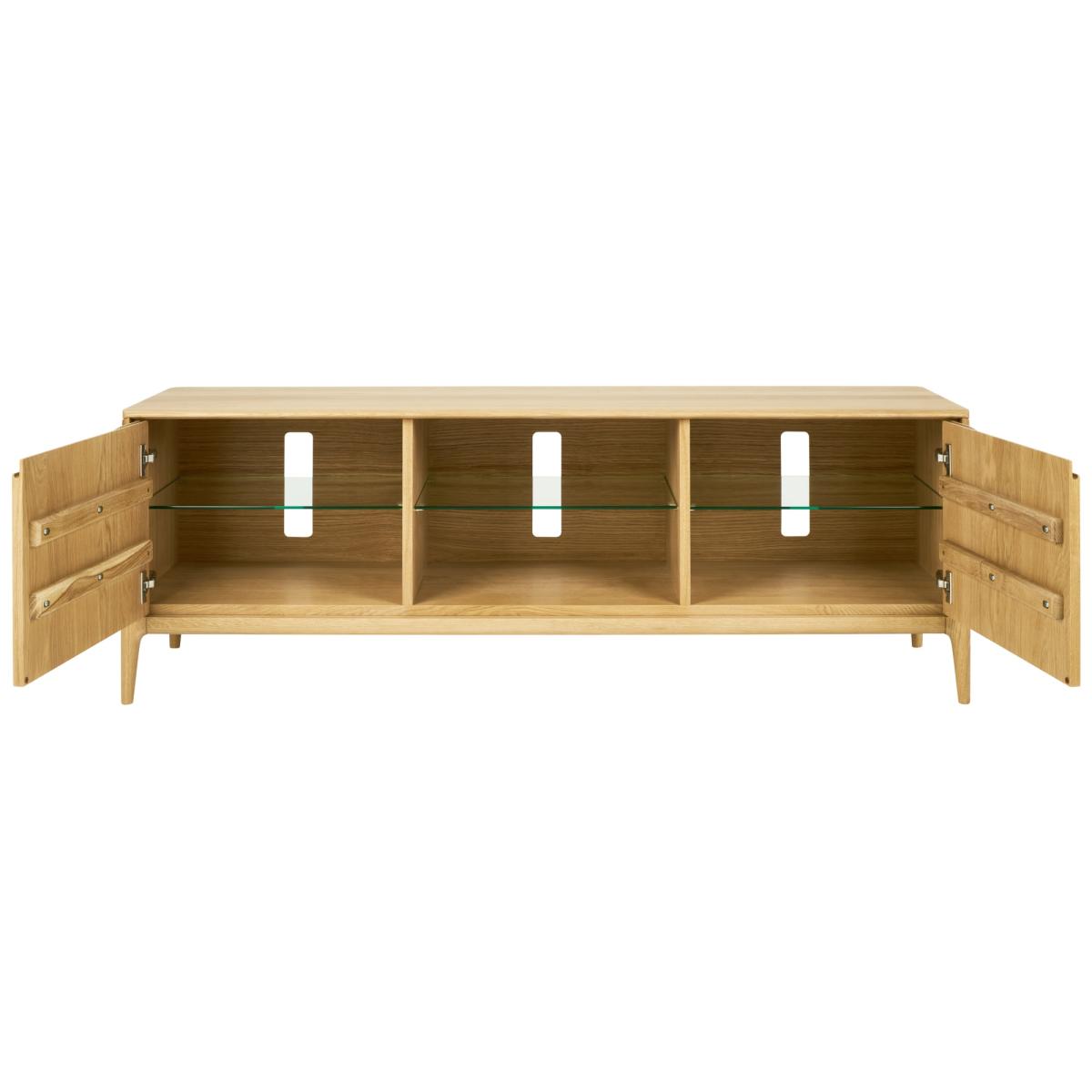 New to ercol in 2024 is the addition of the Open Wide TV Unit to the highly successful Romana range. Each piece has cable management holes as well as adjustable shelves in the cupboards. As with the rest of the Romana collection, these pieces are made in the ercol Princes Risborough factory from solid oak and have the same design elements, finished in a clear matt lacquer. The Romana collection is perfect in an open plan living space. Features: Cable management holes Adjustable shelves Fully Assembled Solid Oak with a Clear Matt finish Handmade in the UK Dimensions: Width 160cm Depth 45cm  Height 55cm All screens vary in colour reproduction and whilst every effort has been made to display the colour as accurately as possible it is for guidance only.