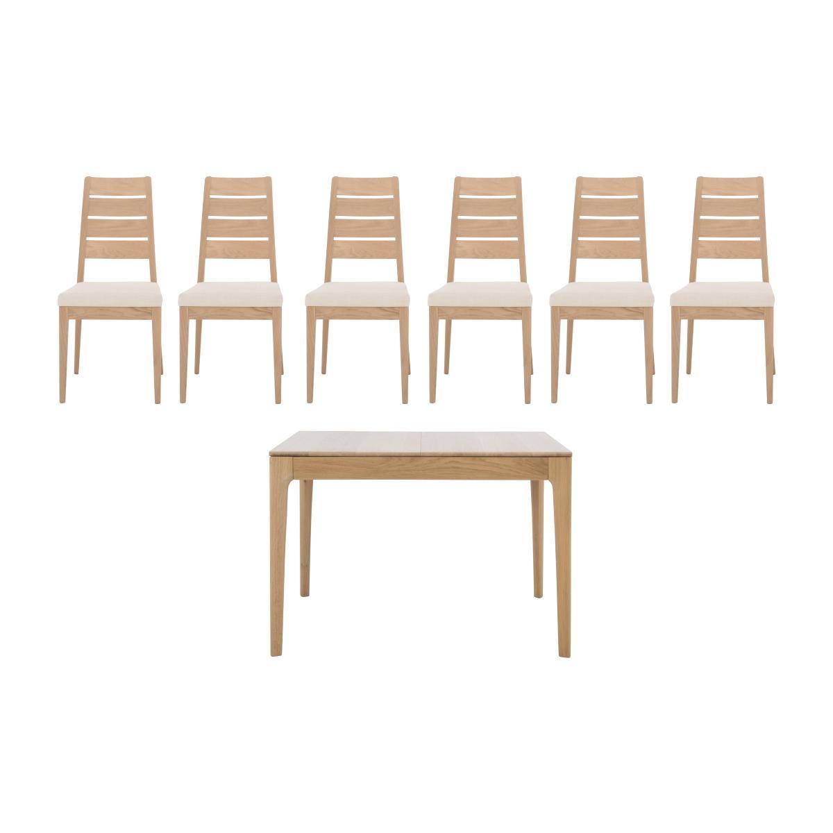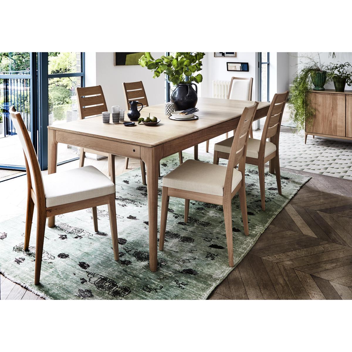 The Romana dining collection offers the comfort, functionality and beauty you expect from renowned furniture makers ercol. Their famous design flair is shown in the furniture’s soft curves, subtle detailing and low contemporary silhouettes. Each exquisite piece is expertly crafted from pale oak, with a clear matt lacquer showing off the natural beauty of the grain. The ercol Romana small extending dining table and 6 slatted dining chairs set captures the essence of beautiful and functional mid-century modern style and gives it a smooth contemporary look. Made by the craftspeople at ercol, this set features a dining table that extends to seat six with a butterfly mechanism, so smooth and easy to use. In solid oak and with a clear matt lacquer finish, this lovely table has a rounded-edged top and chamfered legs. The accompanying oak dining chairs are a stylish update on the traditional slat-back dining chair. Backs are tall and gradually narrow, and have four broad slats. Seat pads are well cushioned and upholstered in a soft yet hardwearing cream fabric. (Cream C710). The ercol Romana small extending dining table and 6 slatted chairs dining set is one of several dining sets in the ercol Romana collection at Furniture Village. Did you know?. Natural wood has unique markings, with some colour variation. The colour and tone of wood improves with age.
