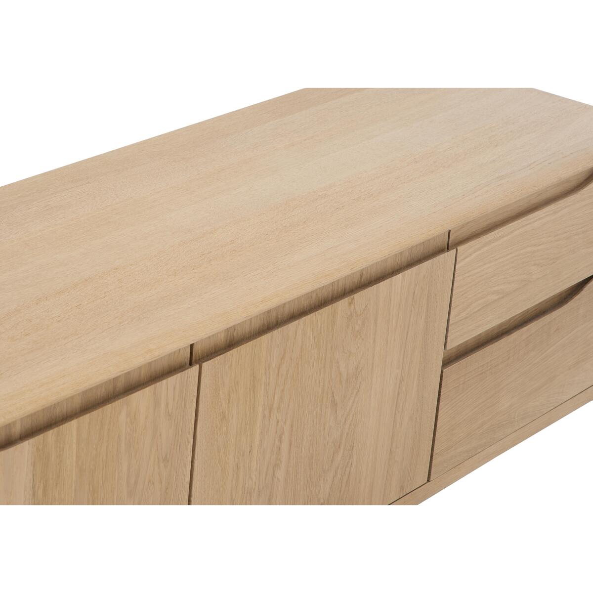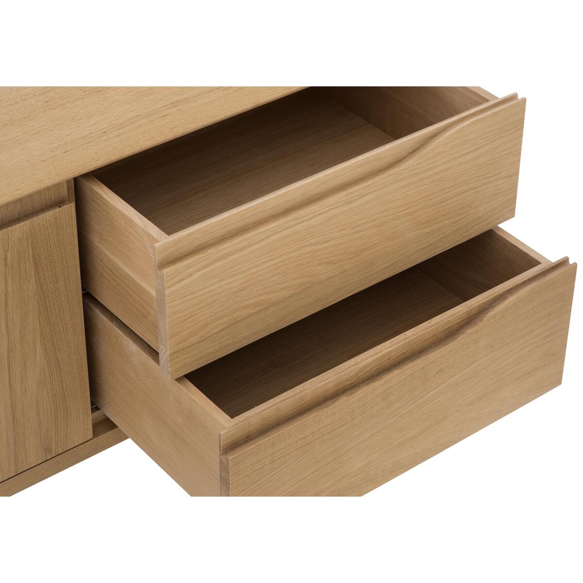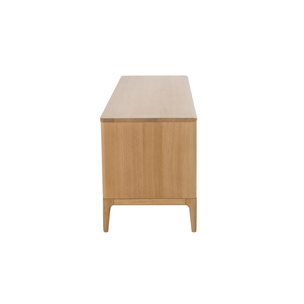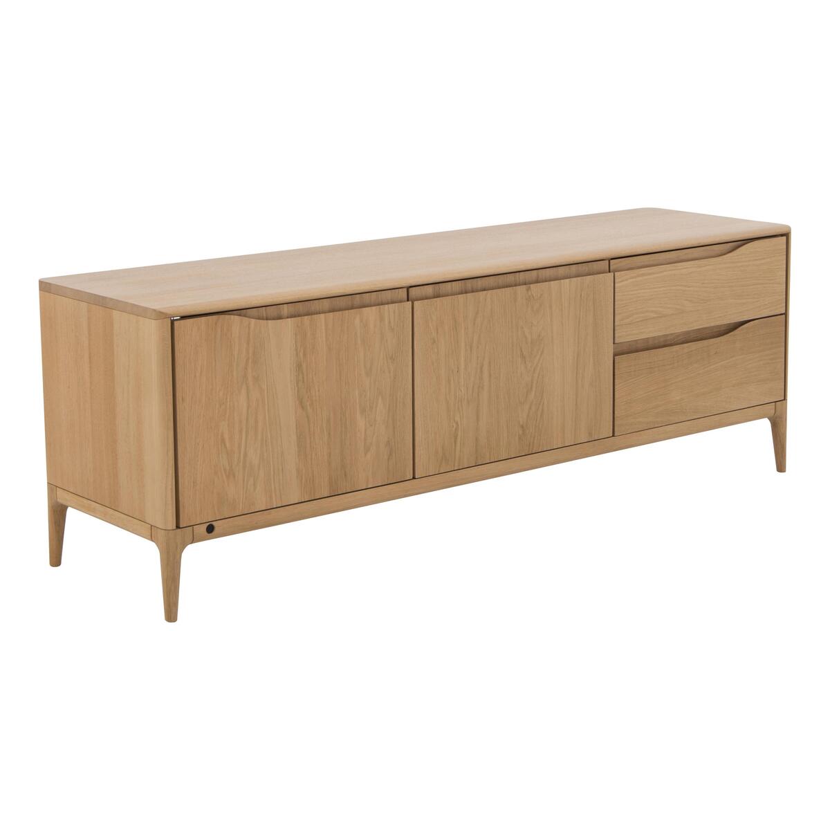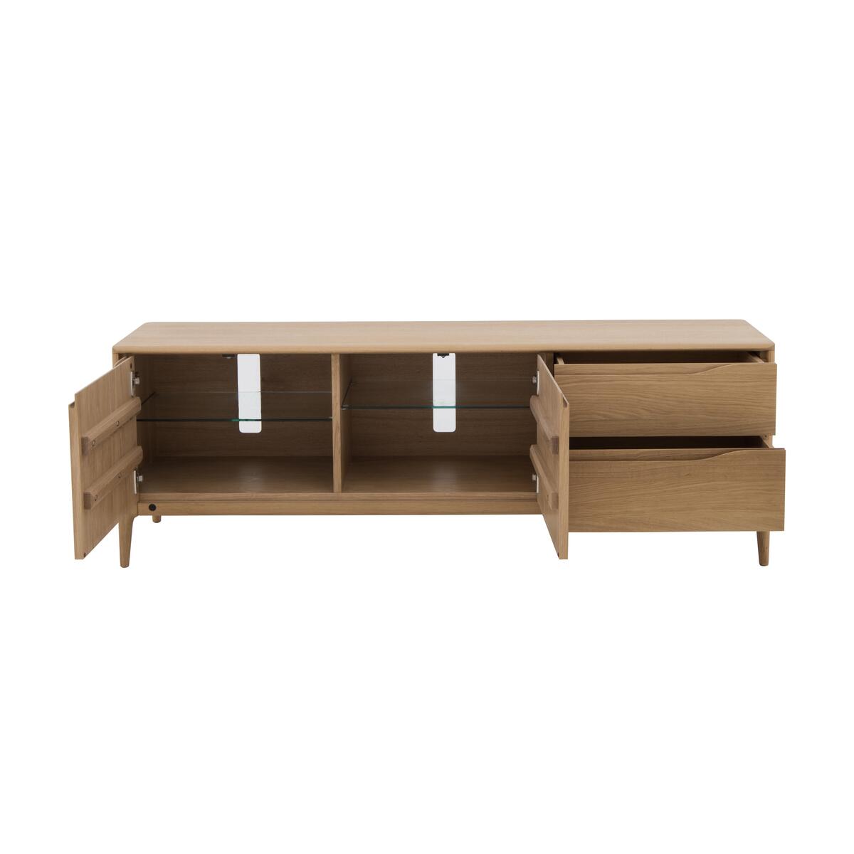 The Romana dining collection offers the comfort, functionality and beauty you expect from renowned furniture makers ercol. Their famous design flair is shown in the furniture’s soft curves, subtle detailing and low contemporary silhouettes. Each exquisite piece is expertly crafted from pale oak, with a clear matt lacquer showing off the natural beauty of the grain. The perfect combination of elegant mid-century style and modern functionality, the ercol Romana wide TV unit is designed to take pride of place in any living space. Crafted from beautiful pale oak and finished with a wood-grain enhancing clear matt lacquer, this stunning piece of living room furniture offers a wealth of storage space for all your media equipment. And its IR capability means that media components work even when the doors are closed. The double door cupboard opens to reveal a vertically divided storage space, glass shelves and two cable holes. On the right, two spacious drawers are the perfect place to store games consoles and remote controls. Like all pieces made by ercol, this media cabinet is beautifully crafted. Cupboard doors and drawers are soft closing and feature ercol’s signature curved recessed handles. This TV unit is framed with a narrow bevelled edge and has slender chamfered legs. The ercol Romana wide TV unit is part of the ercol Romana collection of dining room furniture and occasional and storage pieces. Did you know?. Natural wood has unique markings, with some colour variation. The colour and tone of wood improves with age.