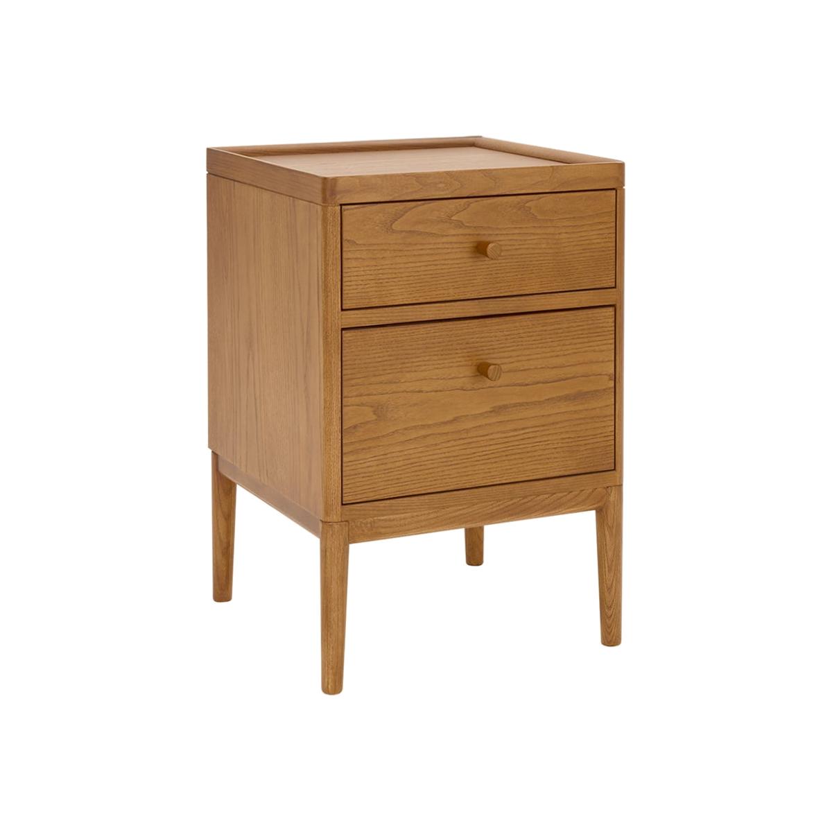 I love this little bedside cabinet for its clean, timeless lines and functional design. It works particularly well in minimalist, Scandi, or mid-century inspired interiors, thanks to its simple form and warm wood finish. It's a versatile piece that can add character to both contemporary and traditional bedrooms. Practical styling tips include pairing it with bedding in neutral tones to highlight its natural wood, or using textured textiles and small decorative items on top for added interest. The two drawers offer handy storage for essentials, keeping bedside clutter out of sight. It’s a straightforward, stylish choice that brings a warm, welcoming touch to any sleep space.