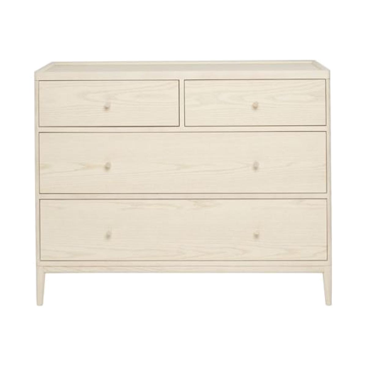 The Salina 4 drawer wide chest offers substantial storage space and boasts 2 small drawers and 2 wider and deeper drawers for all of your clothes. In keeping with the Salina range it has a practical tray top which prevent items rolling off the surface and is finished in pale ash with a white washed stain and clear matt lacquer displaying the pattern of the wood grain through the finish creating a calm and light feel in any bedroom. All screens vary in colour reproduction and whilst every effort has been made to display the colour as accurately as possible it is for guidance only.