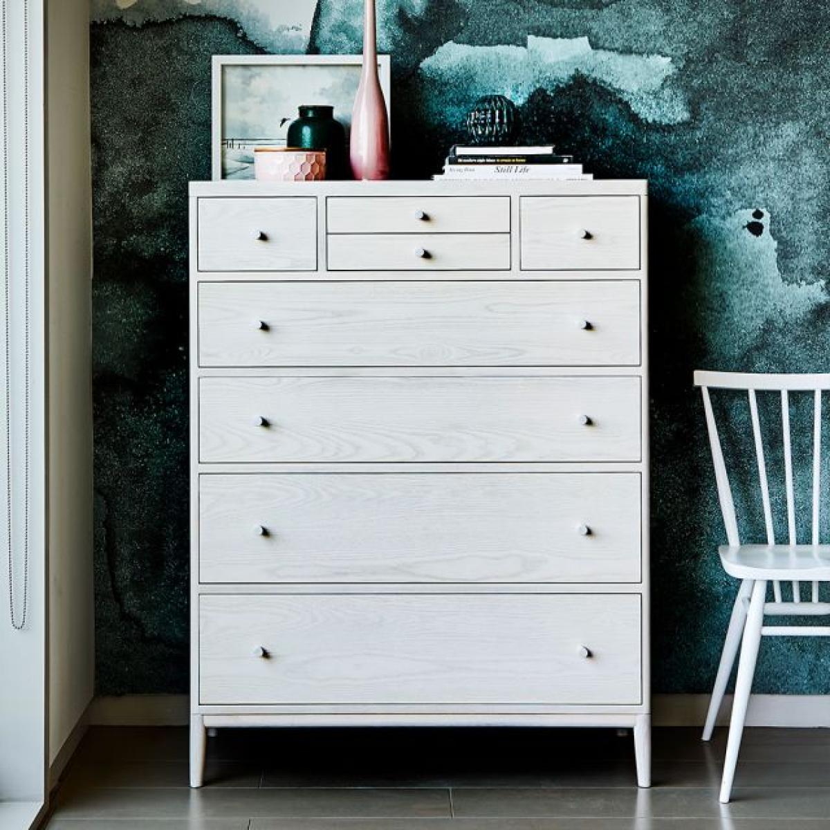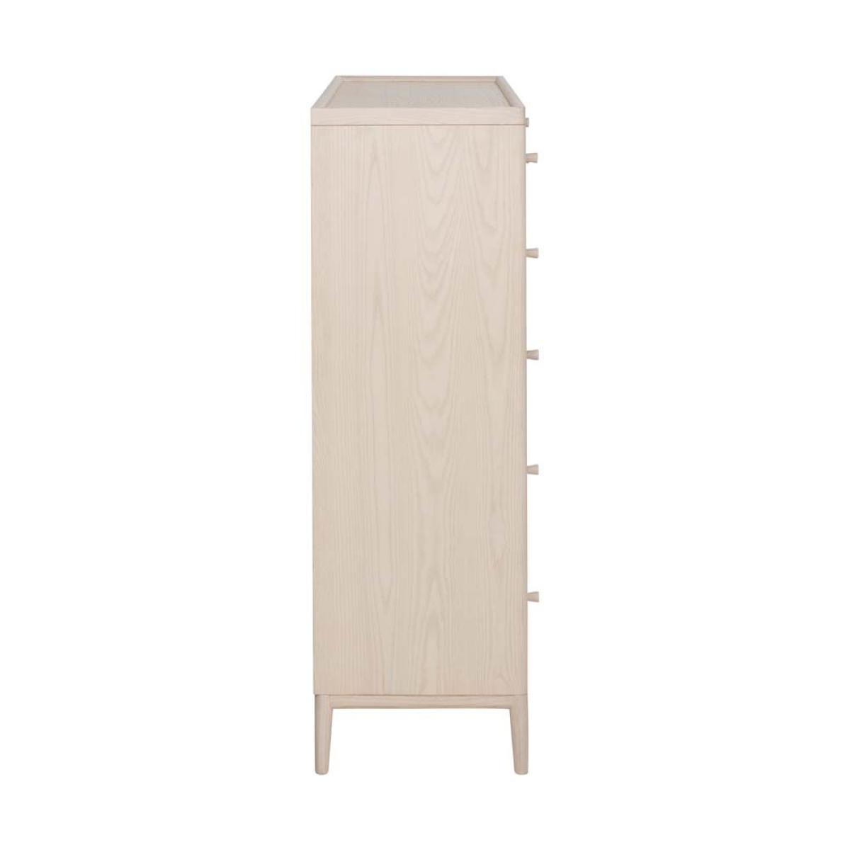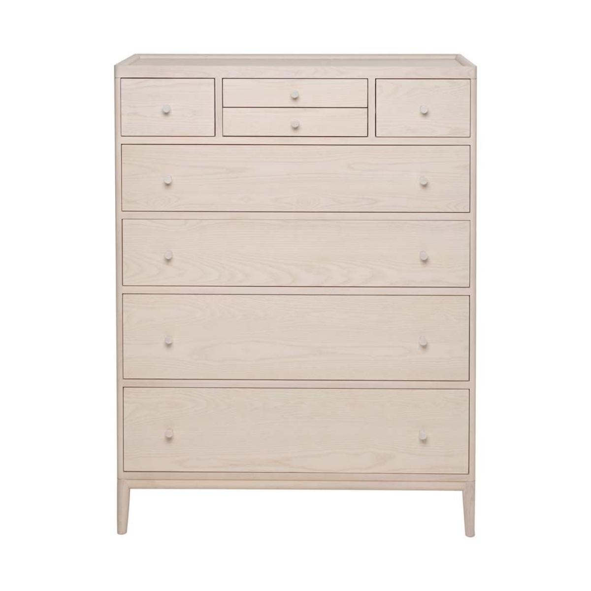 The Salina 8 drawer tall chest is full of design features, it has a practical tray top which prevent items rolling off the surface and the central drawer has a wooden vanity drawer divider. It is finished in pale ash with a white washed stain and clear matt lacquer displaying the pattern of the wood grain through the finish and creating a calm and light feel in any bedroom.