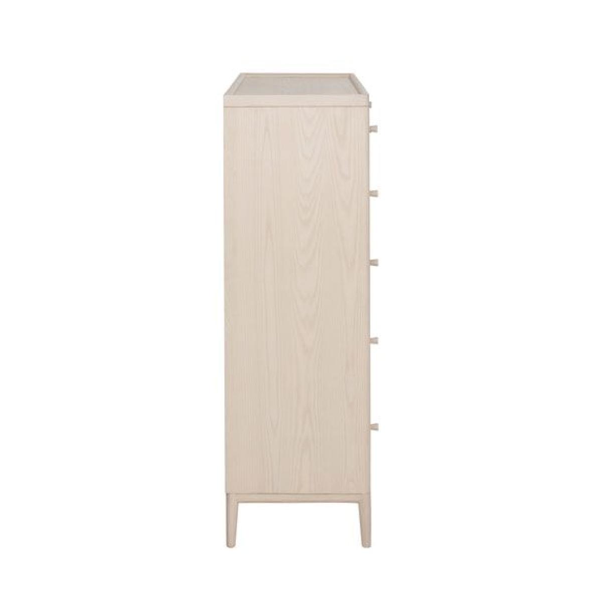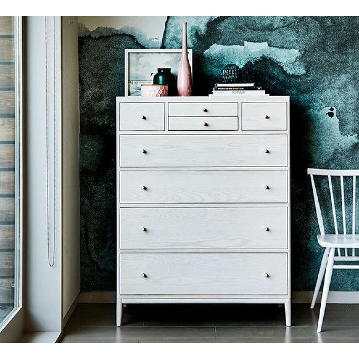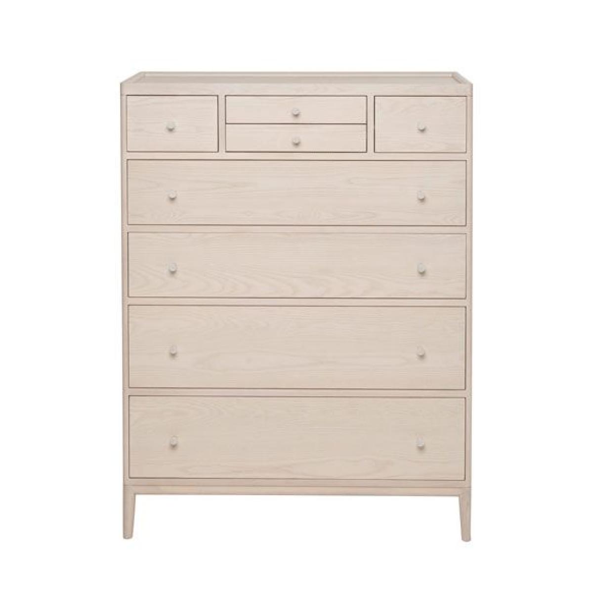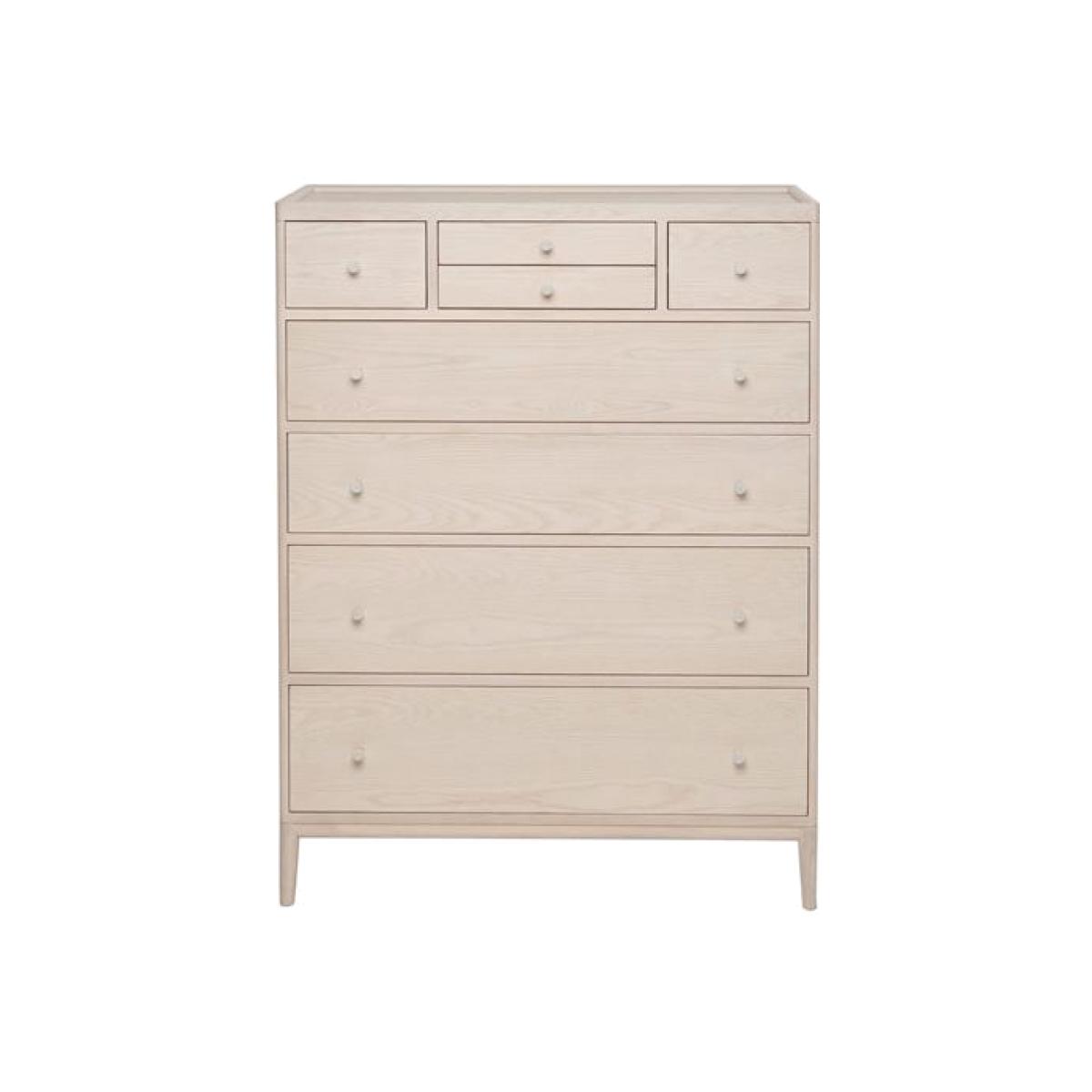 The Salina 8 drawer tall chest is full of design features, it has a practical tray top which prevent items rolling off the surface and the central drawer has a wooden vanity drawer divider. It is finished in pale ash with a white washed stain and clear matt lacquer displaying the pattern of the wood grain through the finish and creating a calm and light feel in any bedroom. Designed by Lisa Gould Sandall W 95cm x D 40cm x H 125cm. Solid Ash & Ash Veneers. Fully Assembled. All screens vary in colour reproduction and whilst every effort has been made to display the colour as accurately as possible it is for guidance only.