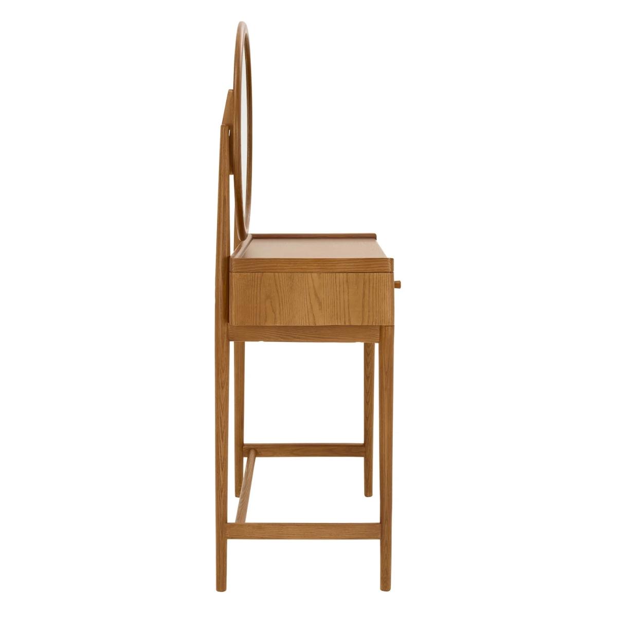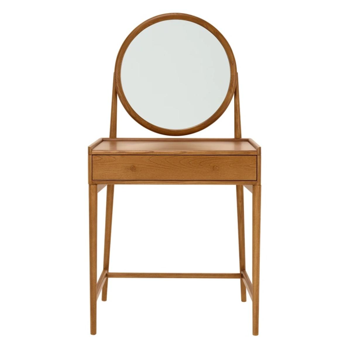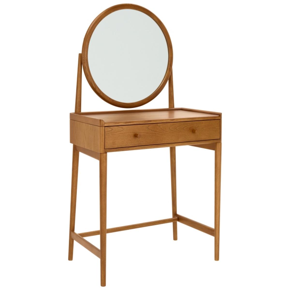 Make a stylish statement in your bedroom with the Salina Dressing Table, featuring a classic round mirror that adds elegance and charm. Designed for practicality, it includes a tray top to prevent items from rolling off the back or sides, and a drawer with a built-in divider for organising smaller essentials. Finished in a timeless vintage finish, this dressing table combines functionality with sophisticated style, perfectly complementing the Salina range. Features: Construction: Solid Ash, Ash Veneers Finishes: Vintage Partial assembly is required Matching pieces available Dimensions Height: 135cm Width: 70cm Depth: 44cm Weight: 18kg Please note: Cabinets and chests over 60cm tall should be fixed to the wall to ensure stability, anti-tip kits with fixtures will be provided. The fixing of these pieces to the wall will not be carried out by our delivery partner. Please follow the product instructions and immediately attach to a wall as stated. Before ordering, we recommend viewing the fabric and wood finish in store and ordering samples to view at home. While we endeavour to ensure that the stated dimensions are as accurate as possible, due to manufacturing tolerances, these may vary slightly. Wood is a natural material, consequently the grain pattern will vary from piece to piece. All screens vary in colour reproduction and whilst every effort has been made to display the colour as accurately as possible it is for guidance only.