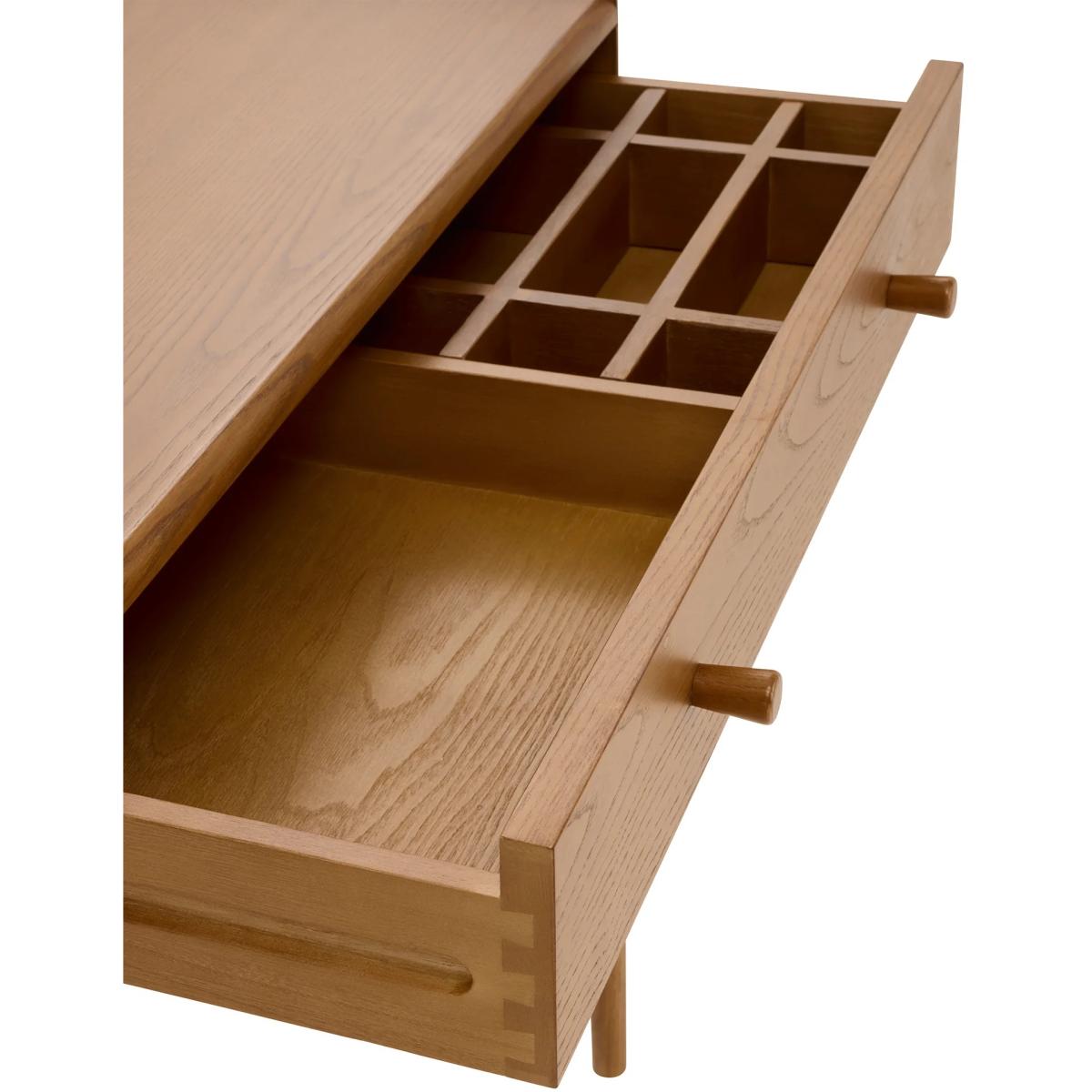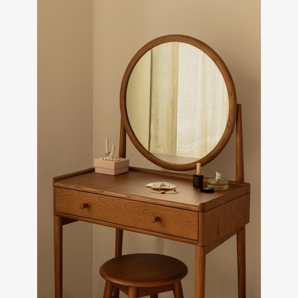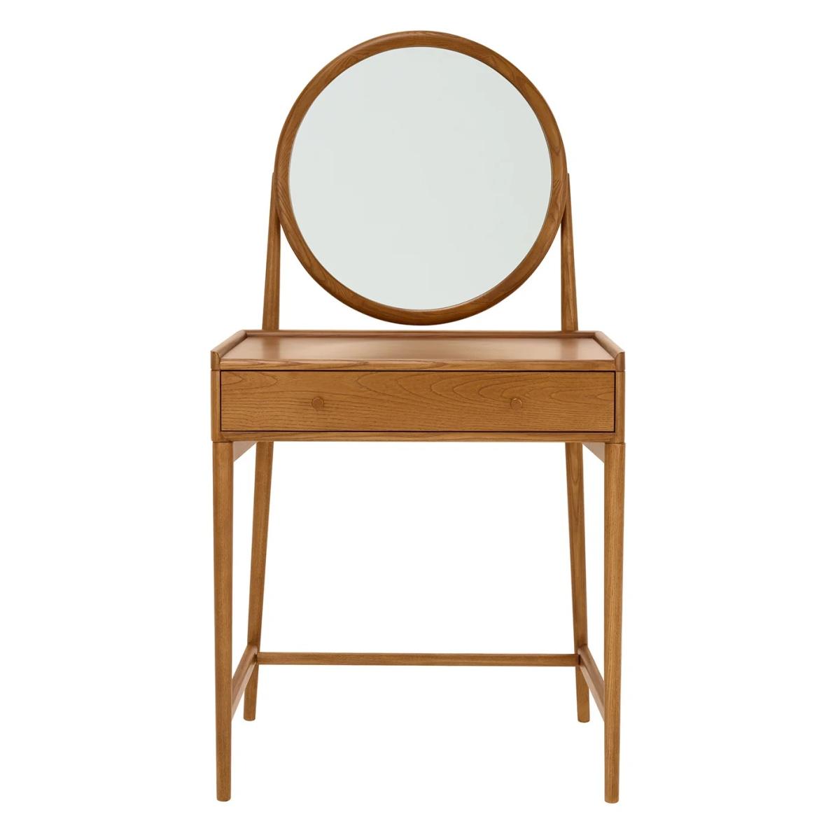 Make a stylish statement in your bedroom with the Salina Dressing Table, featuring a classic round mirror that adds elegance and charm. Designed for practicality, it includes a tray top to prevent items from rolling off the back or sides, and a drawer with a built-in divider for organising smaller essentials. Finished in a timeless vintage finish, this dressing table combines functionality with sophisticated style, perfectly complementing the Salina range. Features: Construction: Solid Ash, Ash Veneers Finishes: Vintage Partial assembly is required Matching pieces available Dimensions Height: 135cm Width: 70cm Depth: 44cm Weight: 18kg Please note: Cabinets and chests over 60cm tall should be fixed to the wall to ensure stability, anti-tip kits with fixtures will be provided. The fixing of these pieces to the wall will not be carried out by our delivery partner. Please follow the product instructions and immediately attach to a wall as stated. Before ordering, we recommend viewing the fabric and wood finish in store and ordering samples to view at home. While we endeavour to ensure that the stated dimensions are as accurate as possible, due to manufacturing tolerances, these may vary slightly. Wood is a natural material, consequently the grain pattern will vary from piece to piece. All screens vary in colour reproduction and whilst every effort has been made to display the colour as accurately as possible it is for guidance only.