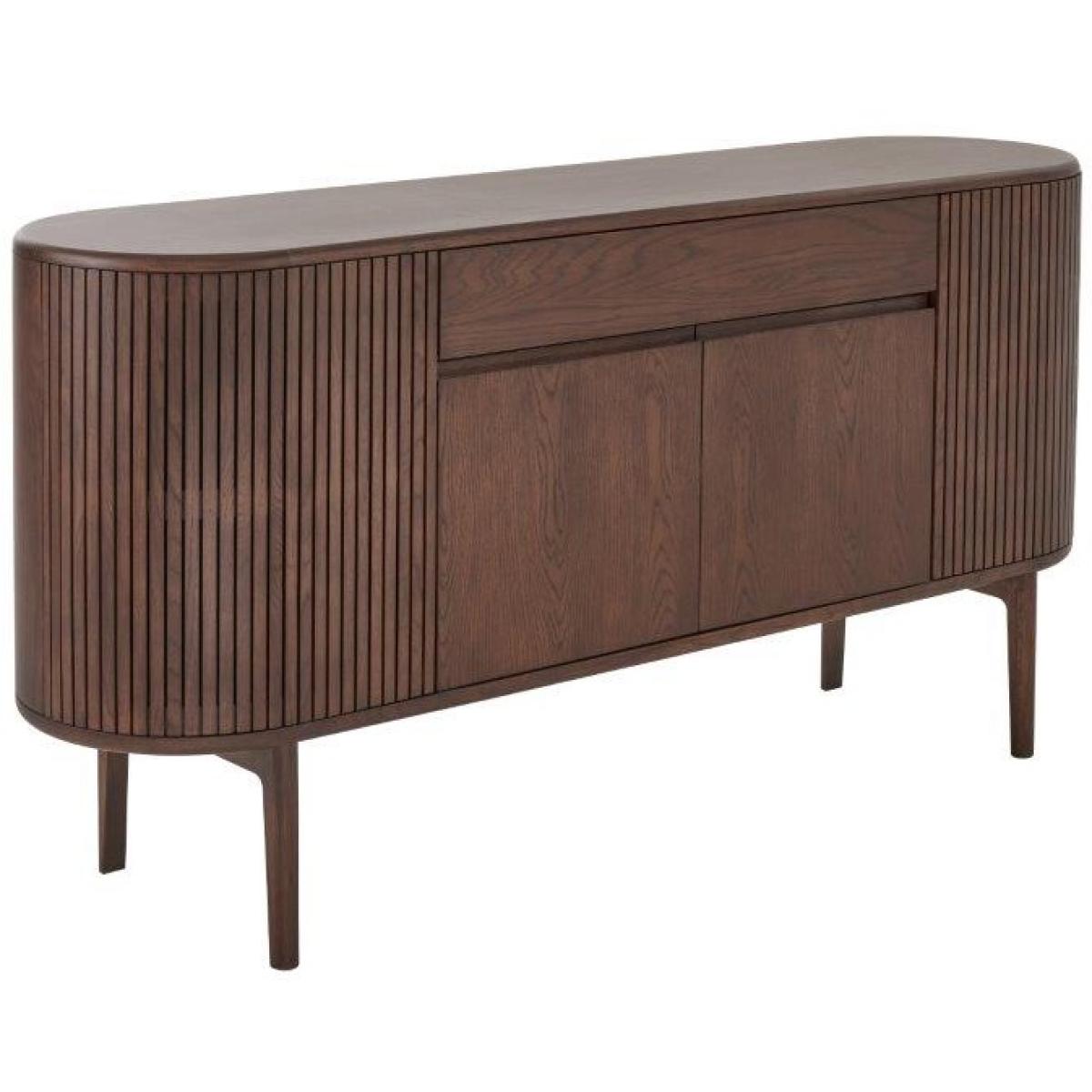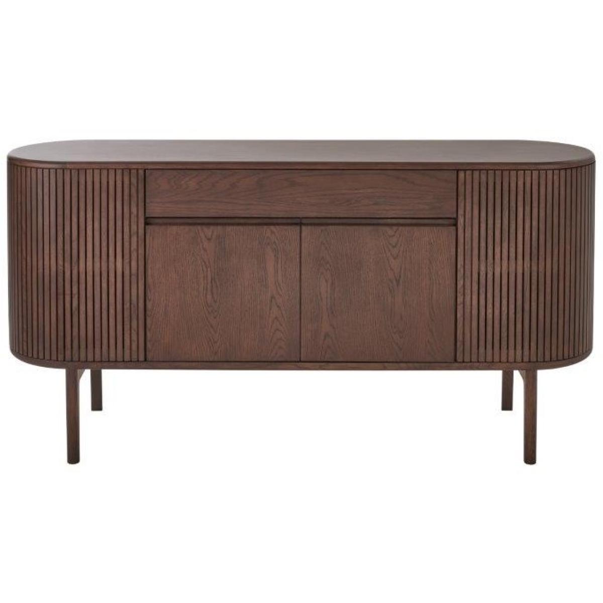 Full of understated beautiful detailing the Siena sideboard is a statement piece. Elegant, curved slatted cupboards frame the cabinet ends with practical push close mechanism and a useful shelf. In the centre a useful drawer and a further cupboard with an adjustable shelf. Available in a choice of pale oak or a rich dark finish. A collection of pieces that are bold yet practical. Smooth geometric shapes make a simple statement and sit along side intricate detail on the cabinet. Features: Construction - Solid Oak, Oak veneers Finishes Available - Natural, Dark Wood Partial assembly required - legs Dimensions - W 160cm x D 40cm x H 80cm Weight - 49.8kg Clearance under - 21cm