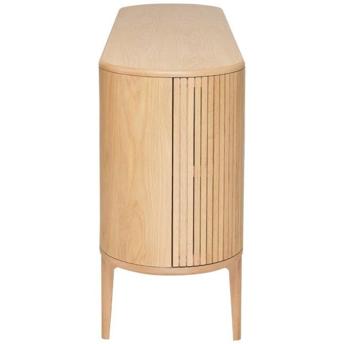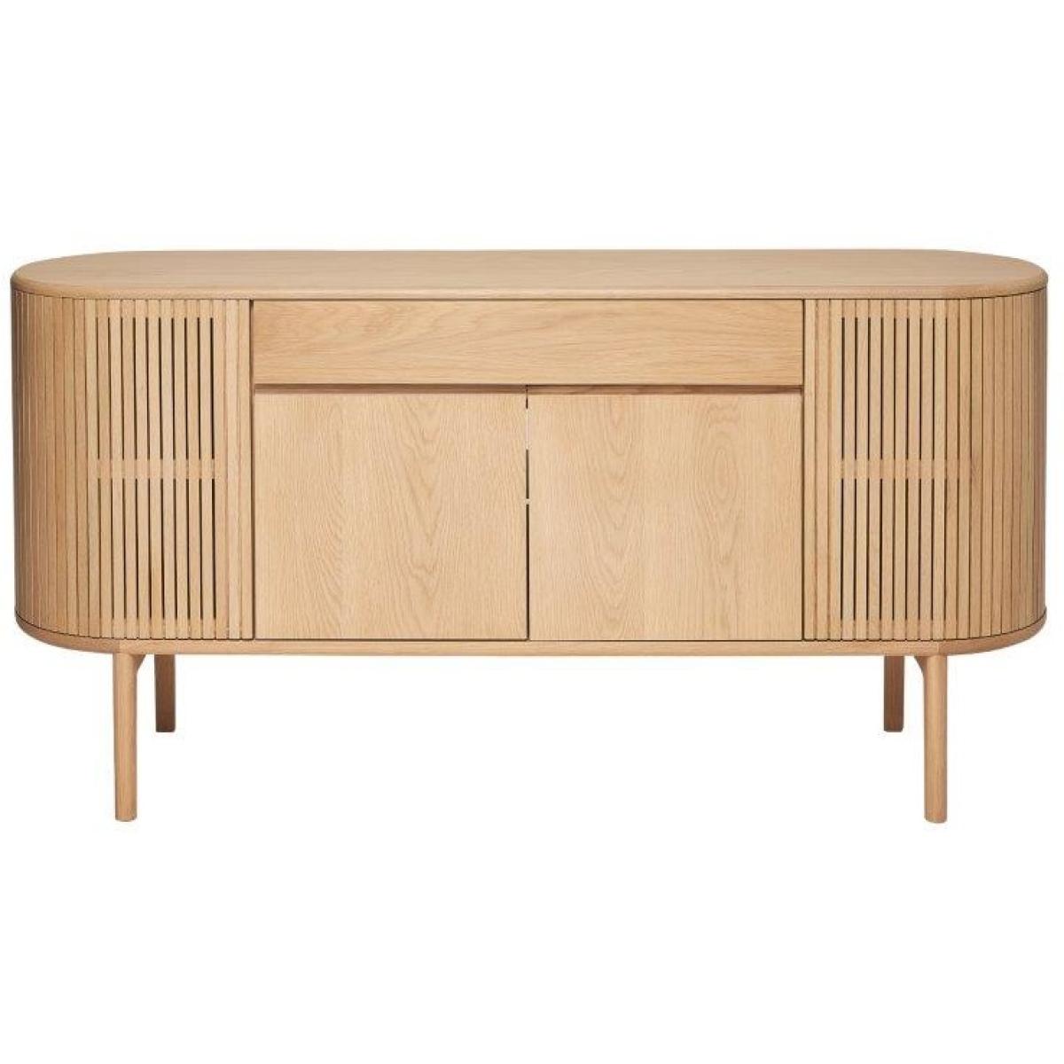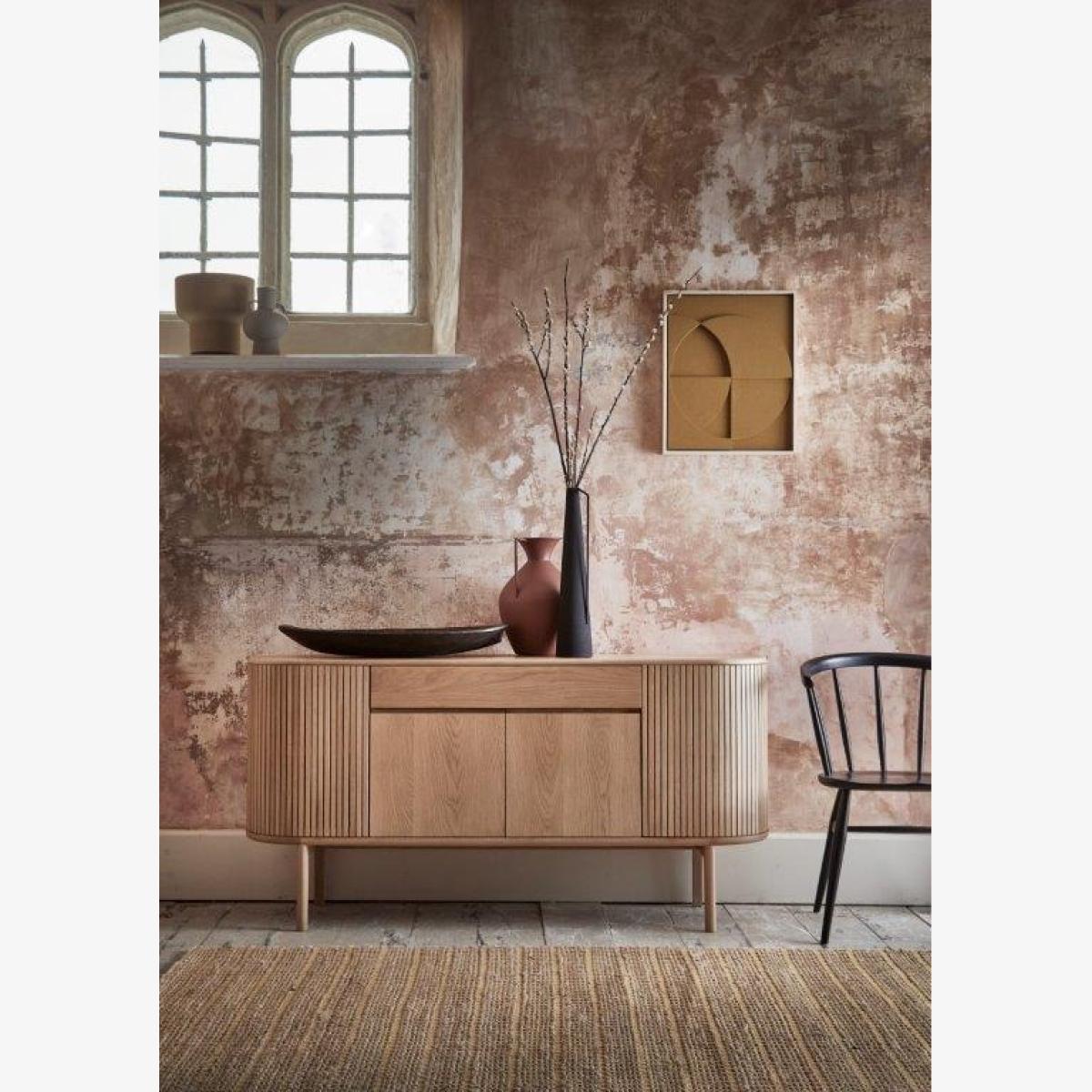 I’m a big fan of the Siena sideboard for its sculptural fluted doors and softly rounded corners - it brings just the right balance of texture and warmth without feeling heavy. The light oak finish works brilliantly in Scandi-inspired schemes, minimalist spaces and even pared-back mid-century looks, while the raised legs give it a sense of lightness that helps smaller rooms breathe. For styling, keep the top relatively clutter-free: three items in varying heights, such as a slim vase, a low ceramic bowl and a sculptural table lamp, give interest without overwhelming the lines. Inside, use its generous storage to hide tableware or media kit, and consider adding woven baskets to organise smaller bits. A simple round mirror or framed print hung off-centre above adds just enough contrast to the linear fluting.