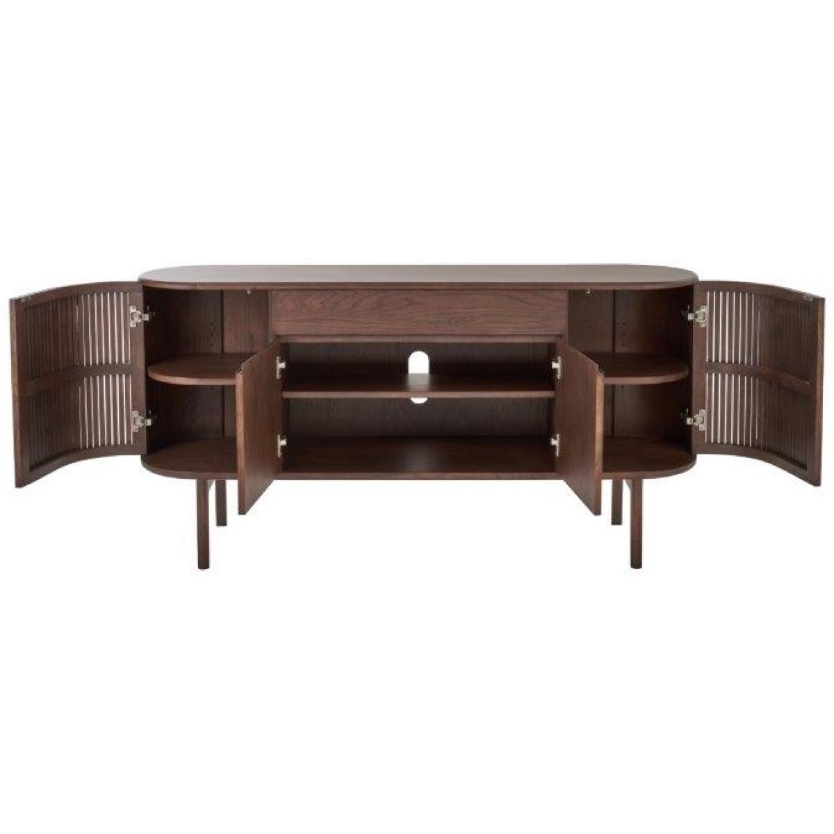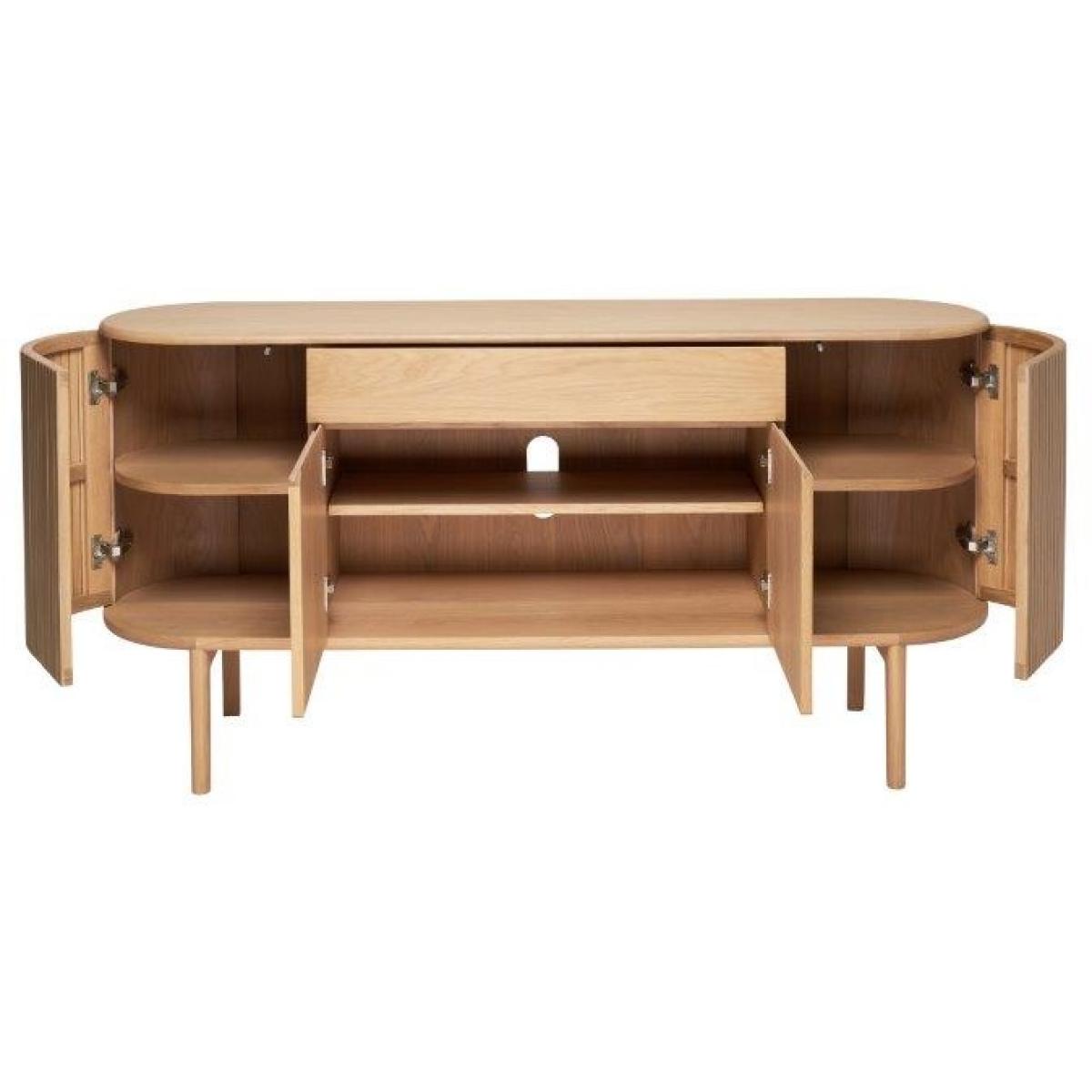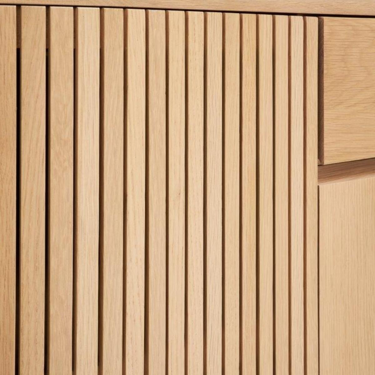 I’m a big fan of the Siena sideboard for its sculptural fluted doors and softly rounded corners - it brings just the right balance of texture and warmth without feeling heavy. The light oak finish works brilliantly in Scandi-inspired schemes, minimalist spaces and even pared-back mid-century looks, while the raised legs give it a sense of lightness that helps smaller rooms breathe. For styling, keep the top relatively clutter-free: three items in varying heights, such as a slim vase, a low ceramic bowl and a sculptural table lamp, give interest without overwhelming the lines. Inside, use its generous storage to hide tableware or media kit, and consider adding woven baskets to organise smaller bits. A simple round mirror or framed print hung off-centre above adds just enough contrast to the linear fluting.