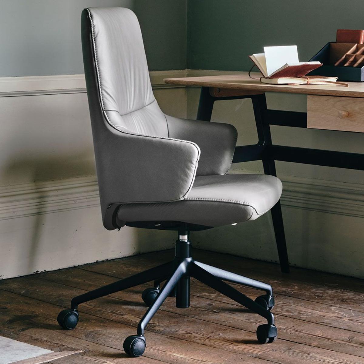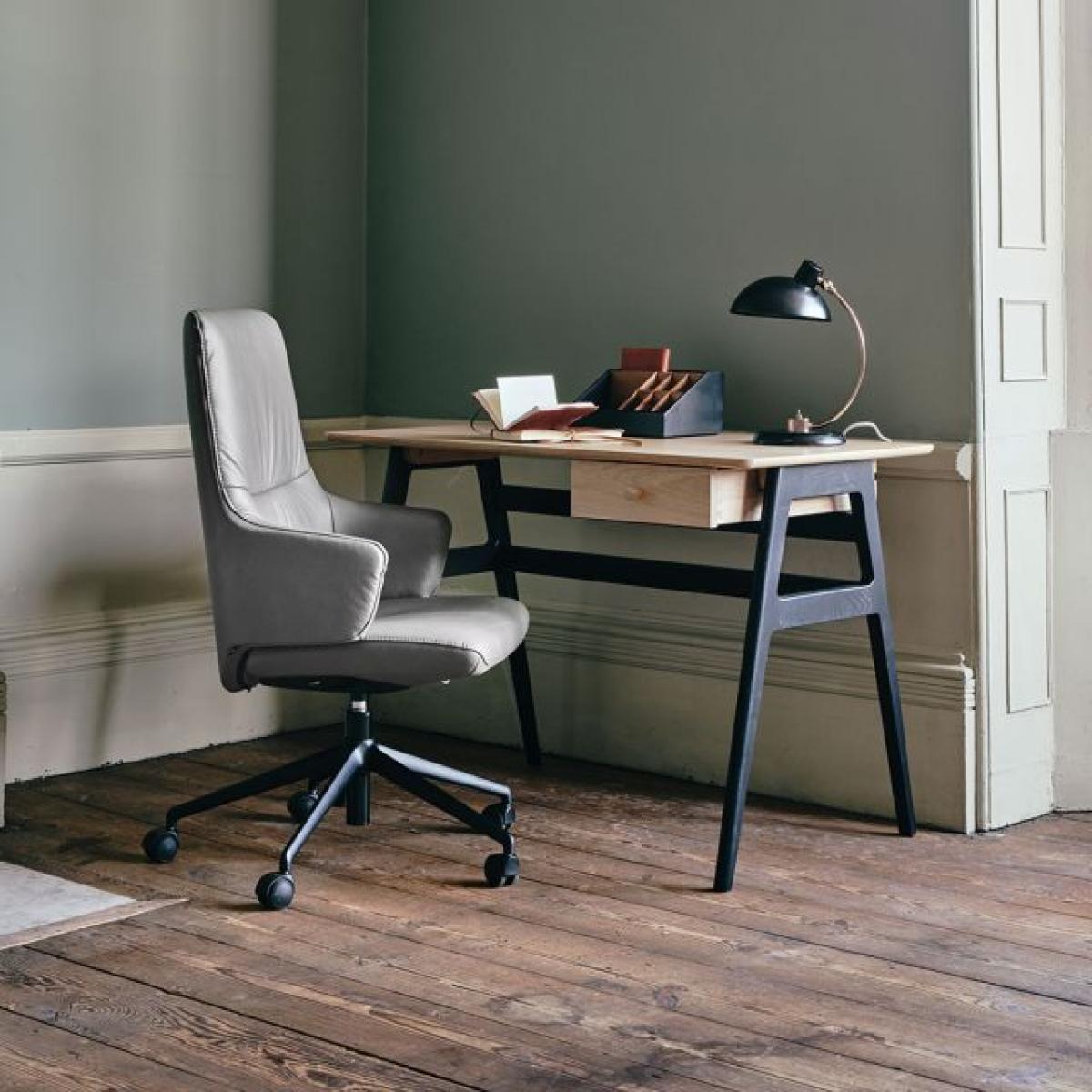 Two legendary brands have joined forces to create this incredible and very limited offer! This office bundle contains a Ballatta Desk from Ercol with black underframe, built from oak solid oak and oak veneers. It's a stylish desk and features all the expert craftsmanship we have all come to expect from the masters at Ercol. The second part of this amazing bundle is the Stressless Mint Office Chair. This model has arms and a black base, and is swathed in a gorgeous Batick leather in Wild Dove. Time to upgrade your home office? We think so!.