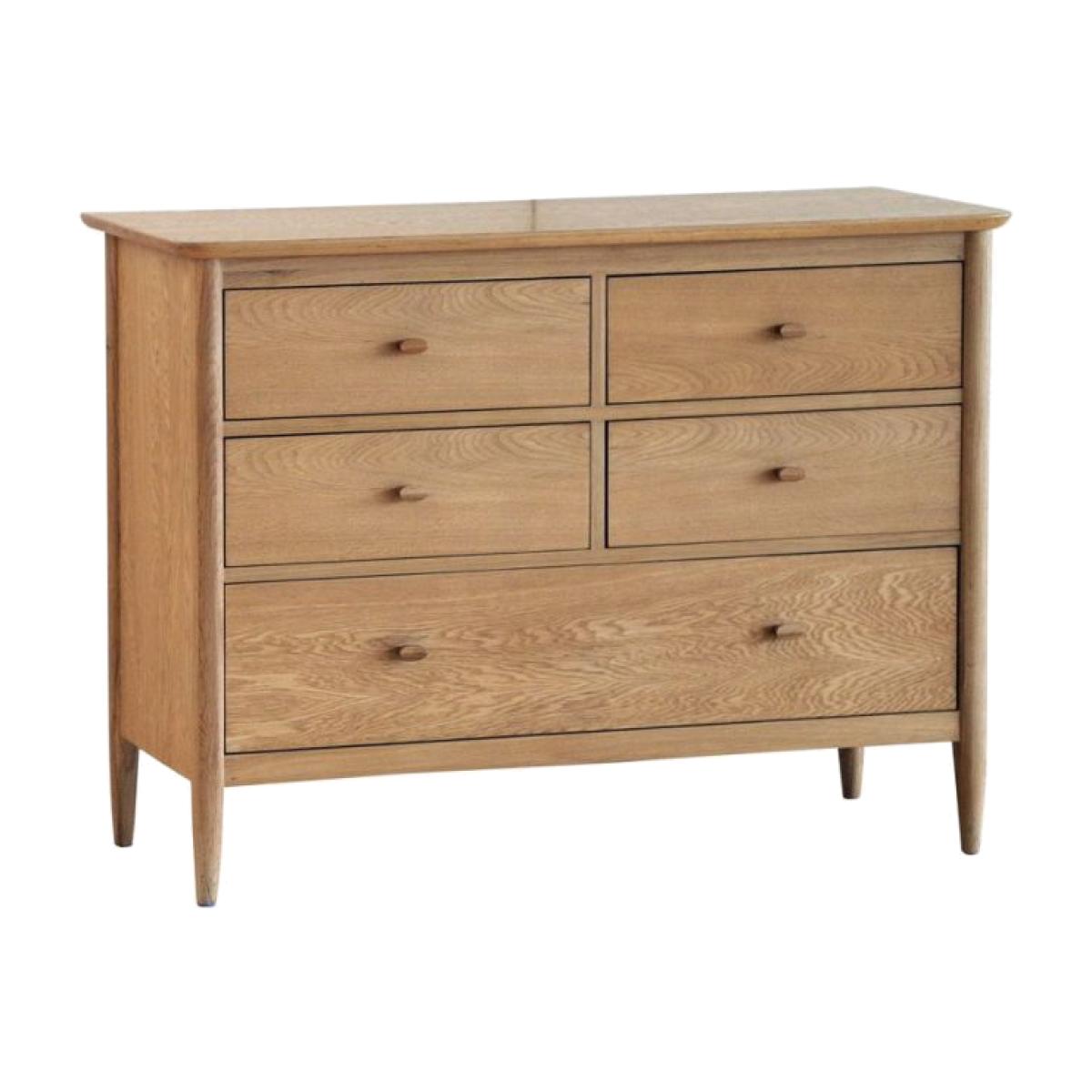 Designed with simplicity and versatility in mind the Ercol Teramo 5 Drawer Wide Chest combines high quality materials with an elegant design to create a must have chest. Influenced by the iconic shaker style the Ercol Teramo 5 Drawer Wide Chest provides deep spacious storage offering ample room for all of your clothes. Featuring the signature tapered legs and double chamfer edges of the Teramo collection this stunning bedside chest is perfect for most bedrooms and will compliment a variety oak pieces beautifully. Ercol Oak Wood Clear Matt Finish Dimensions: 113cm x 47cm x 84cm