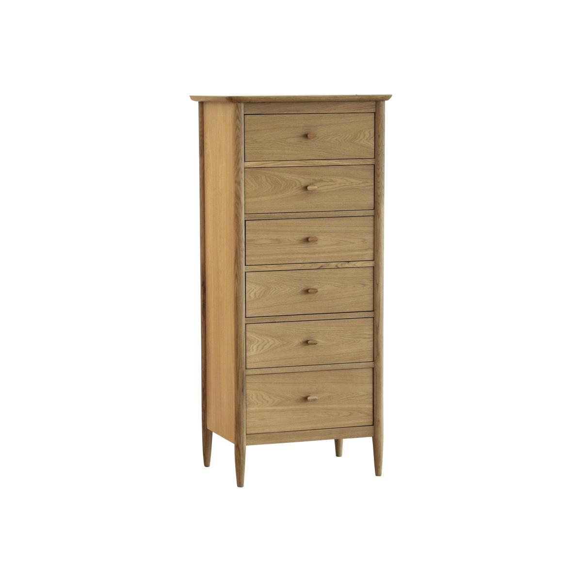 Teramo is a beautifully designed modern bedroom furniture collection crafted from pale oak. It has a simple, understated style that brings a feeling of serenity to any bedroom. Choose an elegant bedstead with pre-sprung wooden slats or a chest of drawers offering flexible bedroom storage. Every piece is finished in a clear matt lacquer that protects the timber and shows off the beauty of the wood. Tall and narrow, the ercol Teramo 6 drawer tall chest is the perfect piece for the smaller bedroom. It offers plenty of storage yet takes up minimal floor space. And it’s strikingly stylish too, featuring so many of ercol’s signature design elements. Beautifully handcrafted from solid pale oak and oak veneers, hand matched for grain and colour so you’re assured of a flawless finish, this useful chest of drawers has six deep drawers and showcases classic ercol style – turned and tapered legs, curved overhanging top, and oval drawer handle. It’s built to last too, thanks to the well-constructed dovetail jointed drawers and hardwearing matt lacquer finish. Part of the ercol Teramo range, this clean-lined and functional chest of drawers is designed to complement the range’s other bedroom pieces – from larger chests of drawers to a bedside cabinet to a bedframe. The range also includes a wide selection of living and dining room furniture. WARNING!. Furniture can tip over unexpectedly and cause injury. This item shall be fixed to a wall using the anti-tip kit provided with the furniture. Be sure to use the correct wall fixings suitable for the walls in your home.