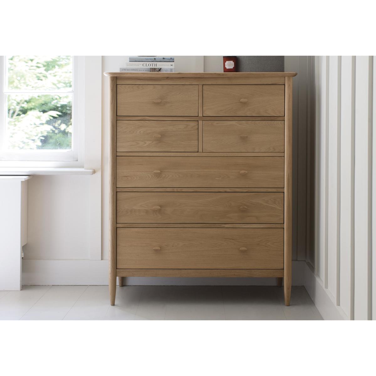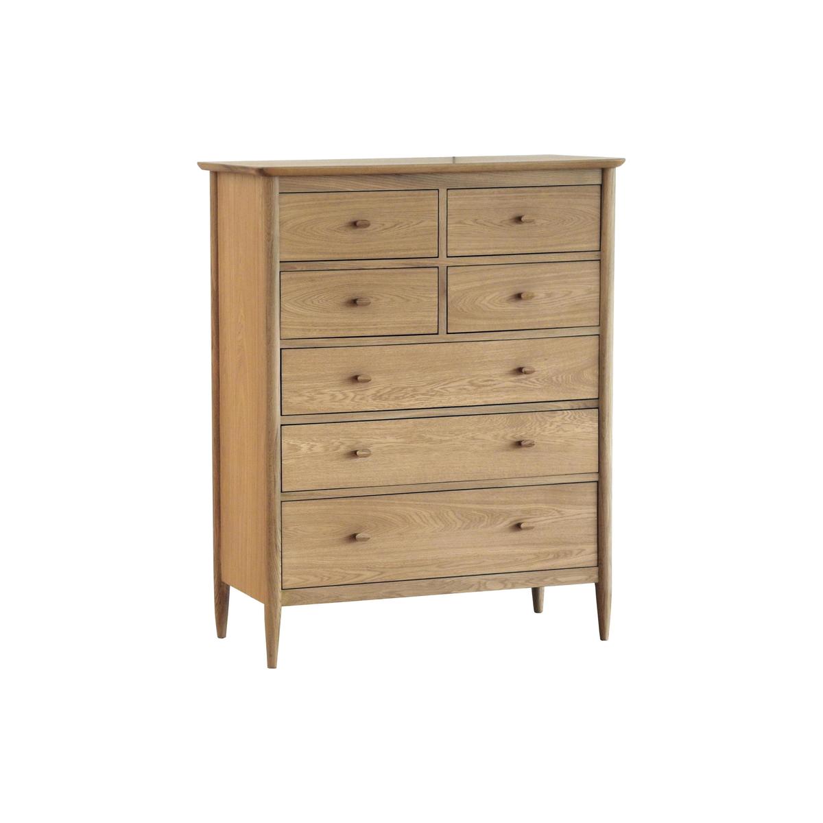 Teramo is a beautifully designed modern bedroom furniture collection crafted from pale oak. It has a simple, understated style that brings a feeling of serenity to any bedroom. Choose an elegant bedstead with pre-sprung wooden slats or a chest of drawers offering flexible bedroom storage. Every piece is finished in a clear matt lacquer that protects the timber and shows off the beauty of the wood. An elegant answer to all your bedroom storage needs, the ercol Teramo 7 drawer tall chest combines iconic ercol style with the company’s commitment to beautiful craftsmanship and functional design. This exceptionally spacious chest of drawers has four side-by-side smaller drawers and, below, three wider drawers that are perfect for sweaters and bulkier items. Handcrafted from solid pale oak and oak veneers that have been hand matched for grain and colour, this piece has a smooth and flawless finish, and features stylish touches like a curved top, tapered turned legs, and distinctive oval drawer handles. Craftsmanship is evident in the dovetail jointed drawers. The ercol Teramo 7 drawer tall wide chest is part of the ercol Teramo bedroom range. If you love its classic ercol style, take a look at the ercol Teramo living and dining ranges which offer a selection of storage pieces, occasional tables and two style of dining table. WARNING!. Furniture can tip over unexpectedly and cause injury. This item shall be fixed to a wall using the anti-tip kit provided with the furniture. Be sure to use the correct wall fixings suitable for the walls in your home.