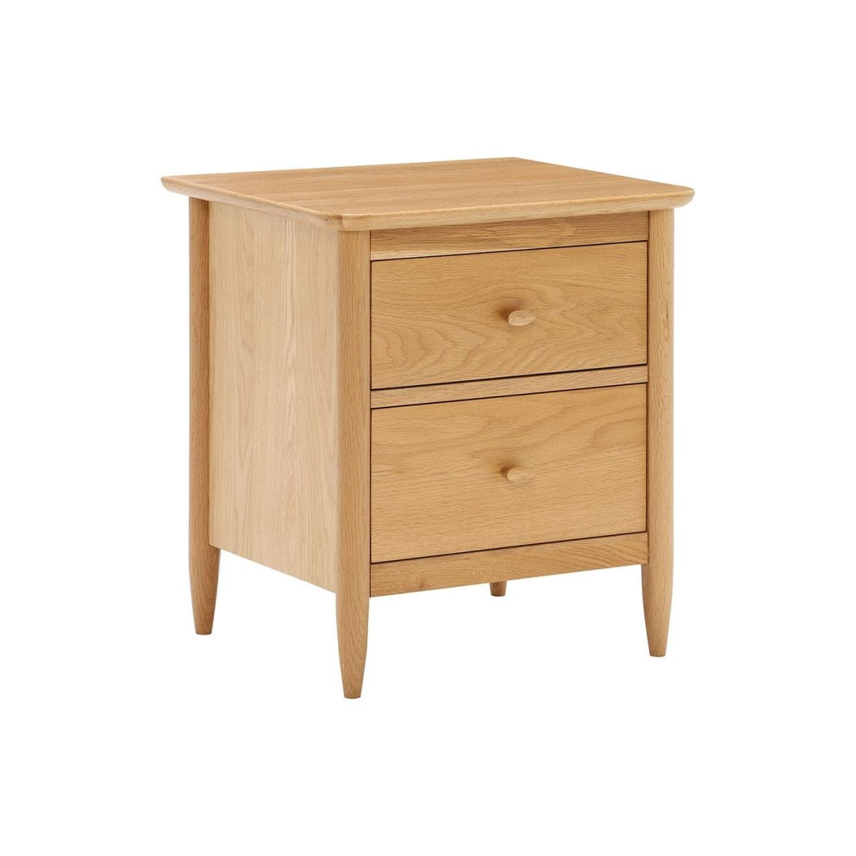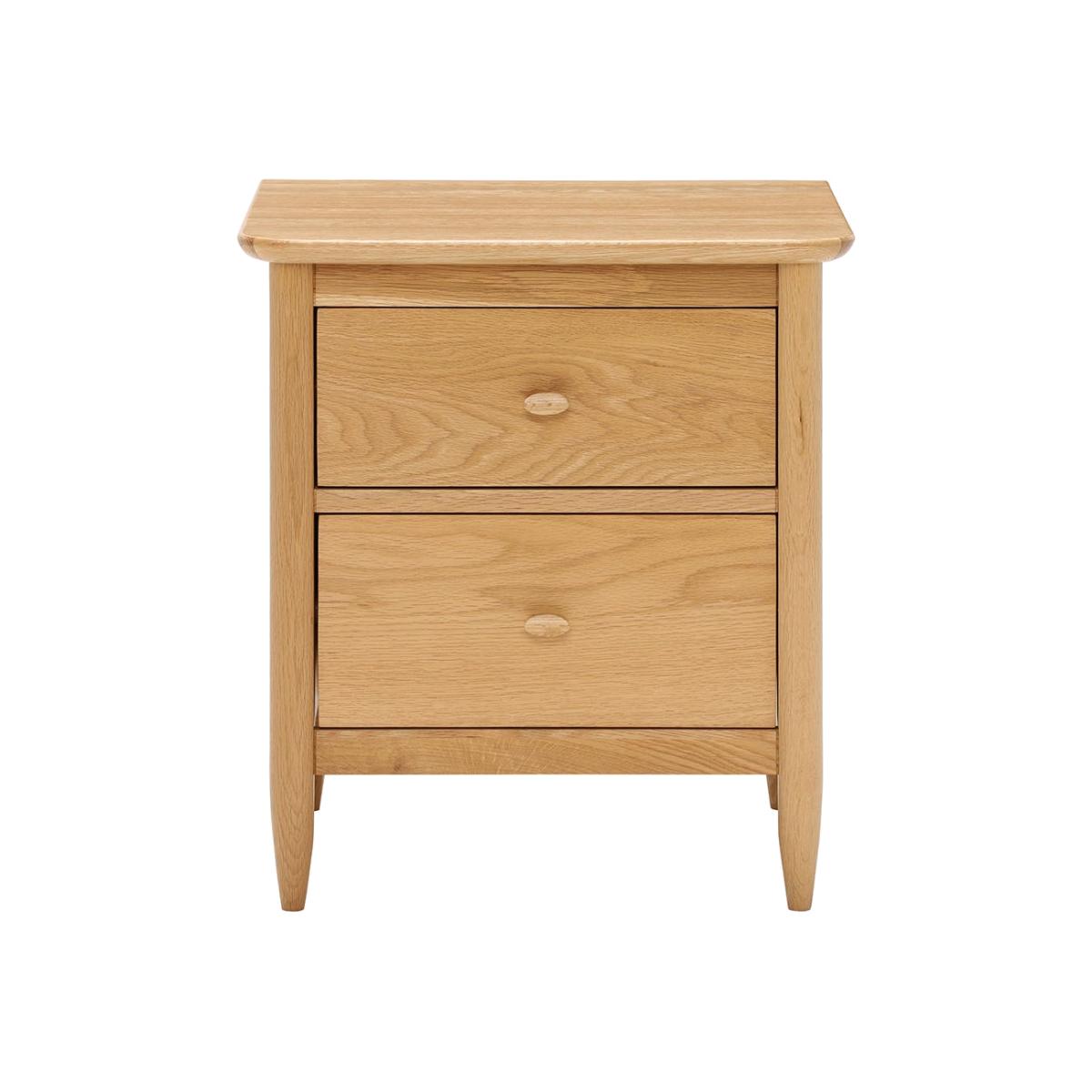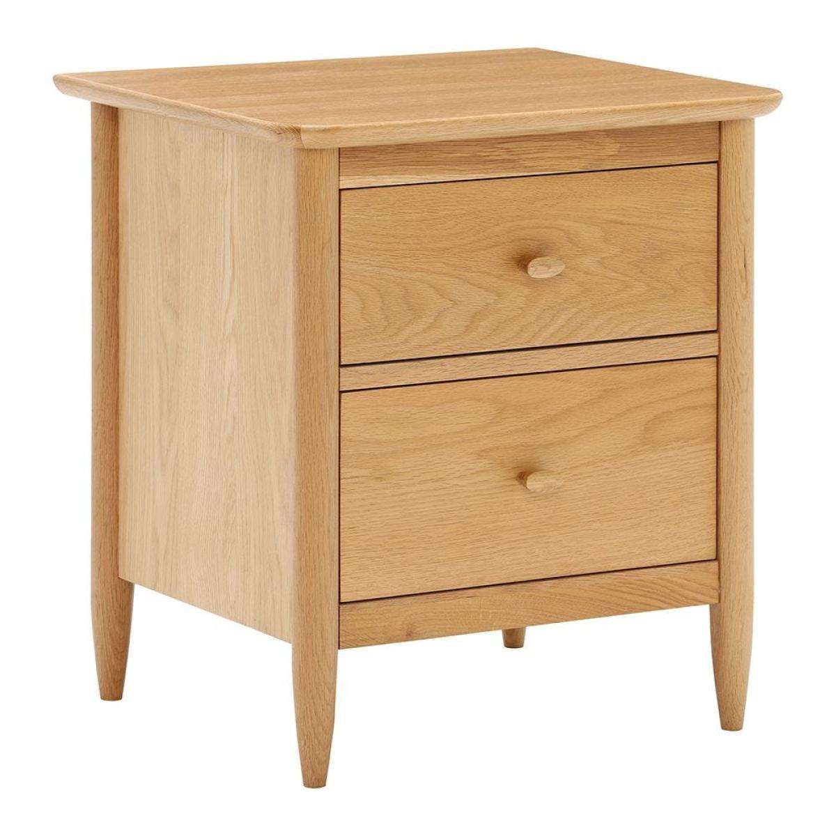 The Teramo bedroom range from Ercol is a series of timeless pieces that combine Shaker-style craftsmanship with elegant woodwork. Crafted from solid and veneered pale oak, this bedside cabinet features two spacious drawers for storage, each finished with double-chamfered oval handles. Tapered turned legs and gently curved edges complete the design, creating a defined silhouette that sits well in both modern and traditional schemes. The cabinet is finished in a clear matt lacquer, making a real feature of the natural oak.