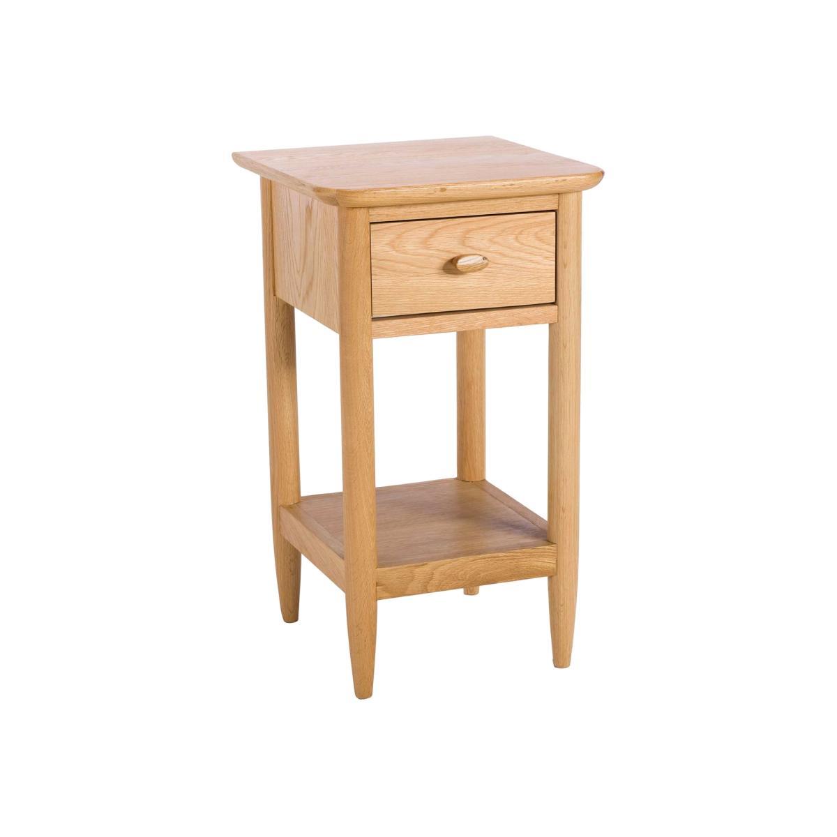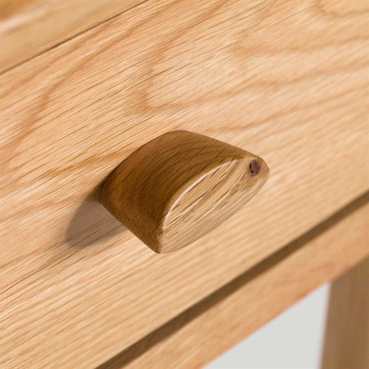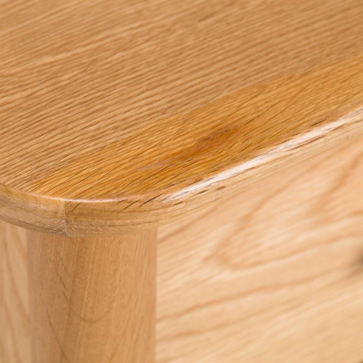 Design. This compact side table; made from beautiful pale oak, has a clear matt lacquer that provides extra protection and highlights the oaks natural beauty. Featuring beautiful turned legs and curved overhanging surfaces, this classic design is flexible in its use. Perfect as a lamp table in your living room or even at your bedside. Beneath its stunning top sits a handy drawer finished with dovetail joints and the distinctive oval handle that is characteristically Teramo.
