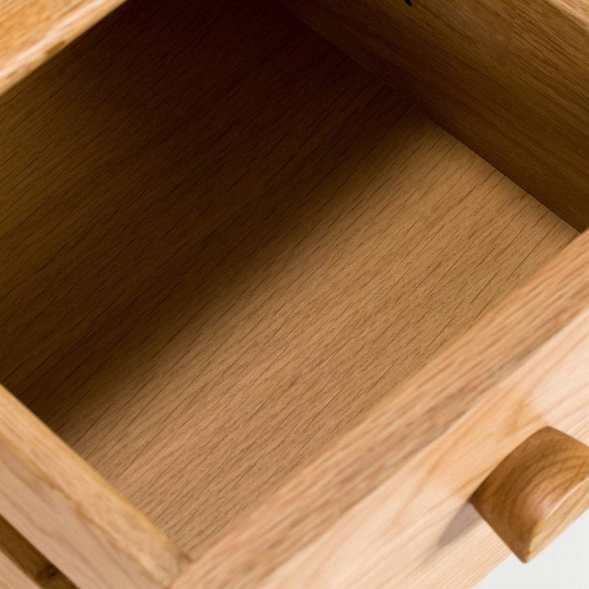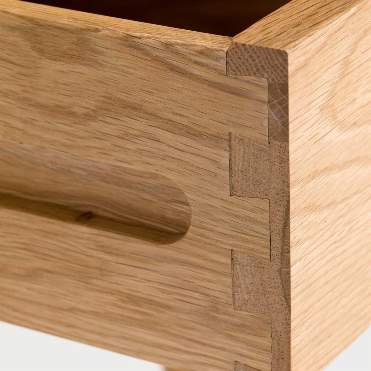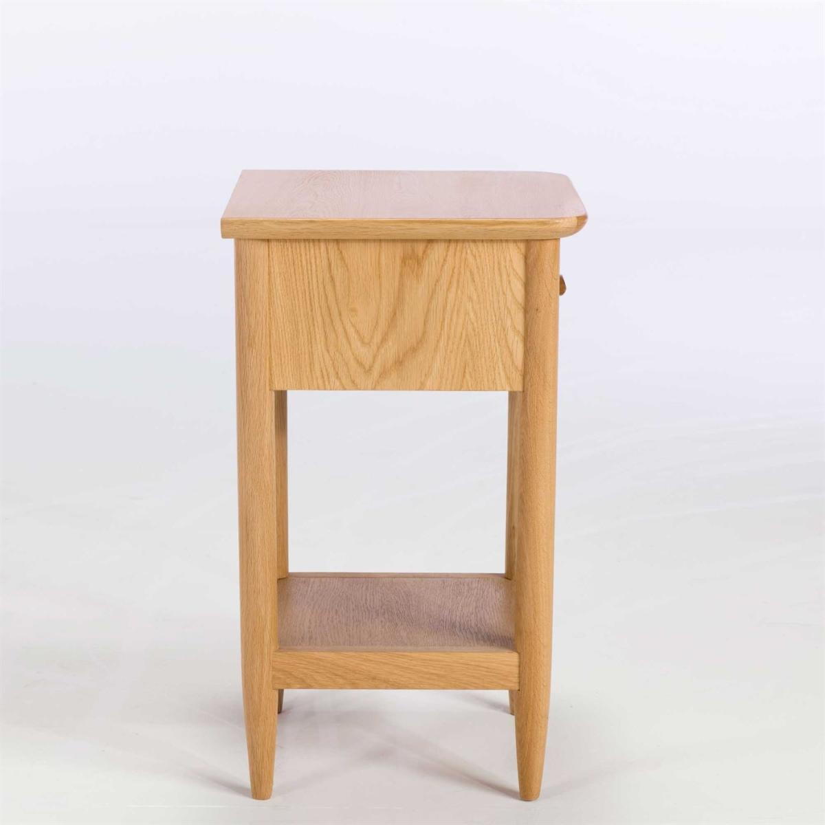 Design. This compact side table; made from beautiful pale oak, has a clear matt lacquer that provides extra protection and highlights the oaks natural beauty. Featuring beautiful turned legs and curved overhanging surfaces, this classic design is flexible in its use. Perfect as a lamp table in your living room or even at your bedside. Beneath its stunning top sits a handy drawer finished with dovetail joints and the distinctive oval handle that is characteristically Teramo.