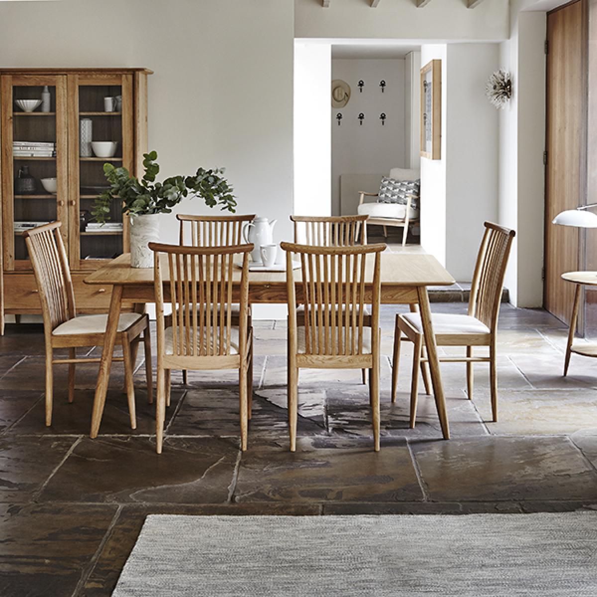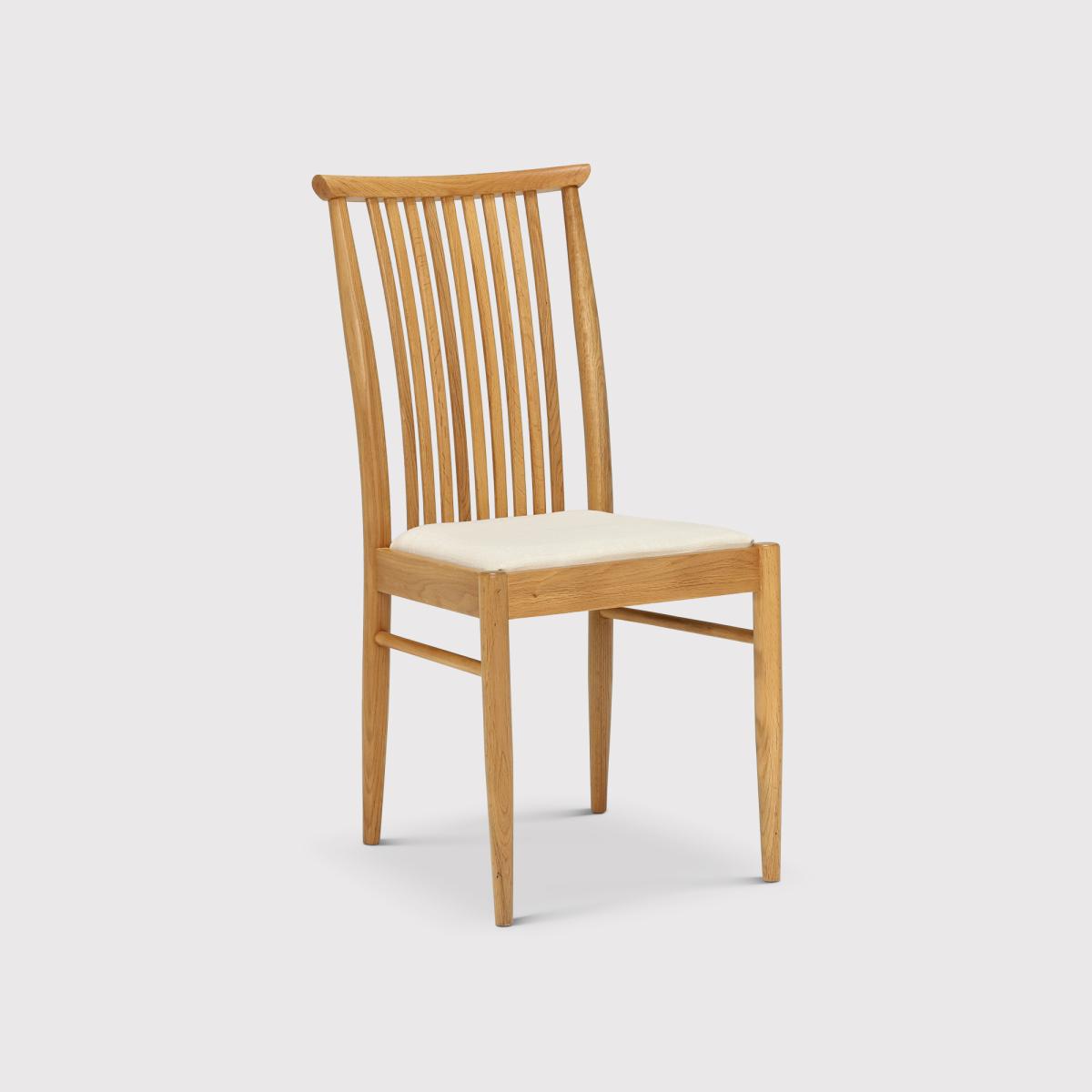 The Teramo dining chair in pale oak is timelessly elegant. Slightly more formal in style than the Kitchen chair, its back has nine slim slats curving inwards to support the back. The cushioned seat is upholstered in a soft yet durable cream fabric. The thoughtful detailing is characteristically ercol.