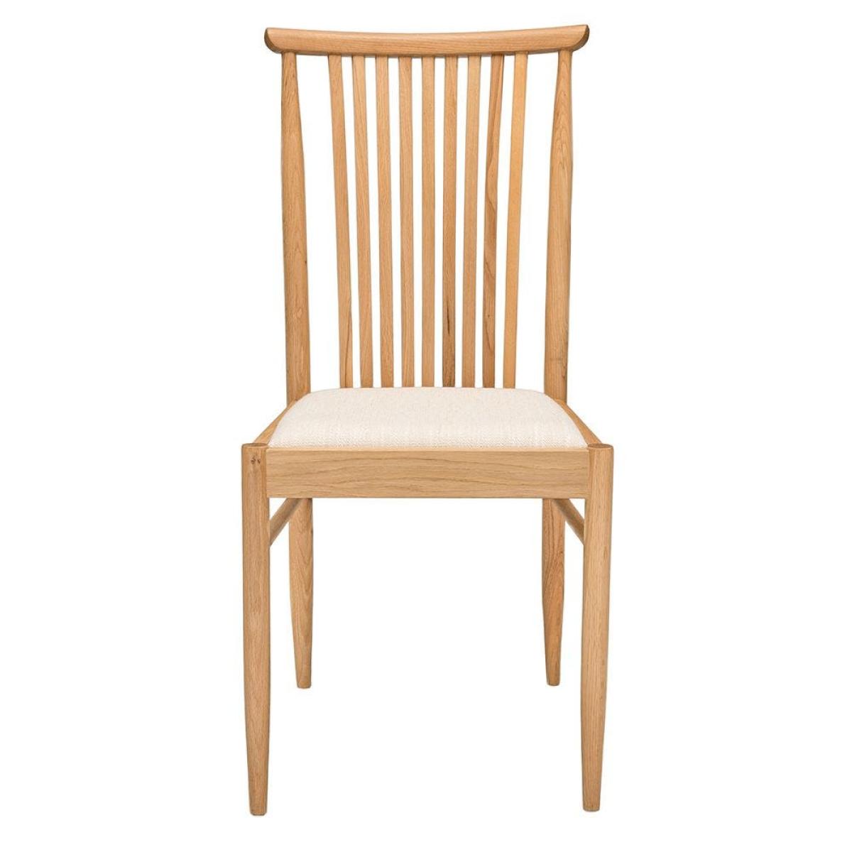 The Teramo dining range from Ercol is a collection of Shaker-inspired pieces that bring understated elegance to dinner times. Crafted from pale oak, this formal dining chair features a cushioned seat upholstered in cream and nine slim slats curving inwards to support the back. These thoughtful details are characteristically Ercol, making this chair the perfect companion to their Teramo dining tables.