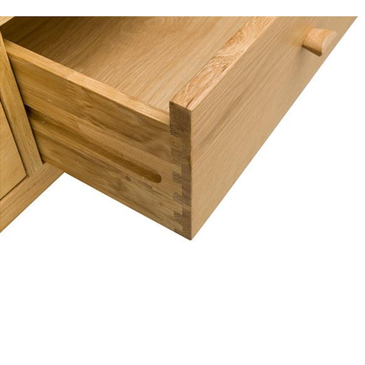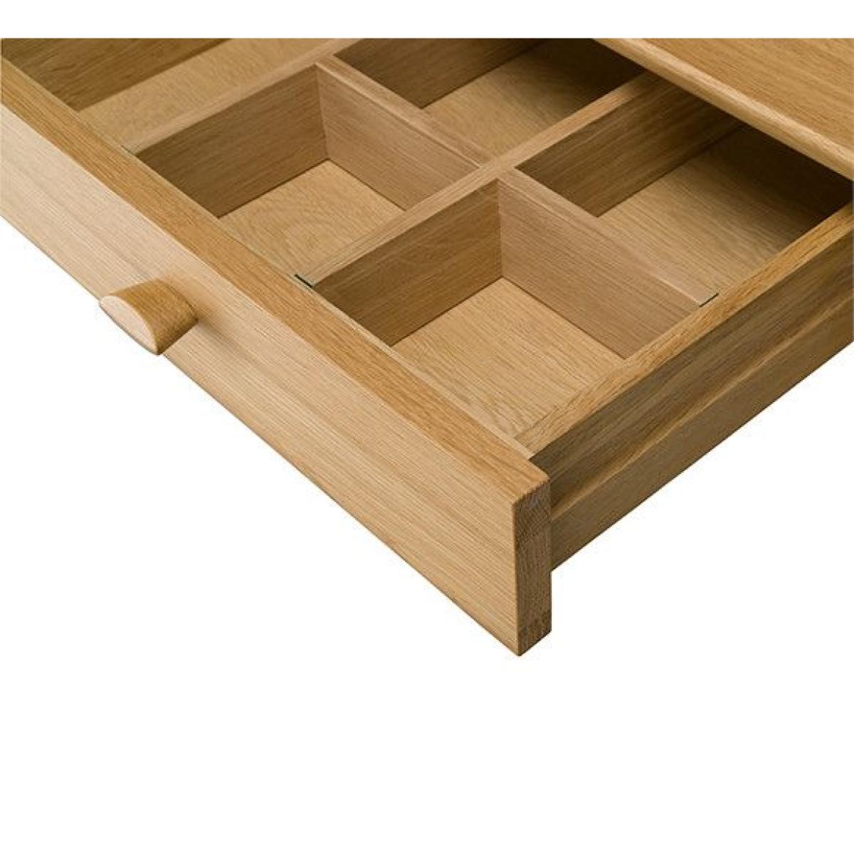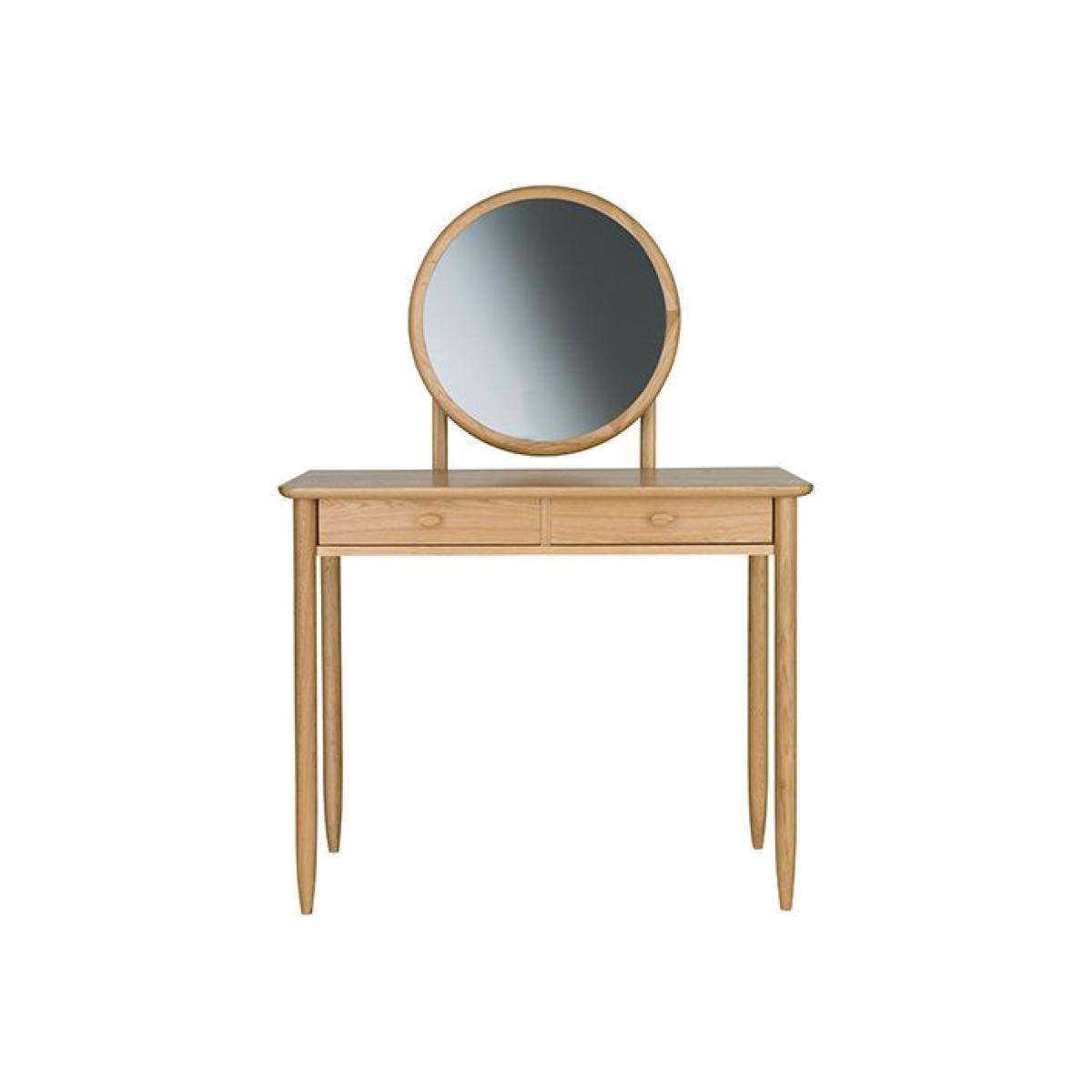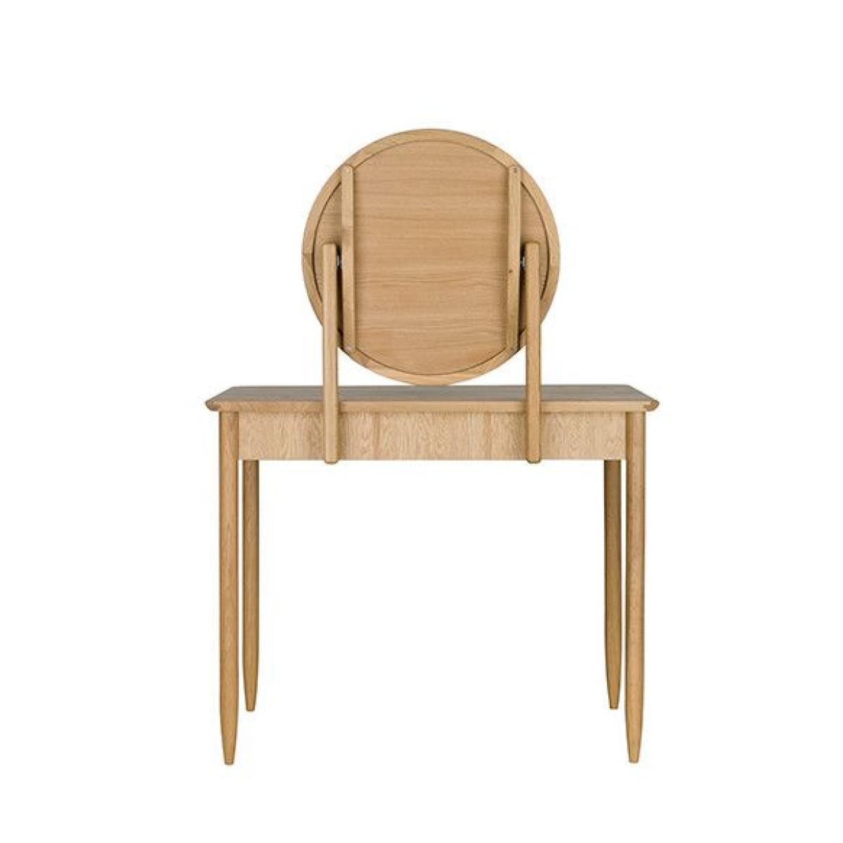 This dressing table and mirror is a statement addition to the Teramo bedroom range. Following the signature tapered turned legs and curved detailing, creating a shaker look synonymous with the collection. A stunning oak framed circular mirror creates design appeal whilst the two vanity drawers offer plenty of space to store beauty and jewellery treasures, cosmetics and toiletries. The double chamfered edges on the oval drawer handles create a defined and modern profile that are tactile to use. The Teramo collection is finished in clear matt lacquer, providing protection whilst emphasising the natural beauty of the oak. W 98cm D 50cm H 139cm. Oak and Oak veneers. Country of origin China & Turkey Wood finishes and colour samples are shown for guidance only as screen colours may vary. We would recommend ordering a sample in your chosen finish. However, wood is a natural material and varies in colour, grain and structure.