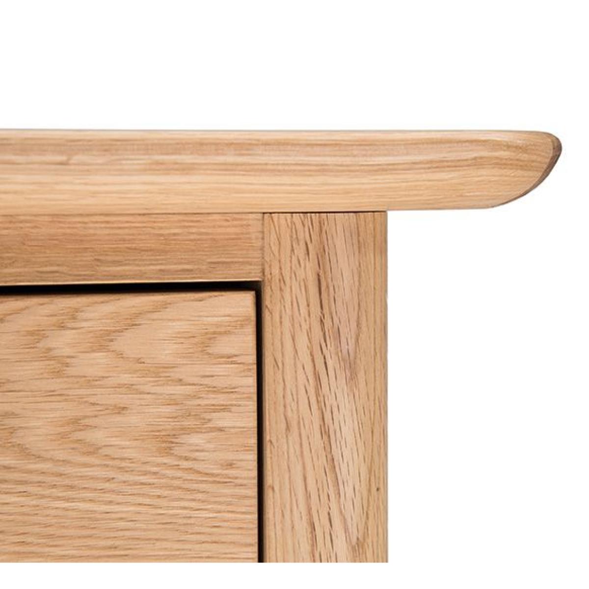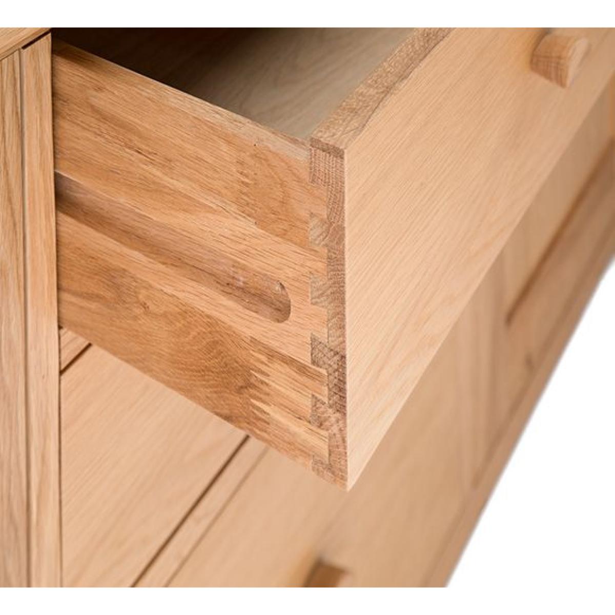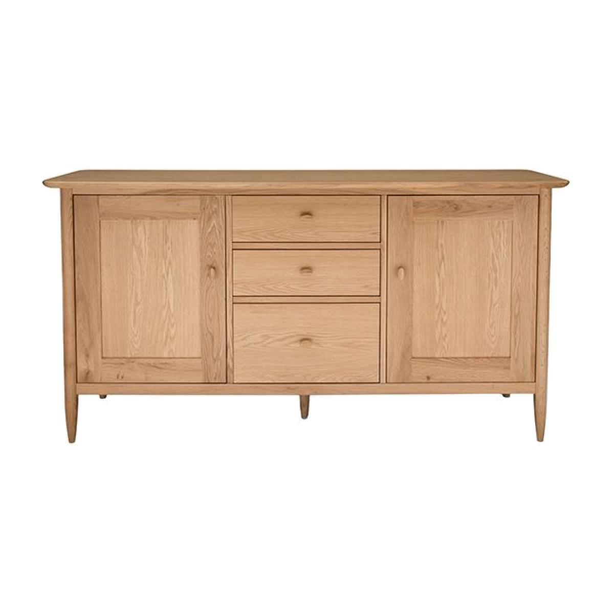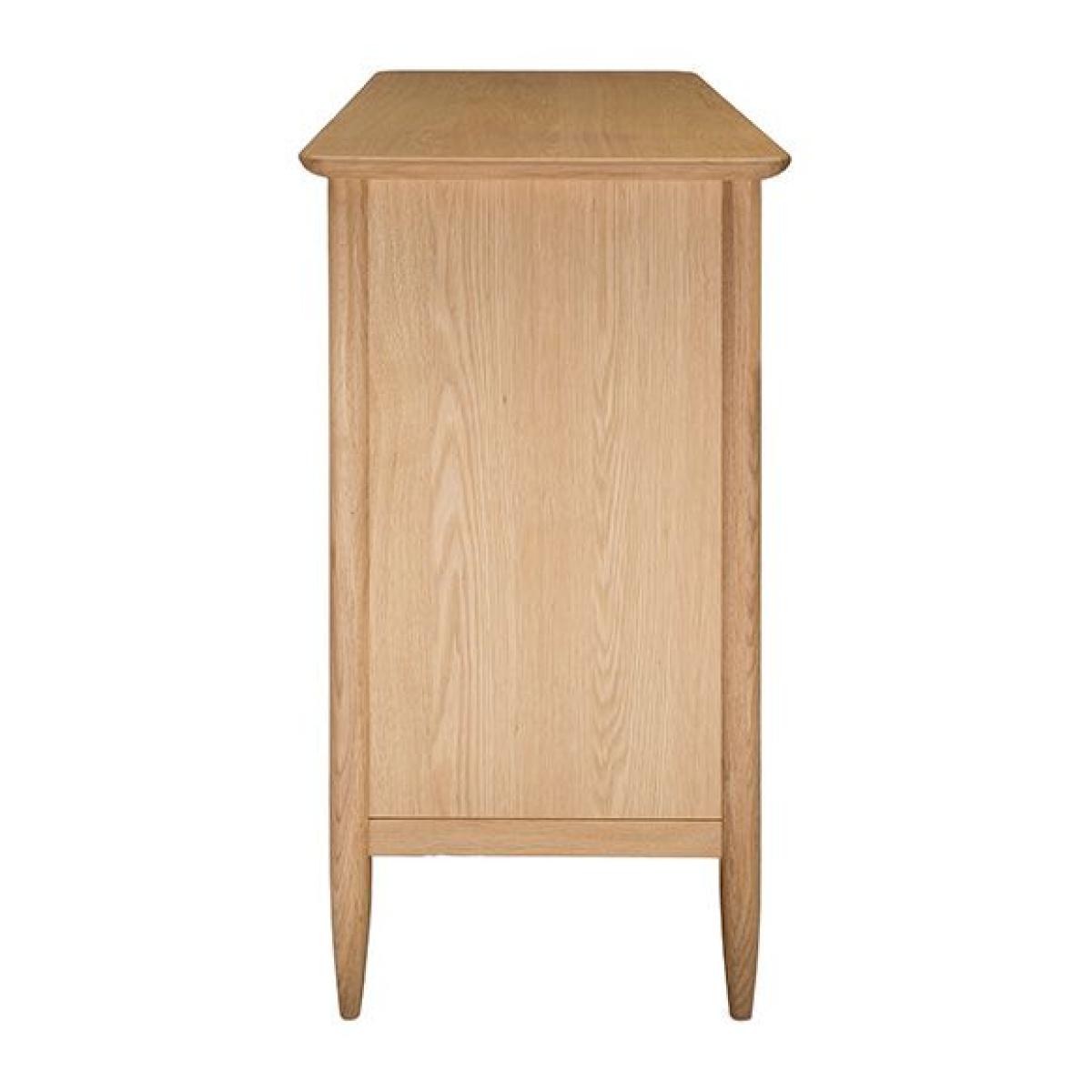 The Teramo large sideboard in pale oak is timelessly elegant, inspired by the simplicity of Shaker style yet incorporating some traditional elements such as dovetail jointed drawers and an overhanging top. There is a cupboard on each side, each with a single deep adjustable shelf inside. Between the cupboards are three drawers, with the lowest drawer slightly deeper. This contemporary yet classic wooden sideboard has distinctive oval handles and elegantly turned legs, design touches that are characteristically ercol. W 157cm D 45cm H 80cm. Oak & Oak veneers. Country of origin China & Turkey. Fully assembled. Wood finishes and colour samples are shown for guidance only as screen colours may vary. We would recommend ordering a sample in your chosen finish. However, wood is a natural material and varies in colour, grain and structure.